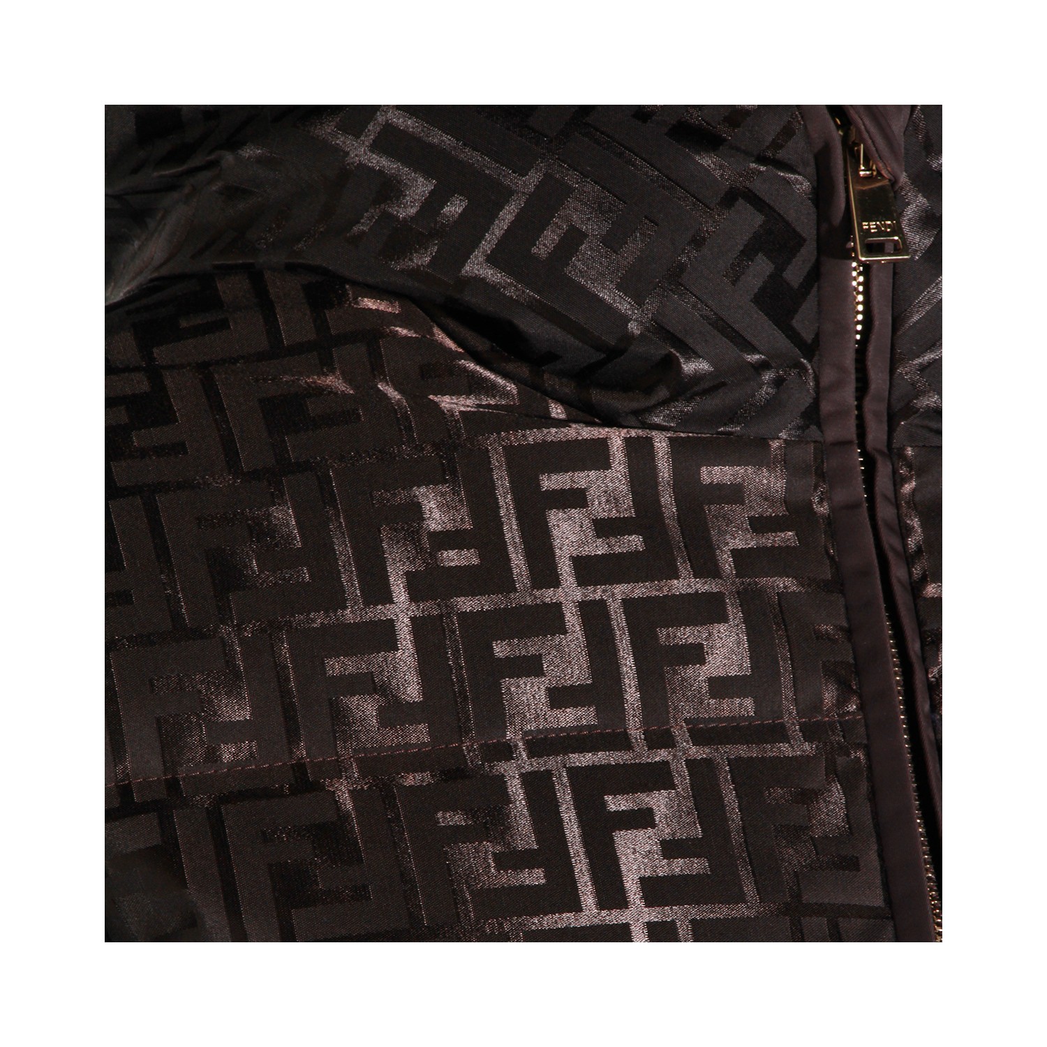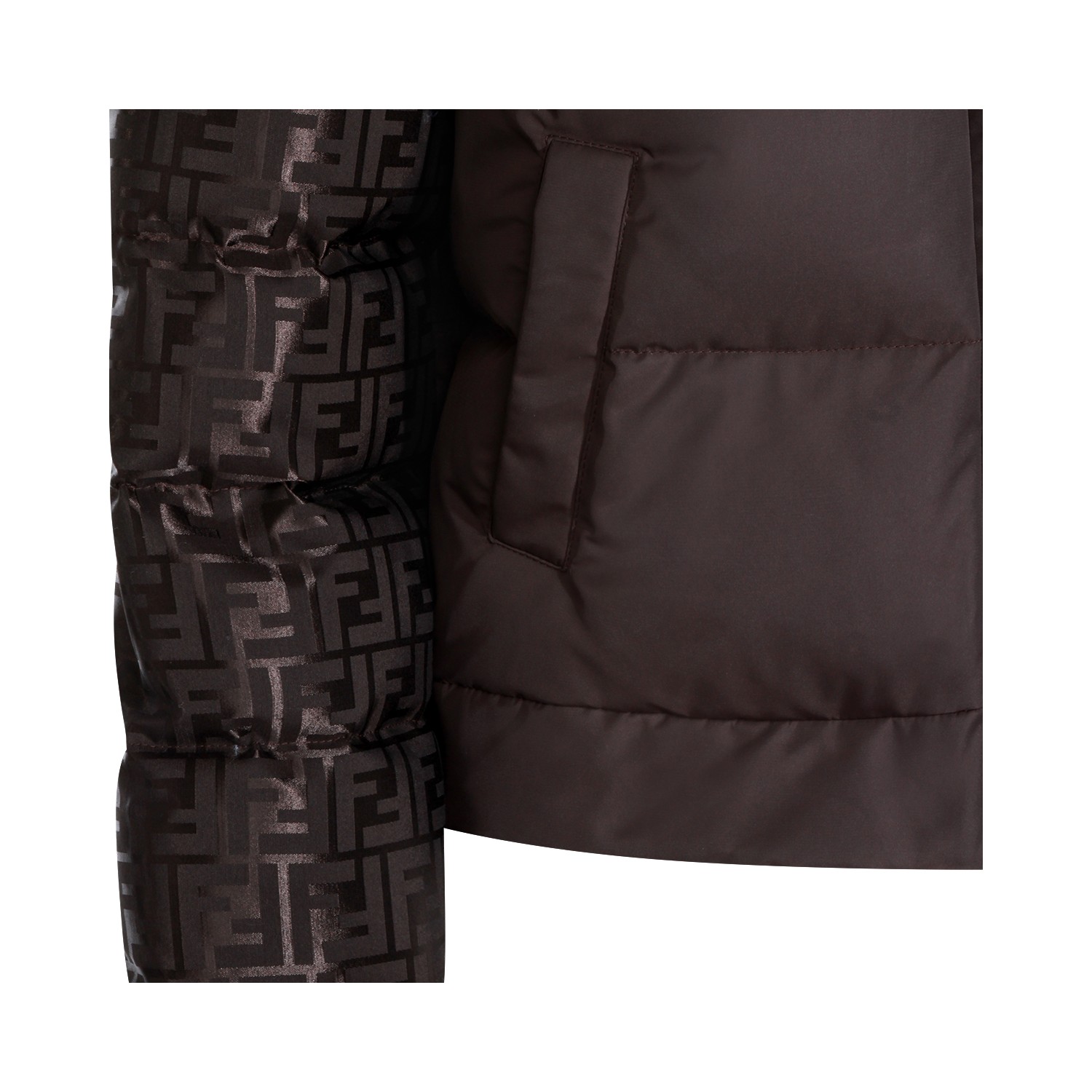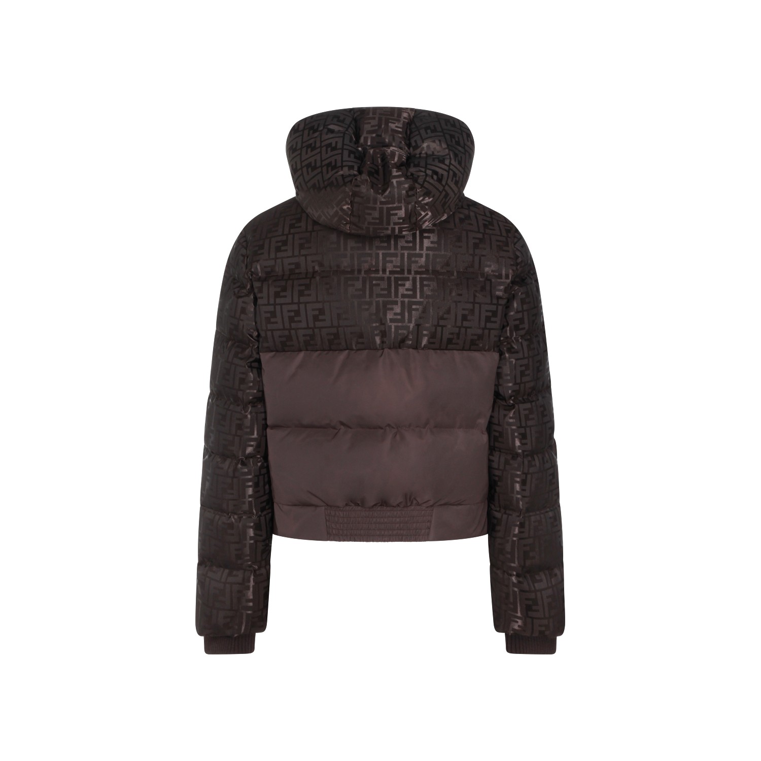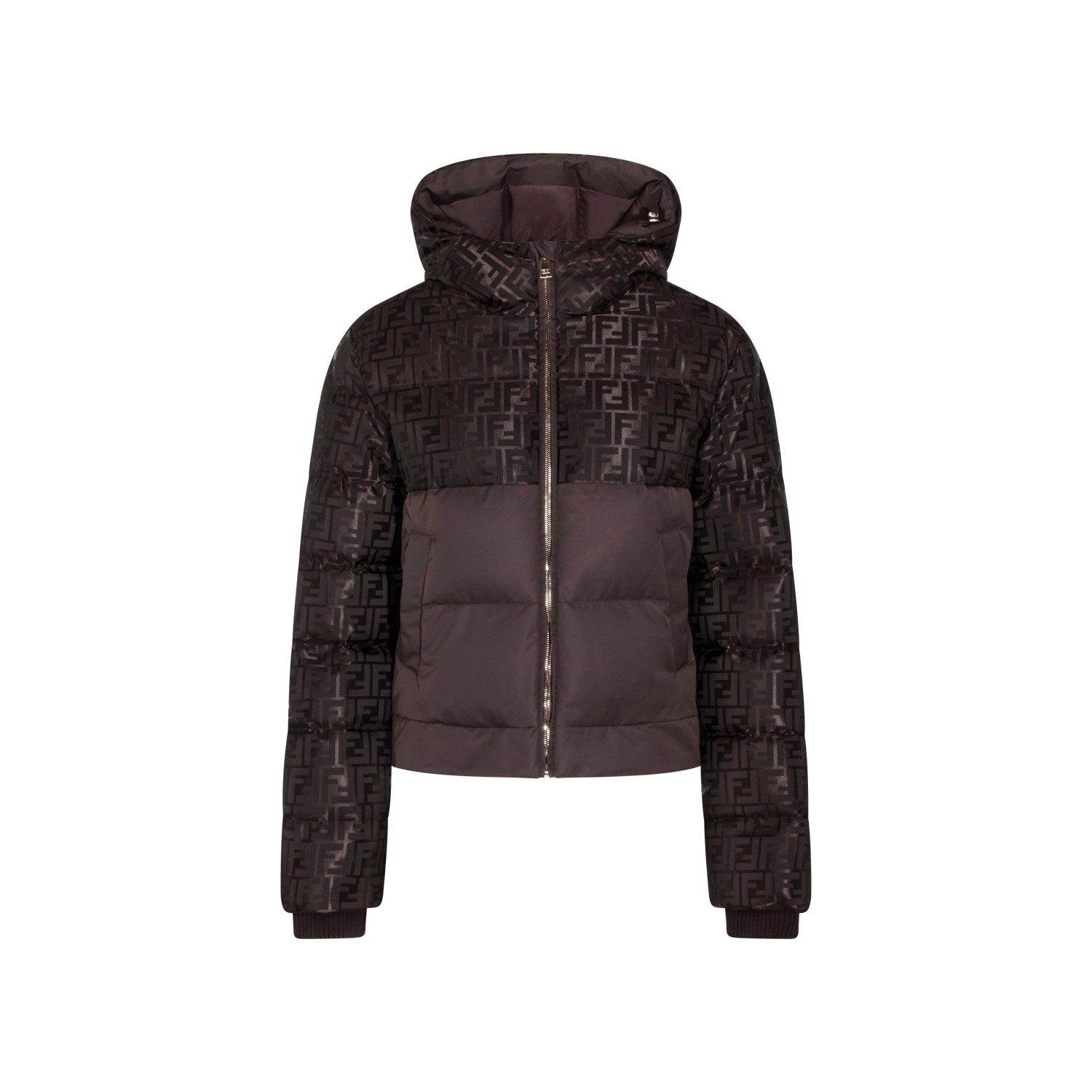 Brown down jacket from Fendi featuring hood, long sleeves, FF logo texture, zip fastening, padded, elasticated cuffs and regular vestibility.