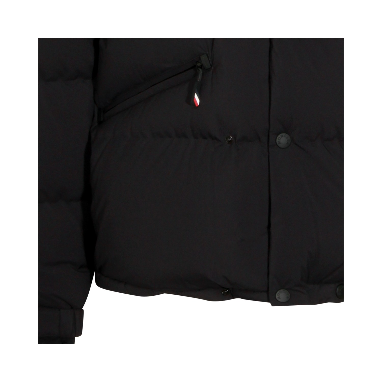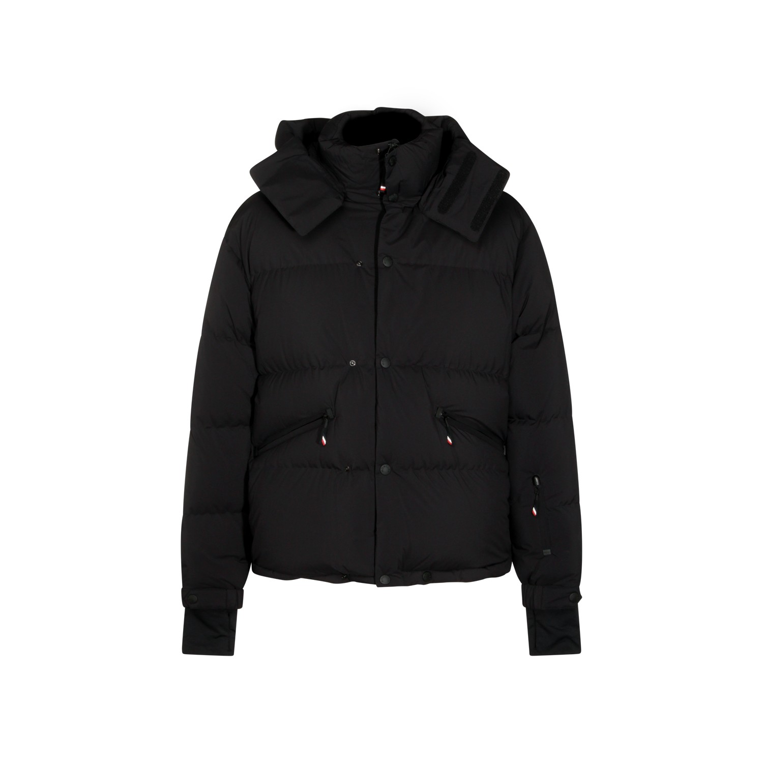 Black Coraia down jacket from Moncler Grenoble featuring high collar, removable hood, padded, long sleeves, frontal closure, elasticated cuffs and pockets.