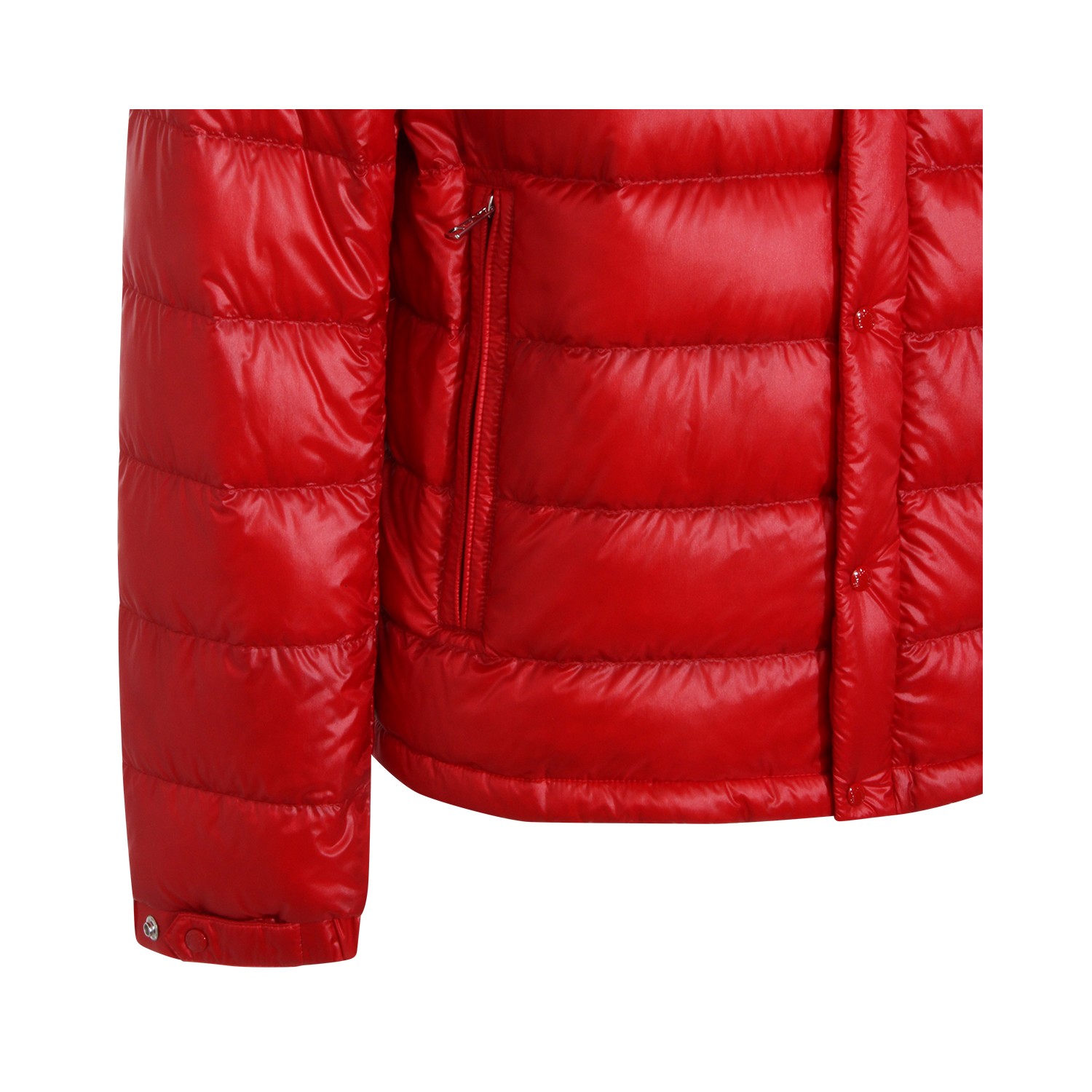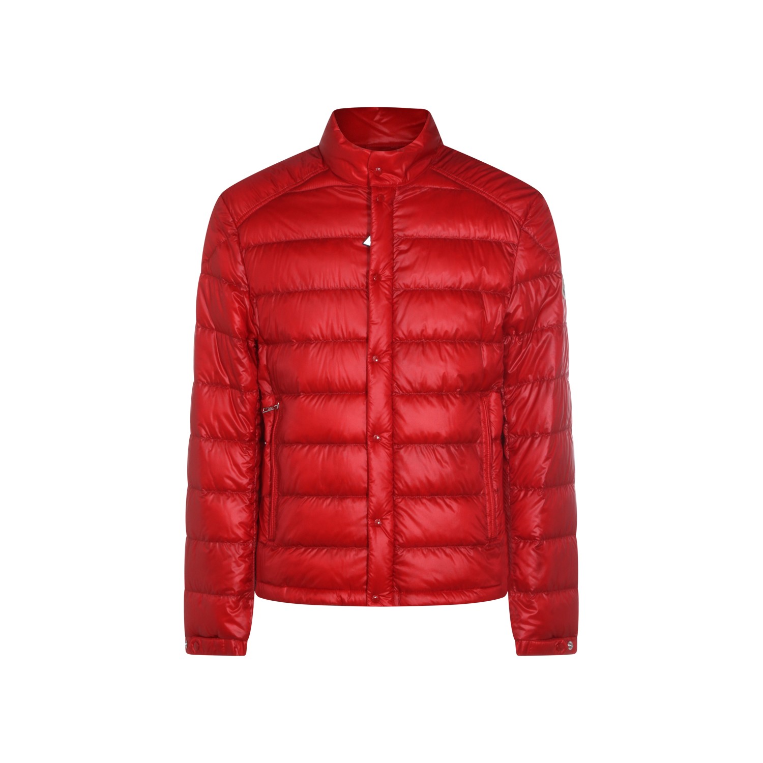 Red down jacket from Moncler featuring long sleeves, buttons fastening, pockets, logo patch and regular vestibility.