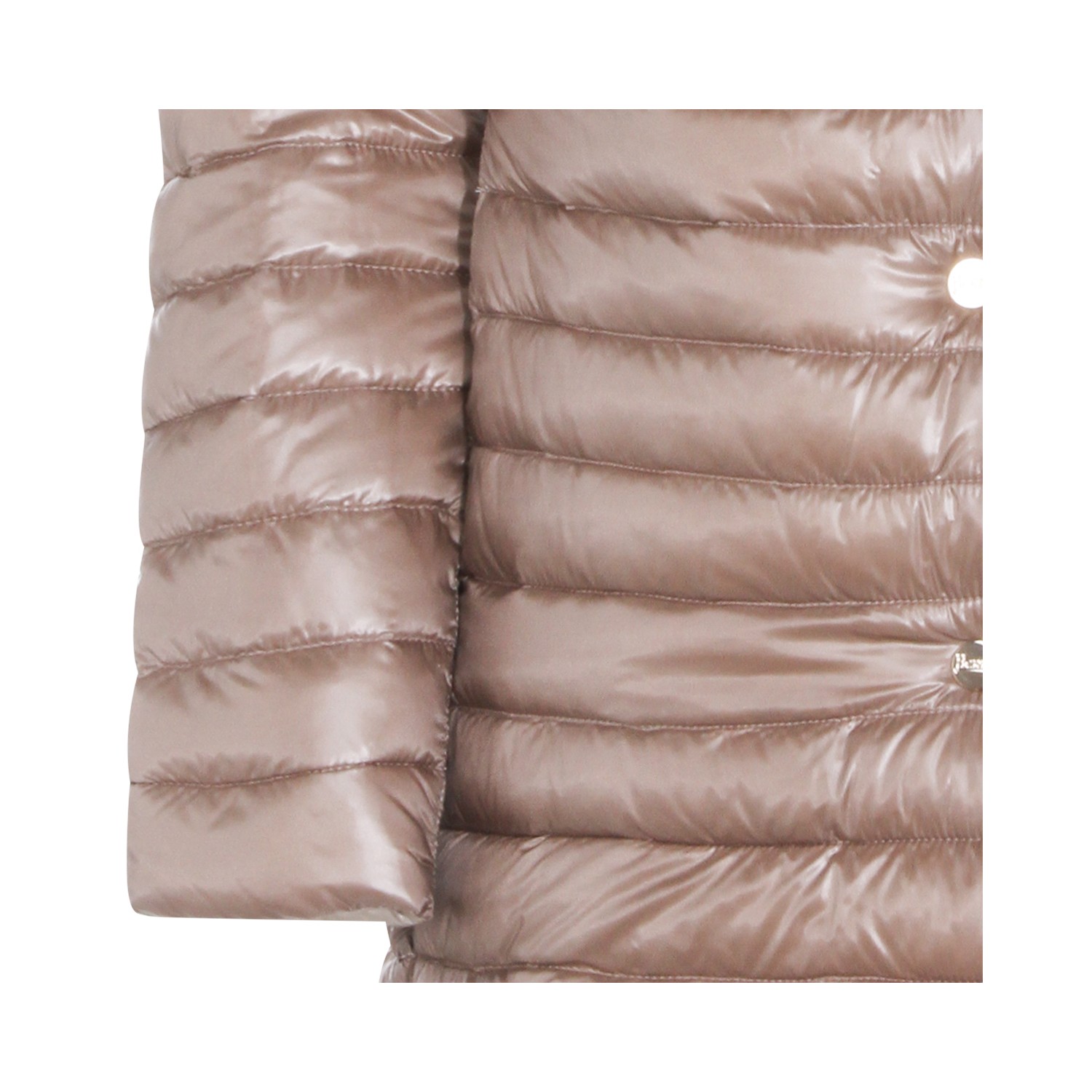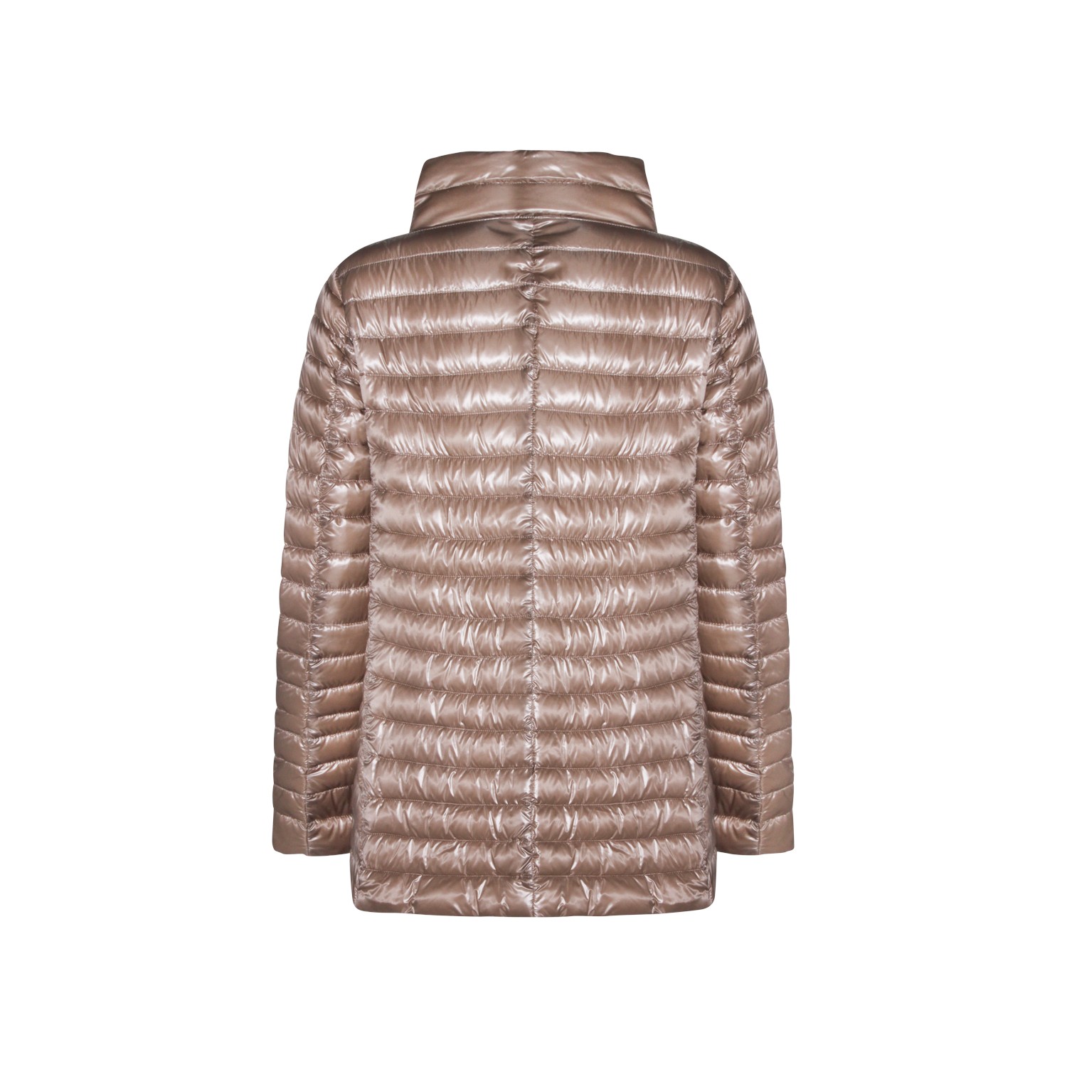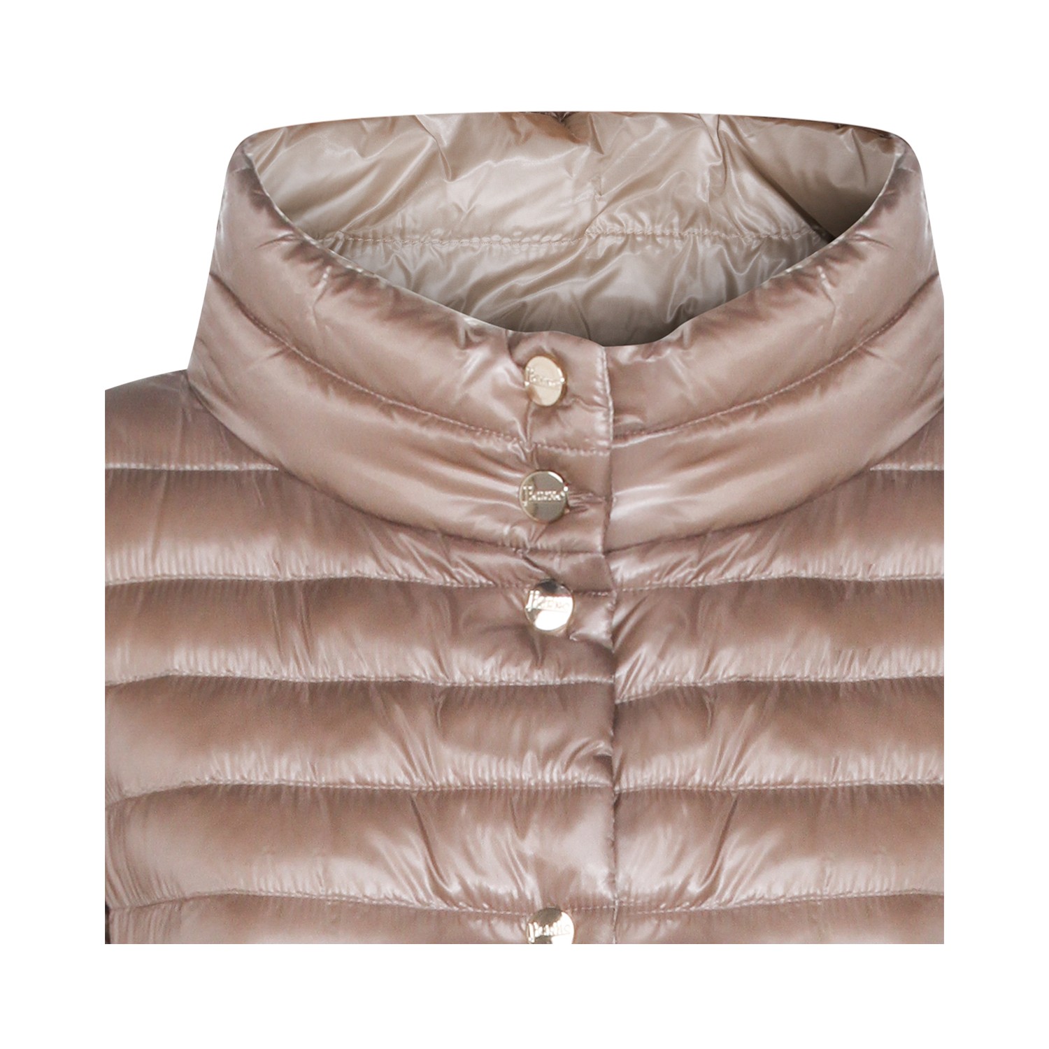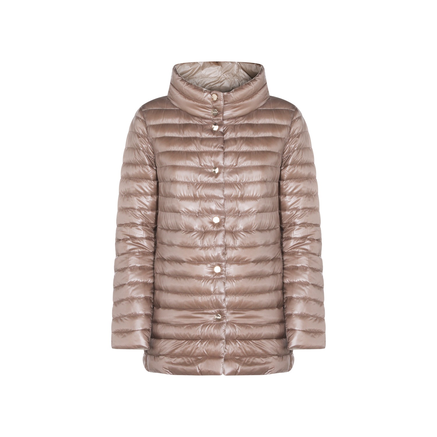 Beige down jacket from Herno featuring high collar, long sleeves, quilted, buttons fastening and midi lenght.