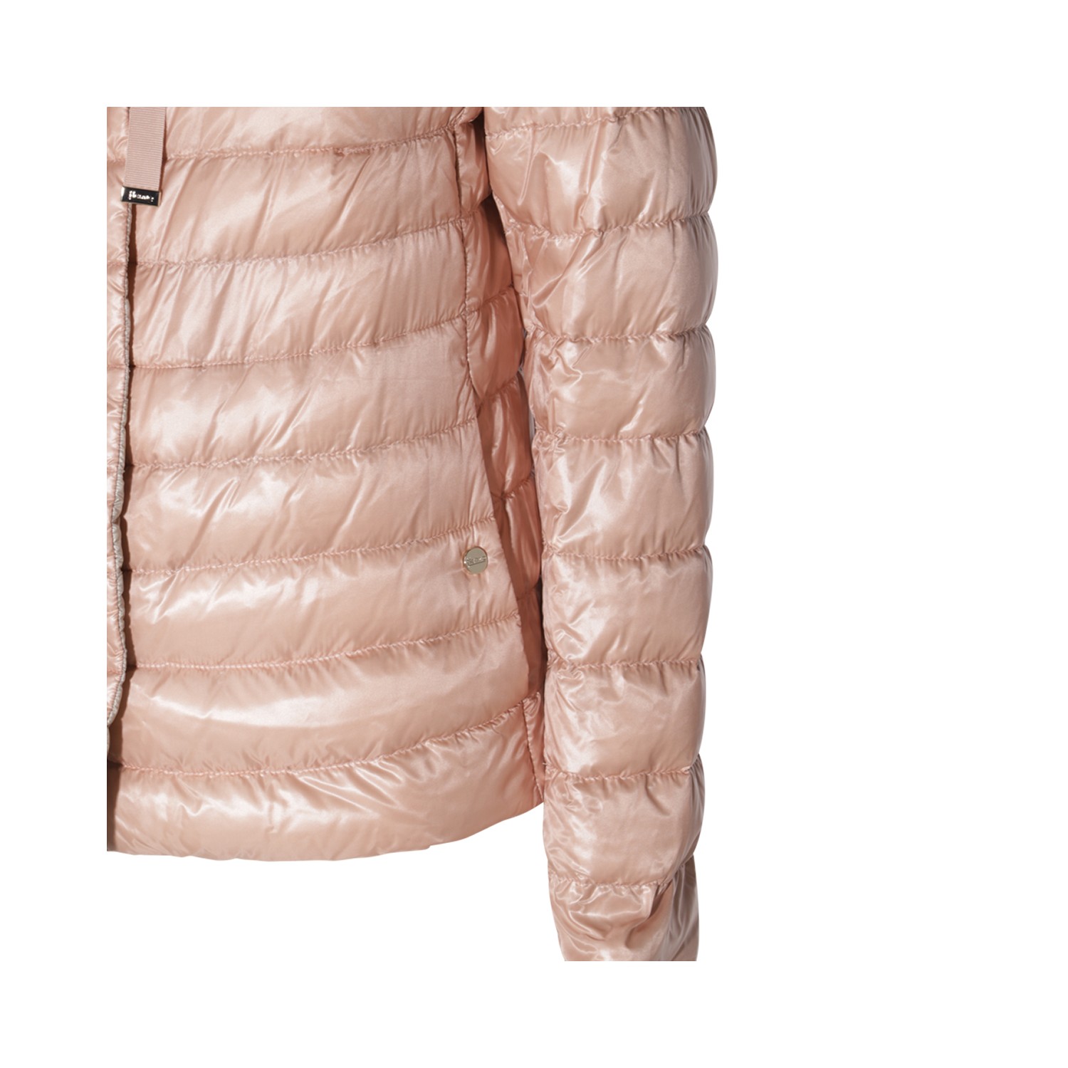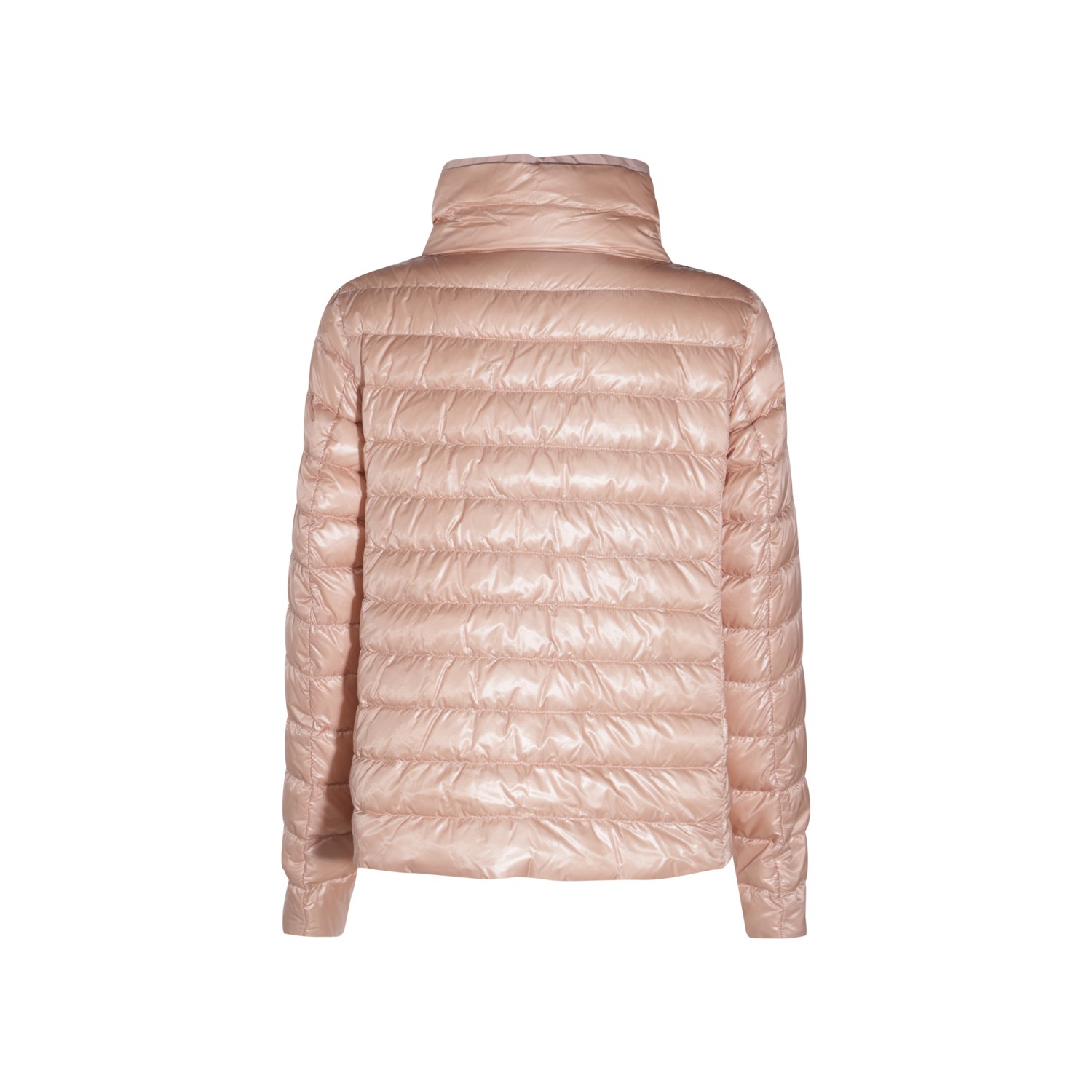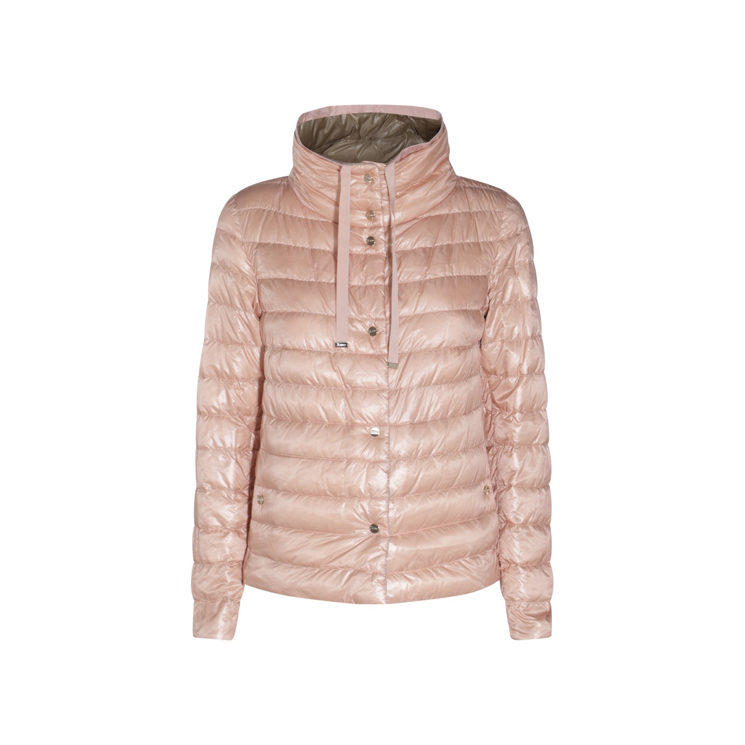 Pink puffed down jacket from Herno featuring long sleeves, high neck, magnetic button closure and drawstring neck.