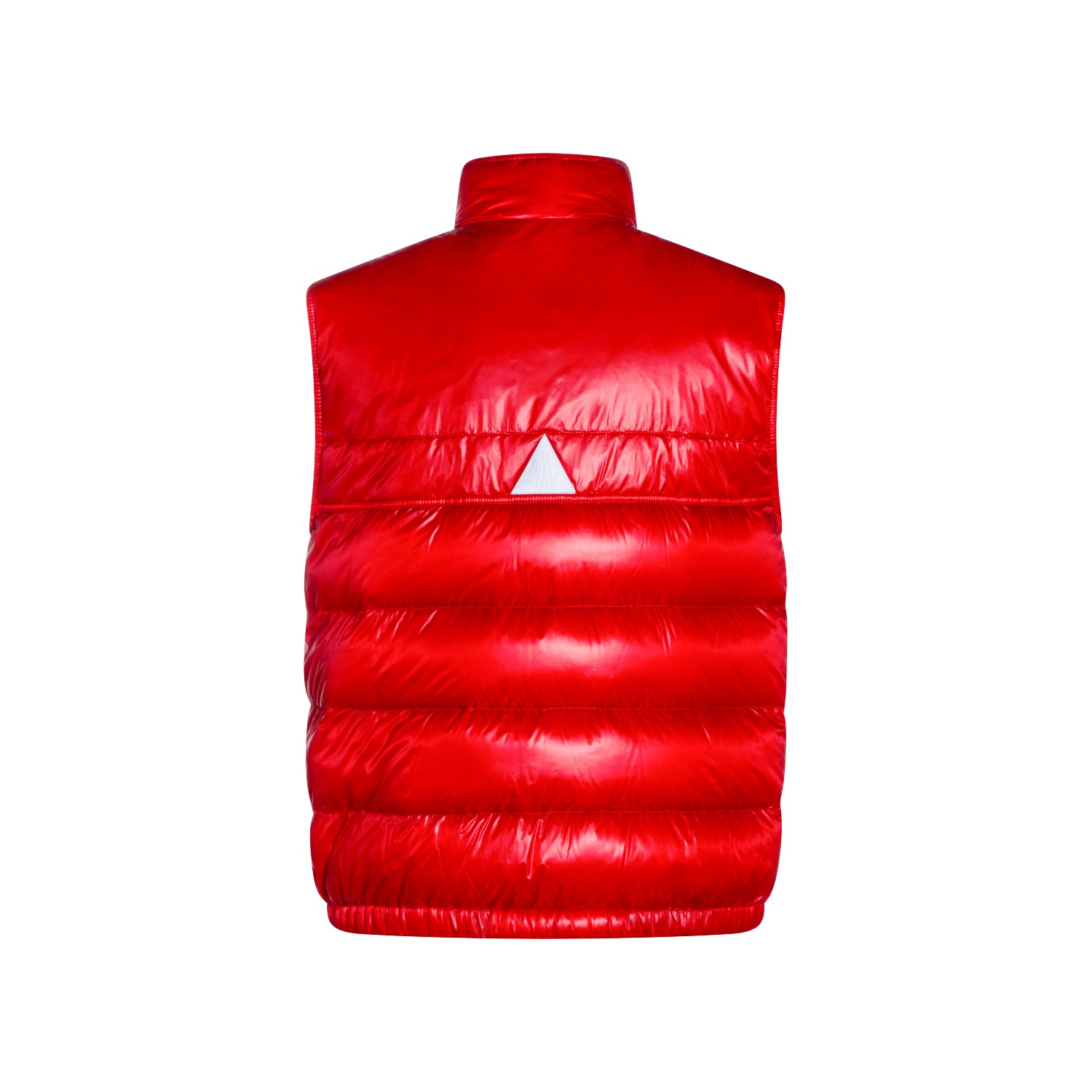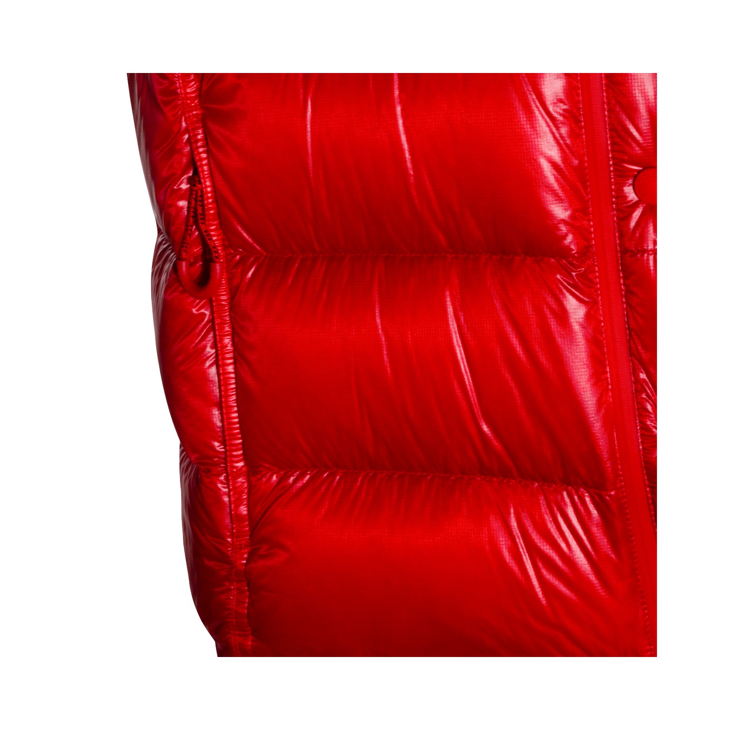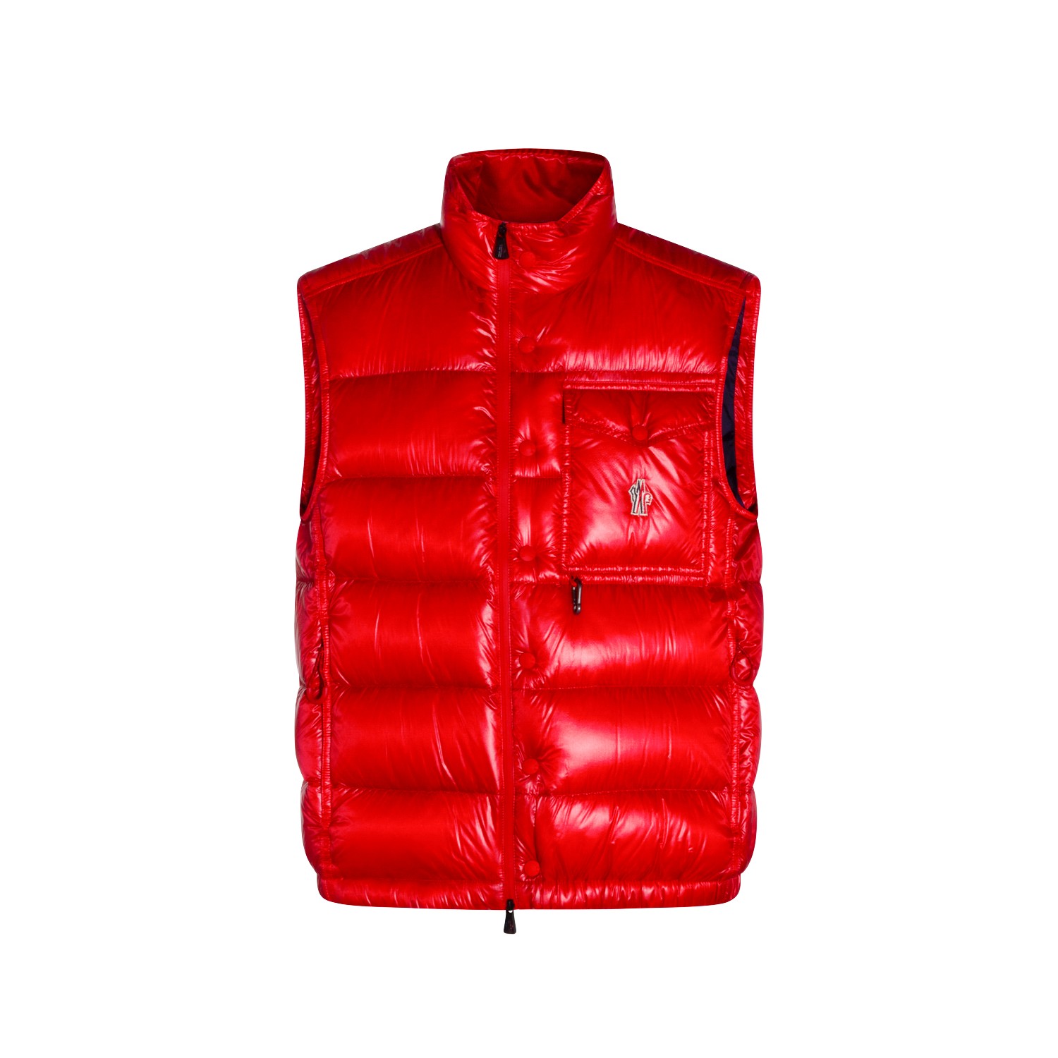Red Uychi down jacket from Moncler Grenoble featuring high collar, sleeveless, padded, chest pocket, quilted, zip fastening, pockets and regular fit.