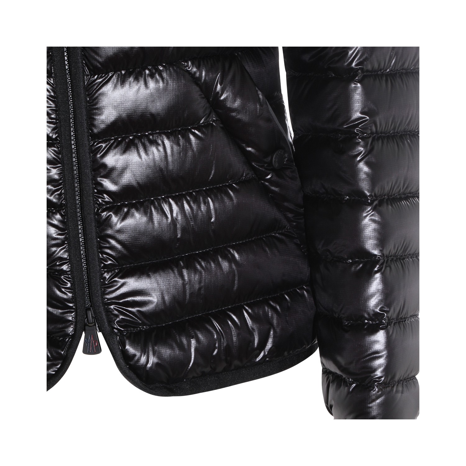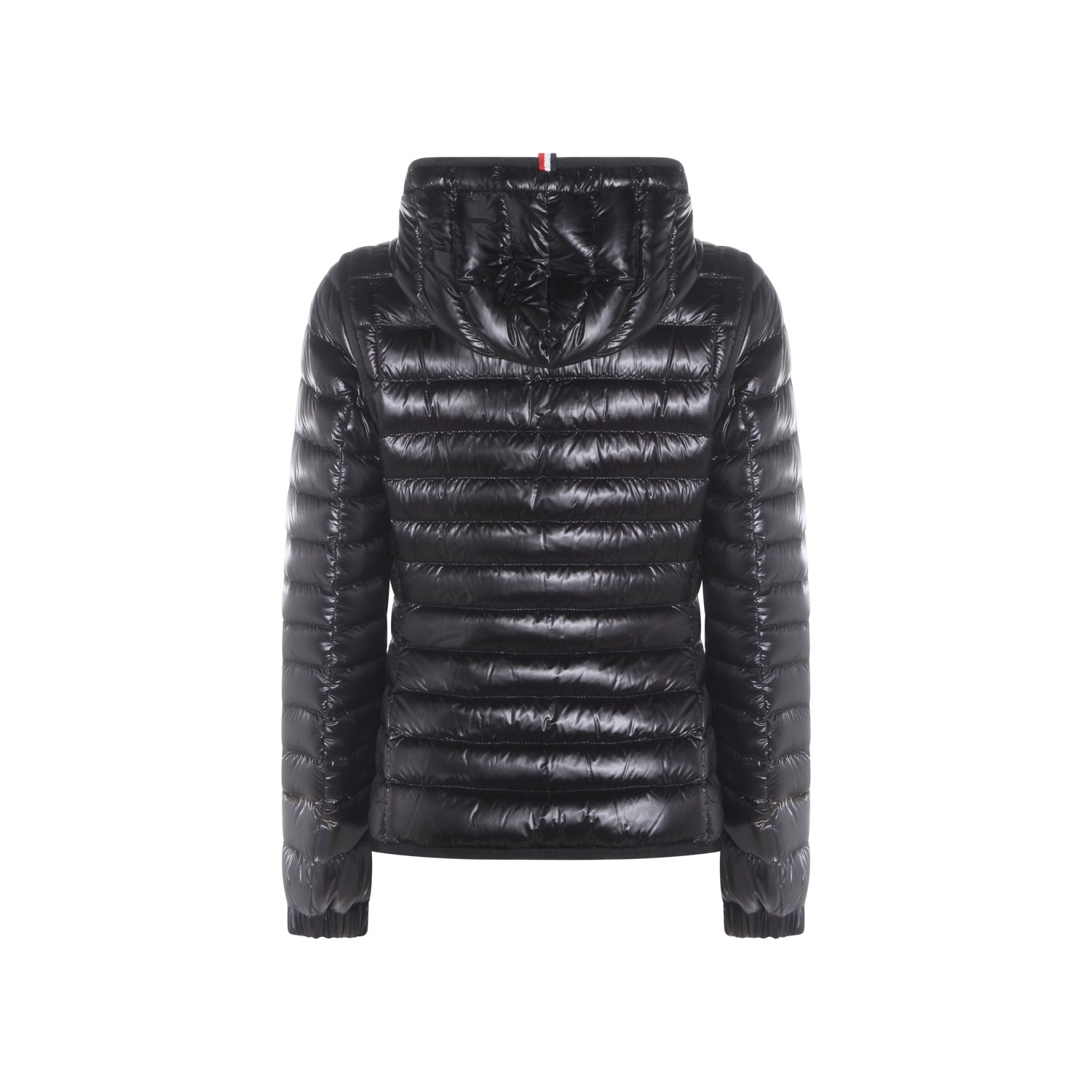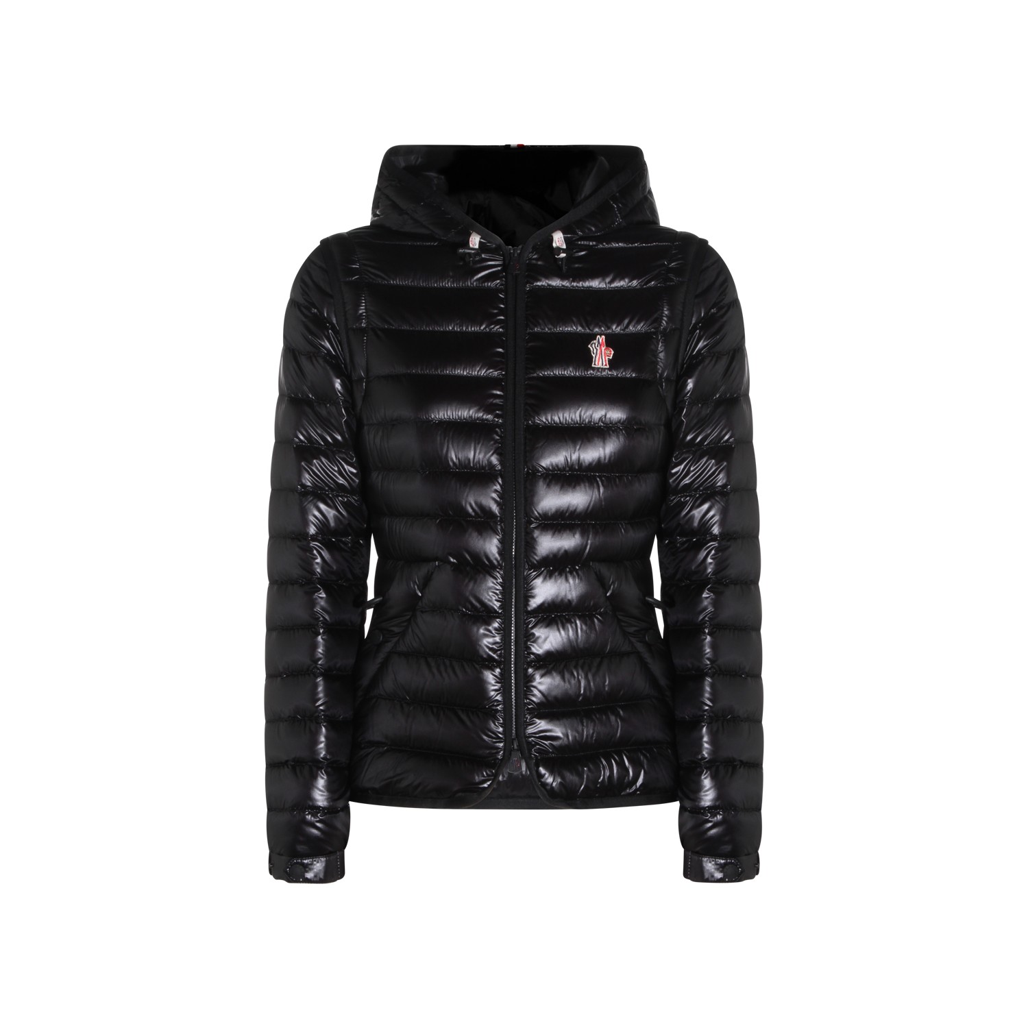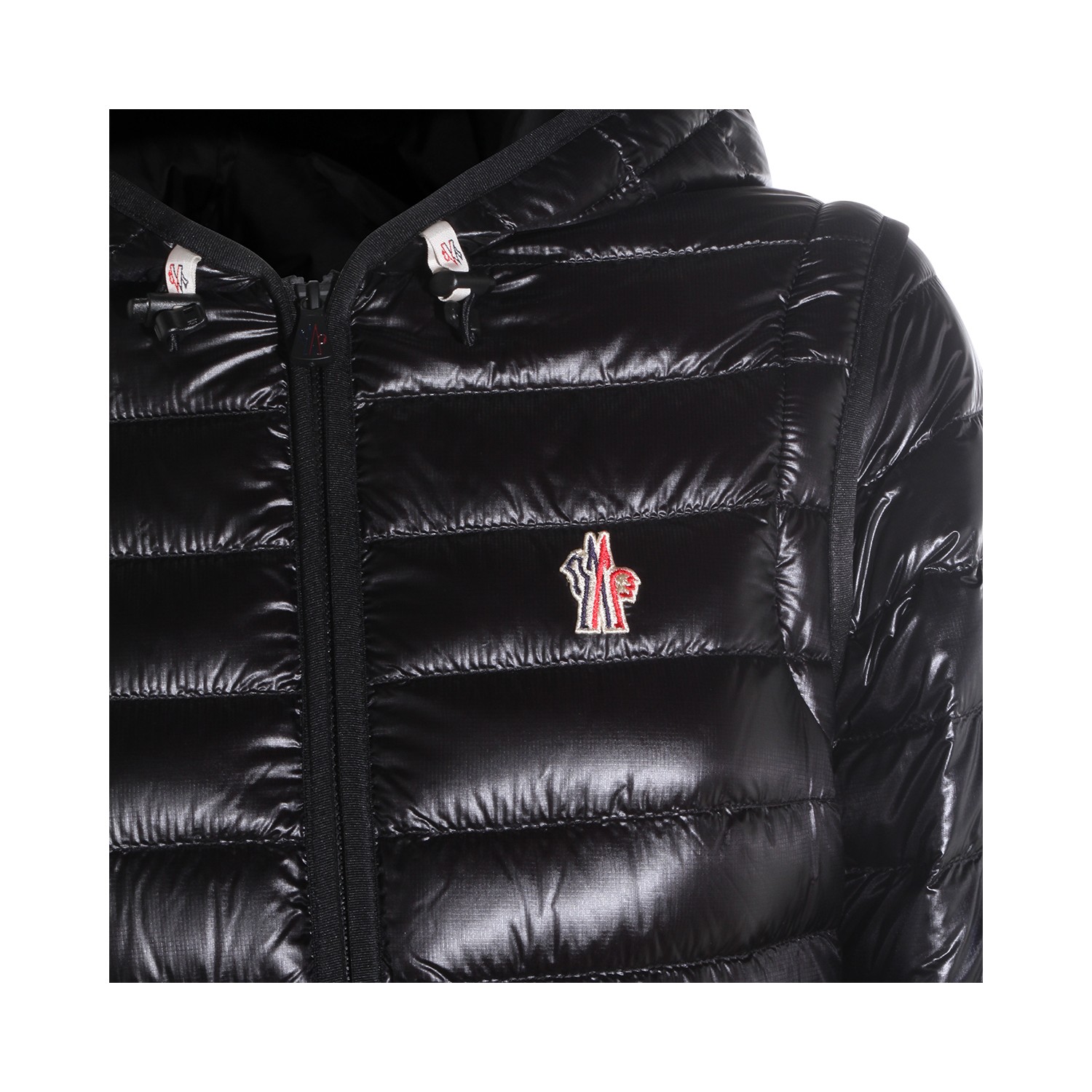 Black down jacket from Moncler Grenoble featuring hood, long sleeves, padded, quilted, logo, zip fastening and pockets.