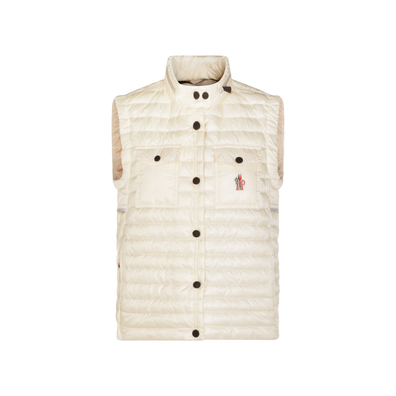 Ivory down jacket from Moncler Grenoble featuring mid collar, sleeveless, buttons fastening, quilted, chest pockets and regular fit.