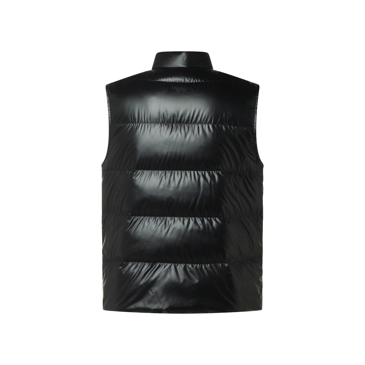 Black Restigo down jacket from Moncler featuring high collar, sleeveless, padded, buttons fastening, logo patch, pockets and regular vestibility.