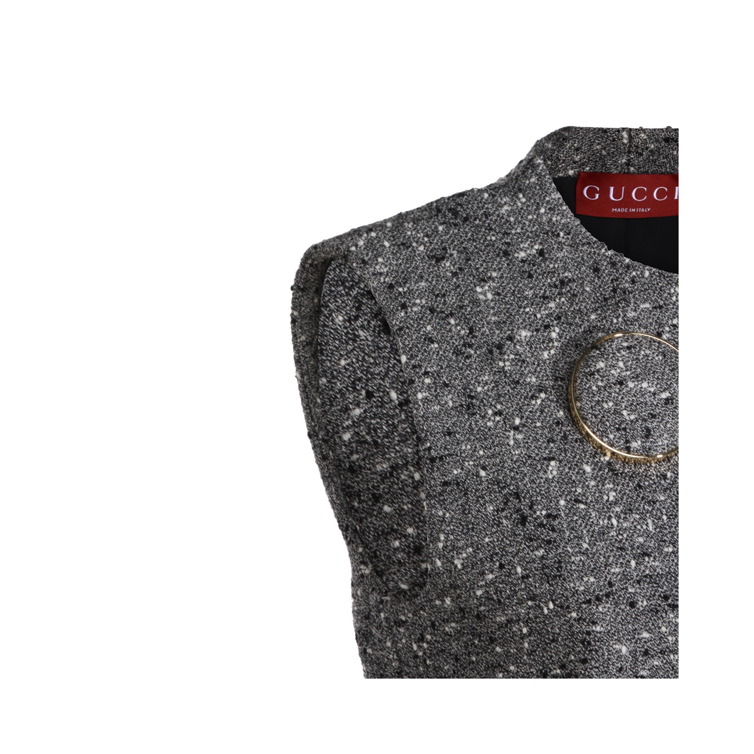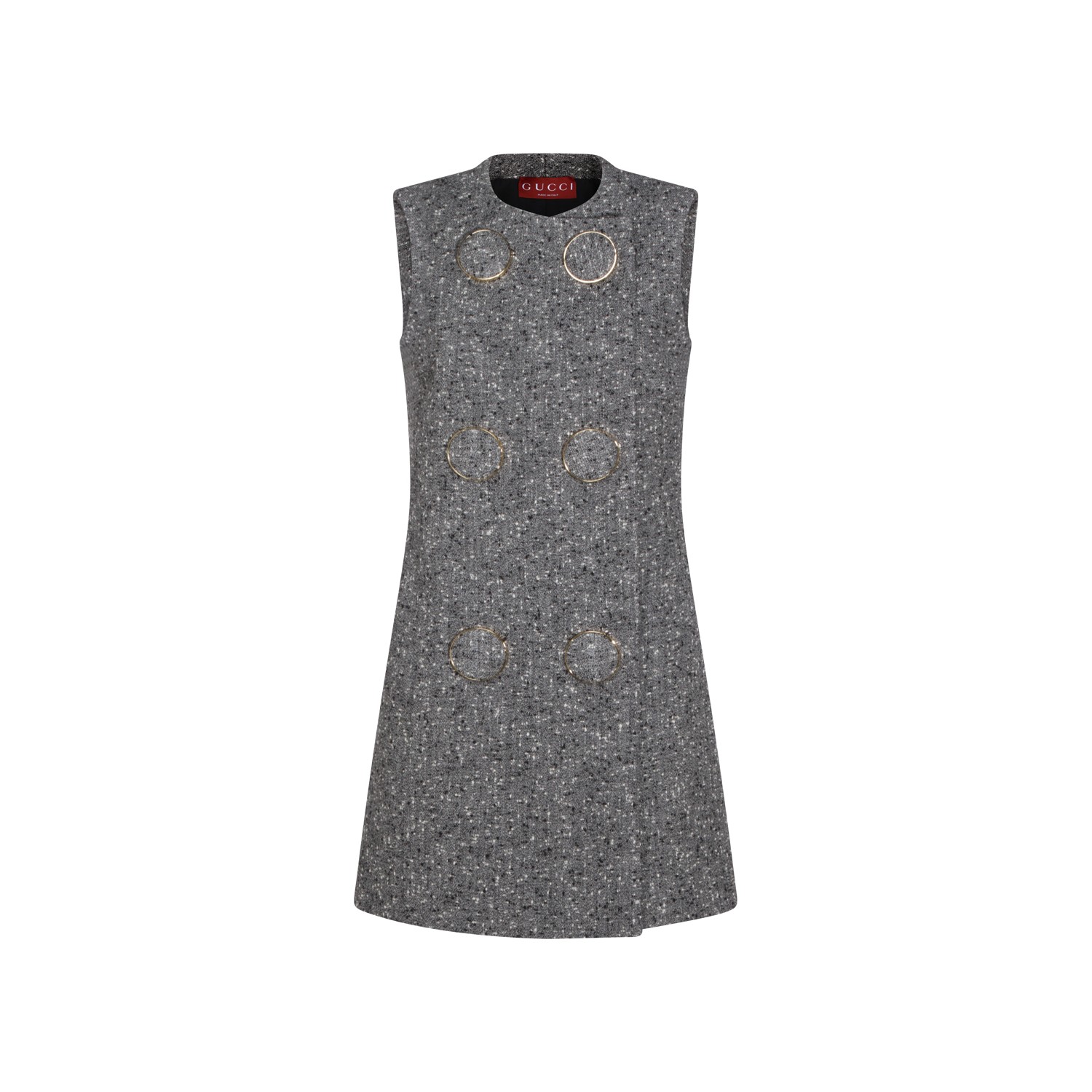 Grey wool dress from Gucci featuring round collar, sleeveless, oversize buttons fastening and regular vestibility.