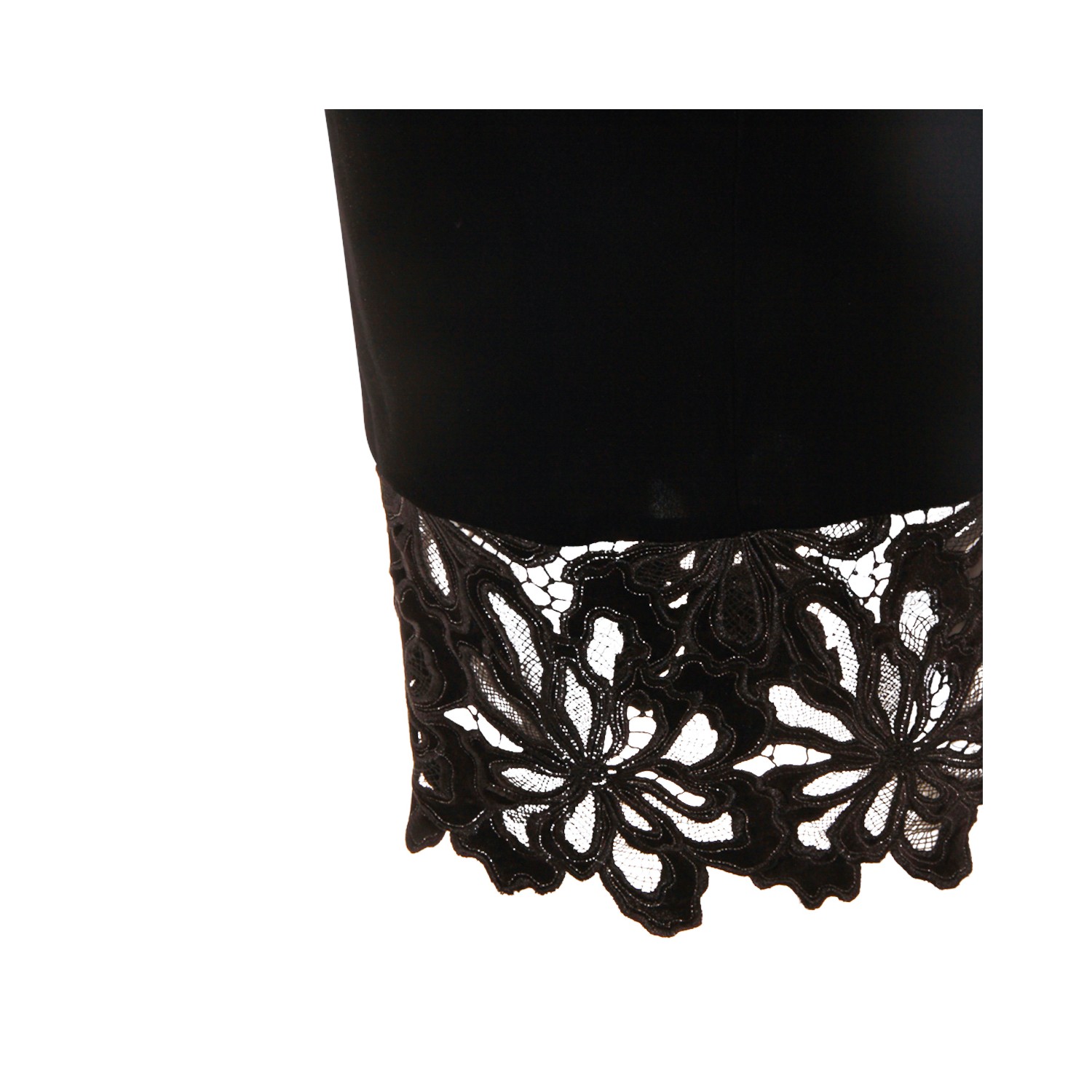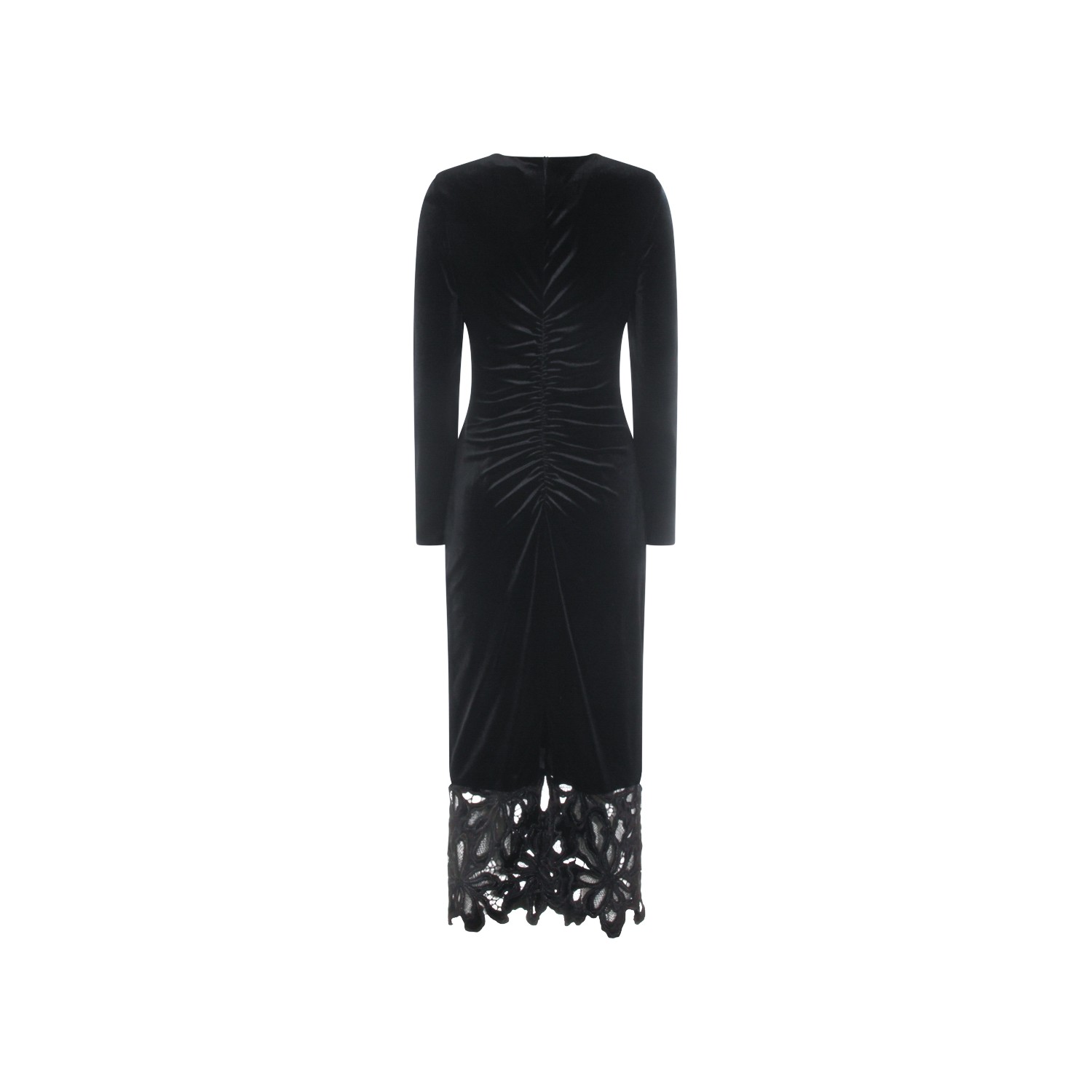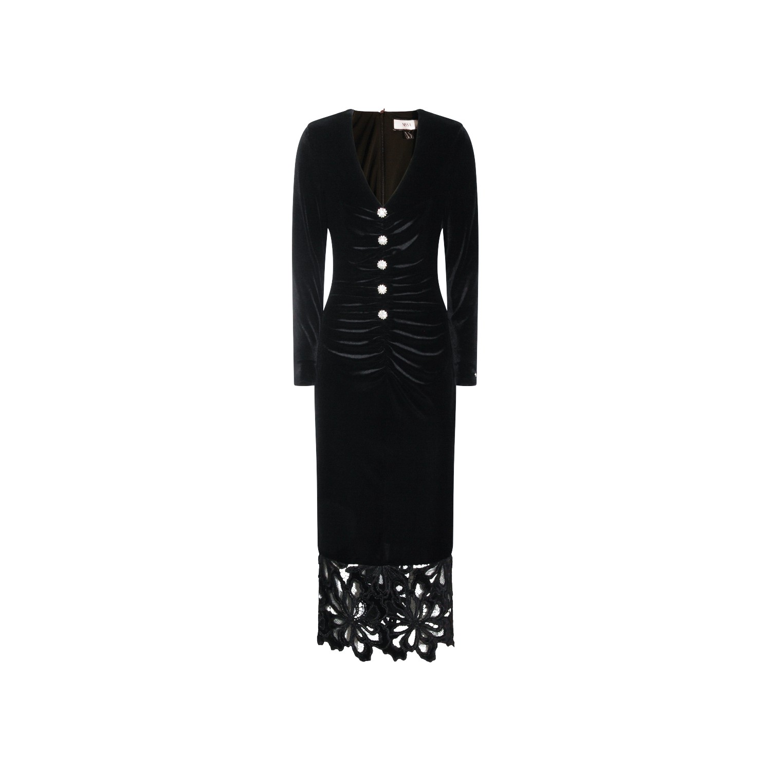 Black midi dress from Nissa featuring round collar, laces detail, long sleeves, buttons and midi length.