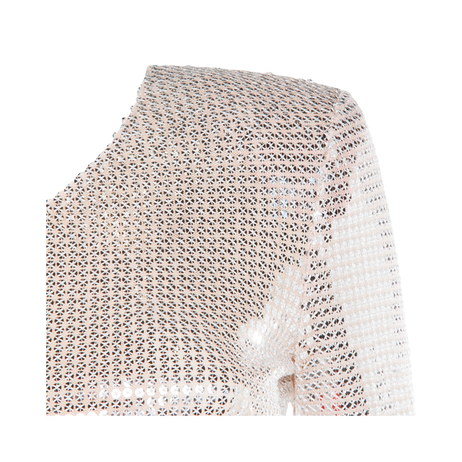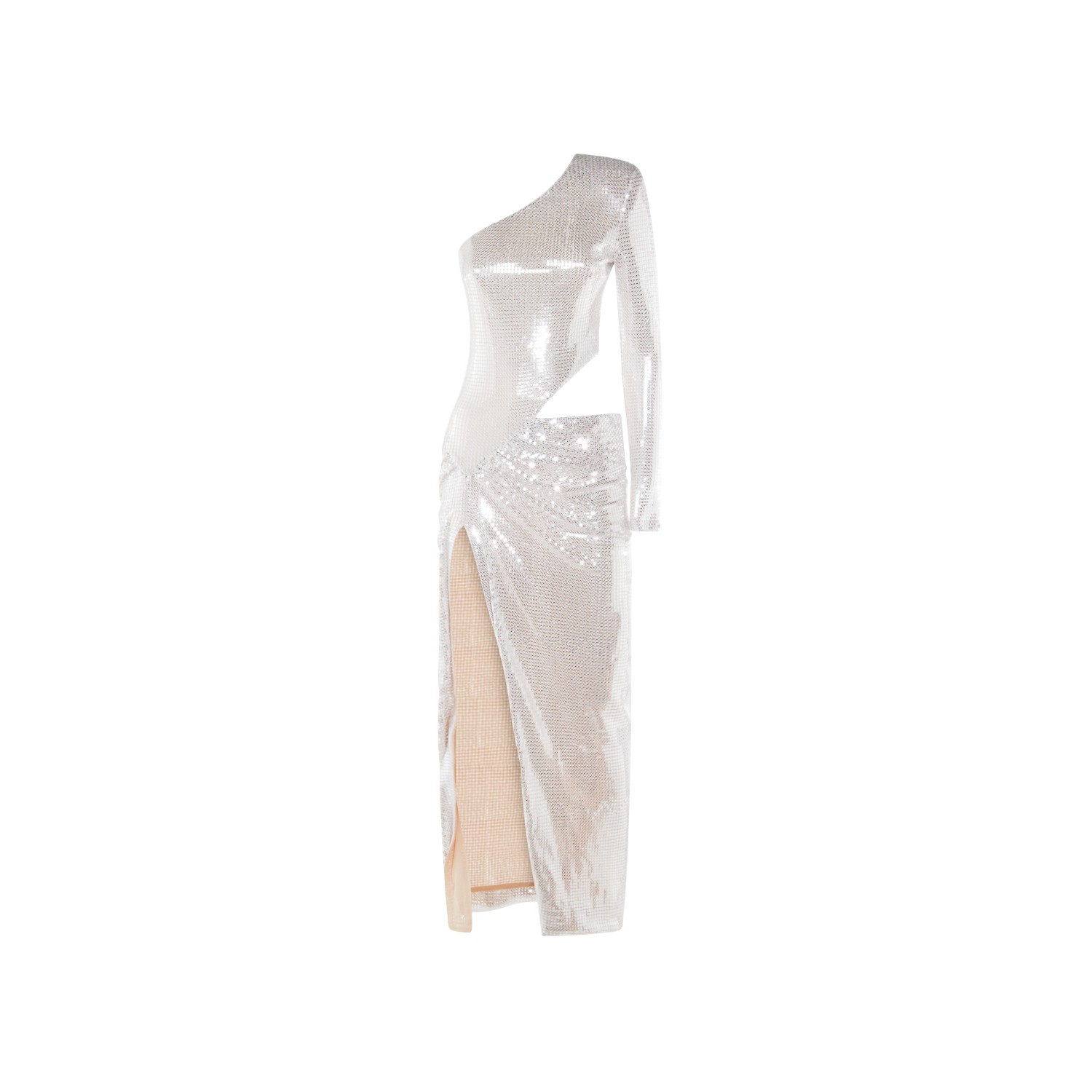 Silver maxi dress from Nissa featuring only one sleeve, cut-outs and long gown.