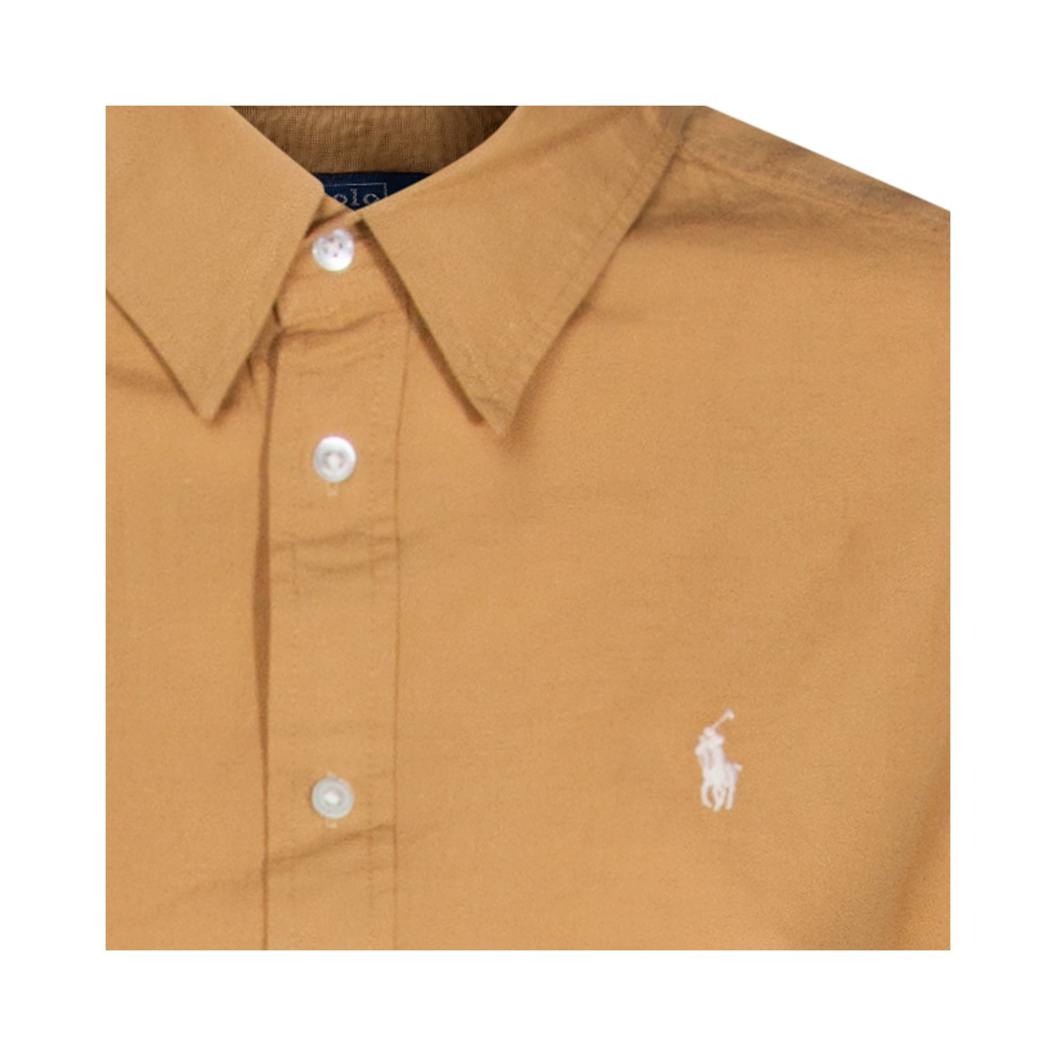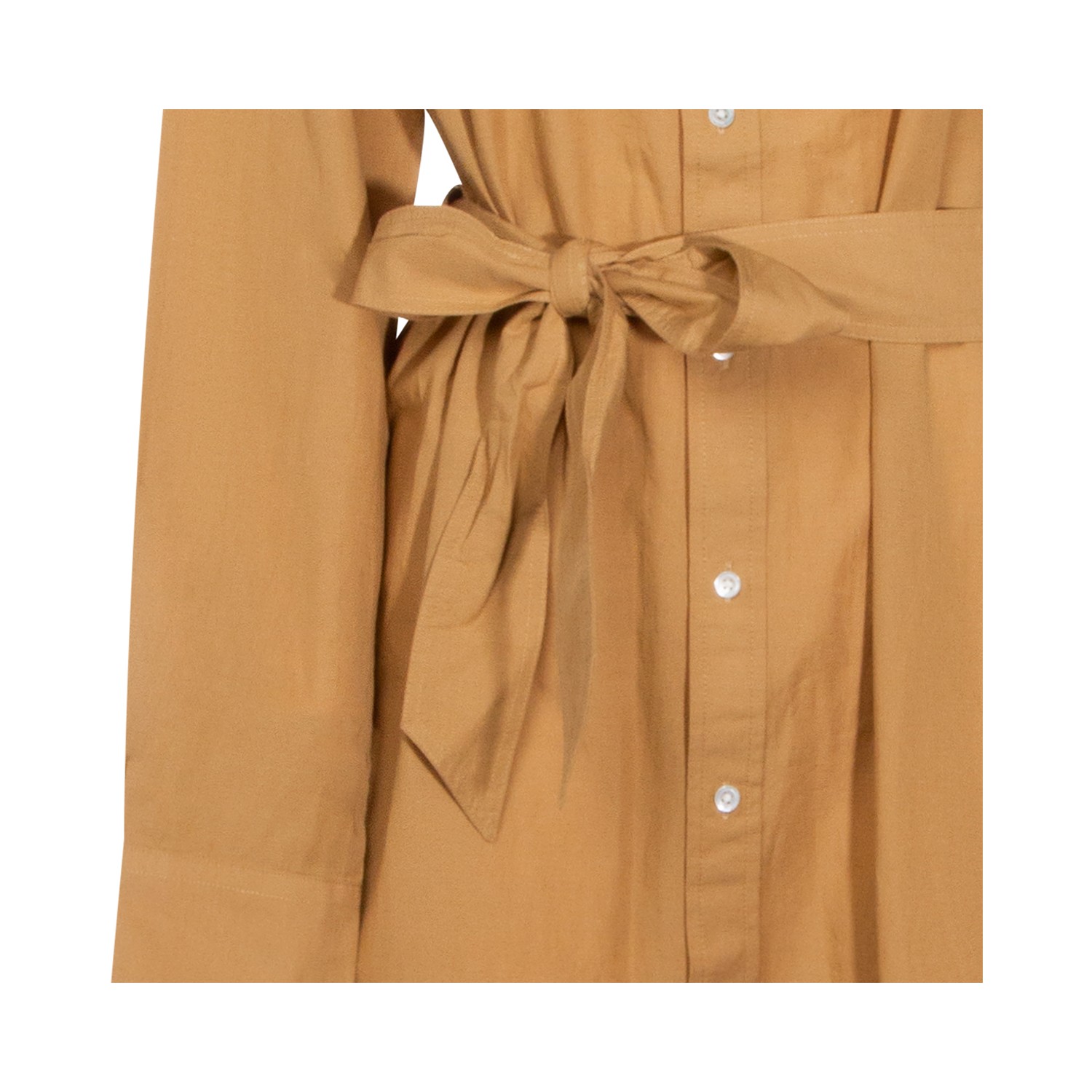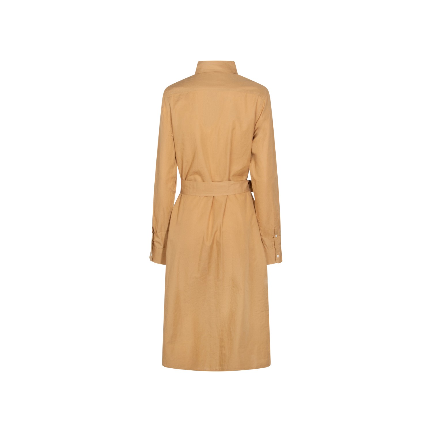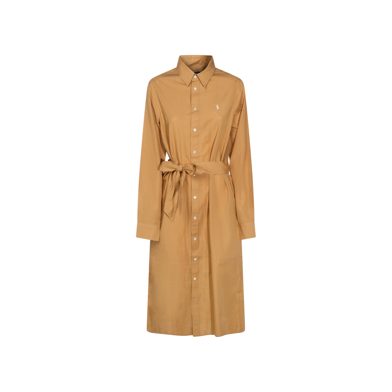Camel cotton dress from Polo Ralph Lauren featuring shirt neck, buttons fastening, long sleeves, waist belt and wide gown.