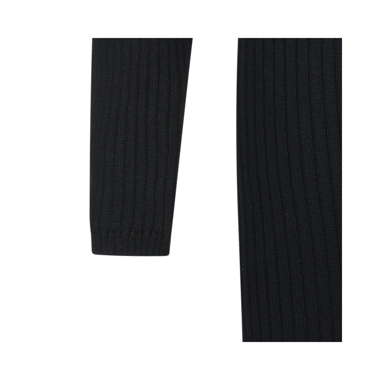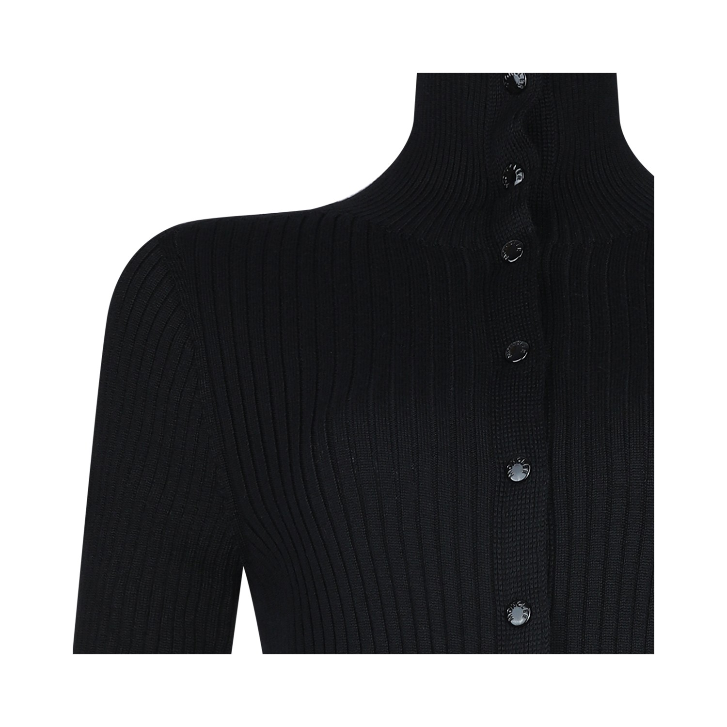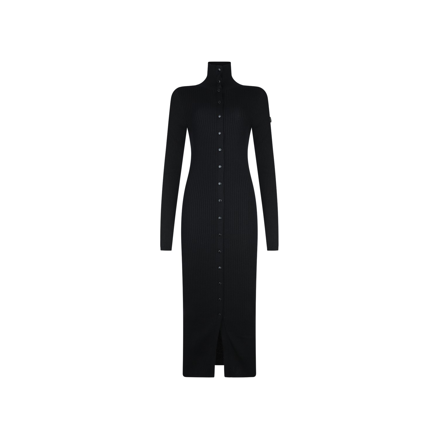 Black wool dress from Moncler Genius Edward Enninful featuring turtleneck, long sleeves, snap button closure, iconic logo patch, all over length, ribbed workmanship and slim fit.