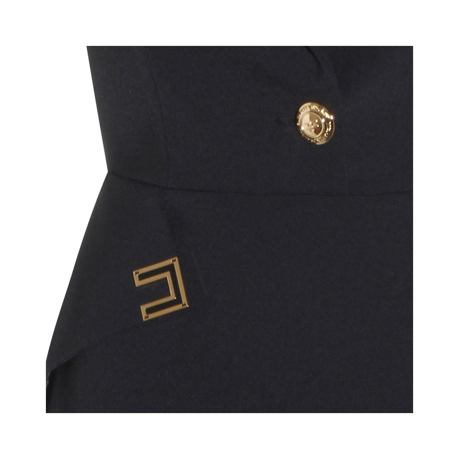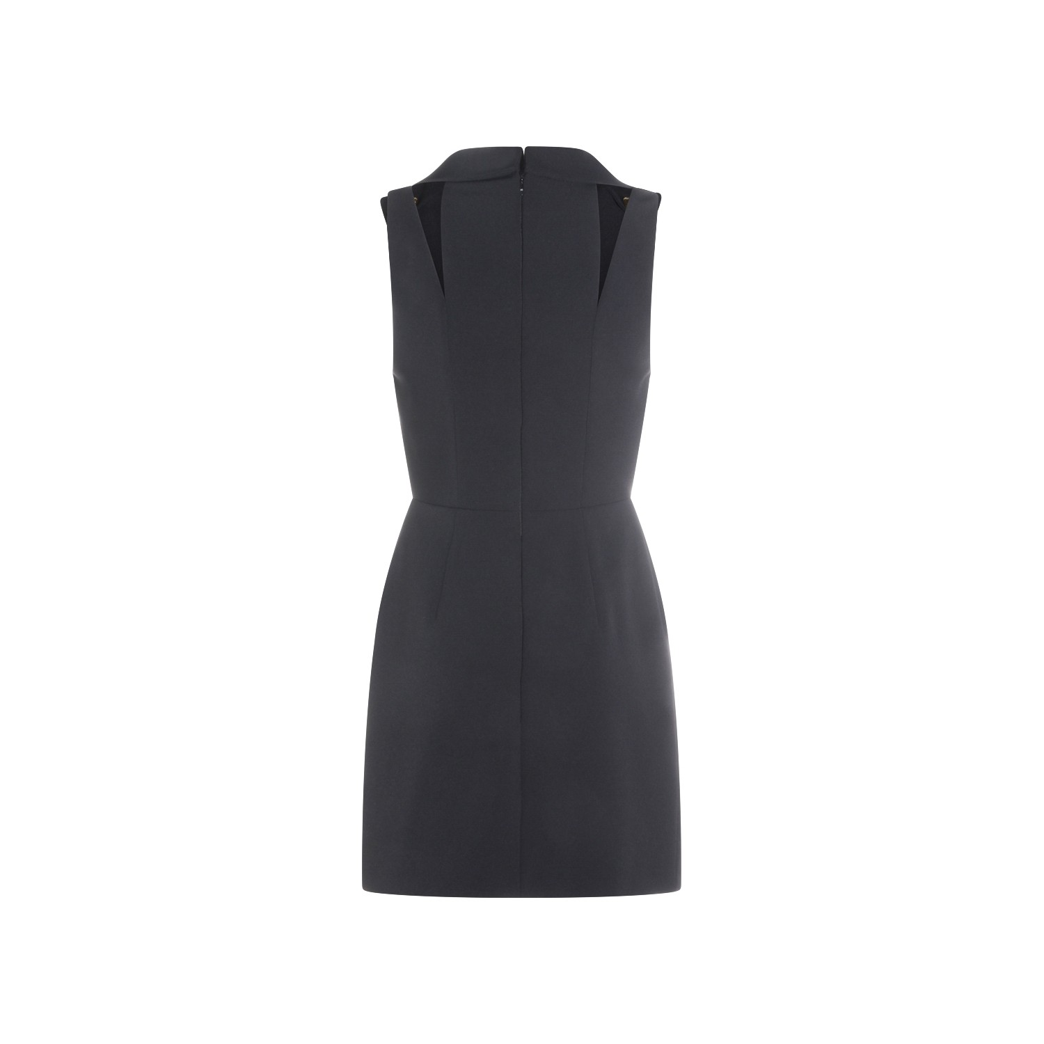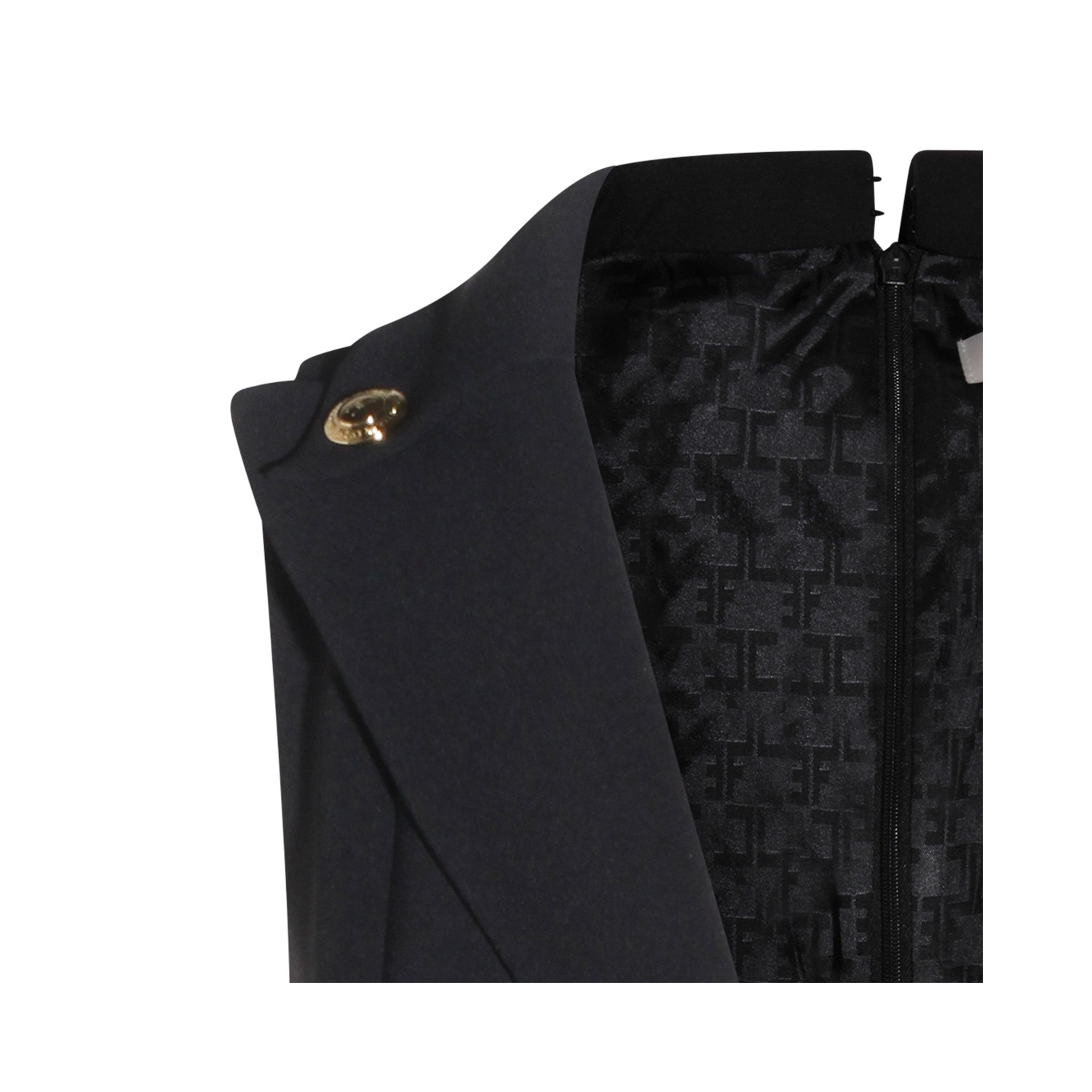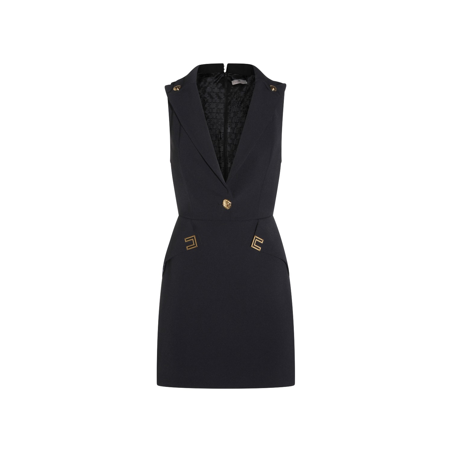 Black dress from Elisabetta Franchi featuring deep v neckline, sleeveless, back fastening, gold tone details and mini lenght.