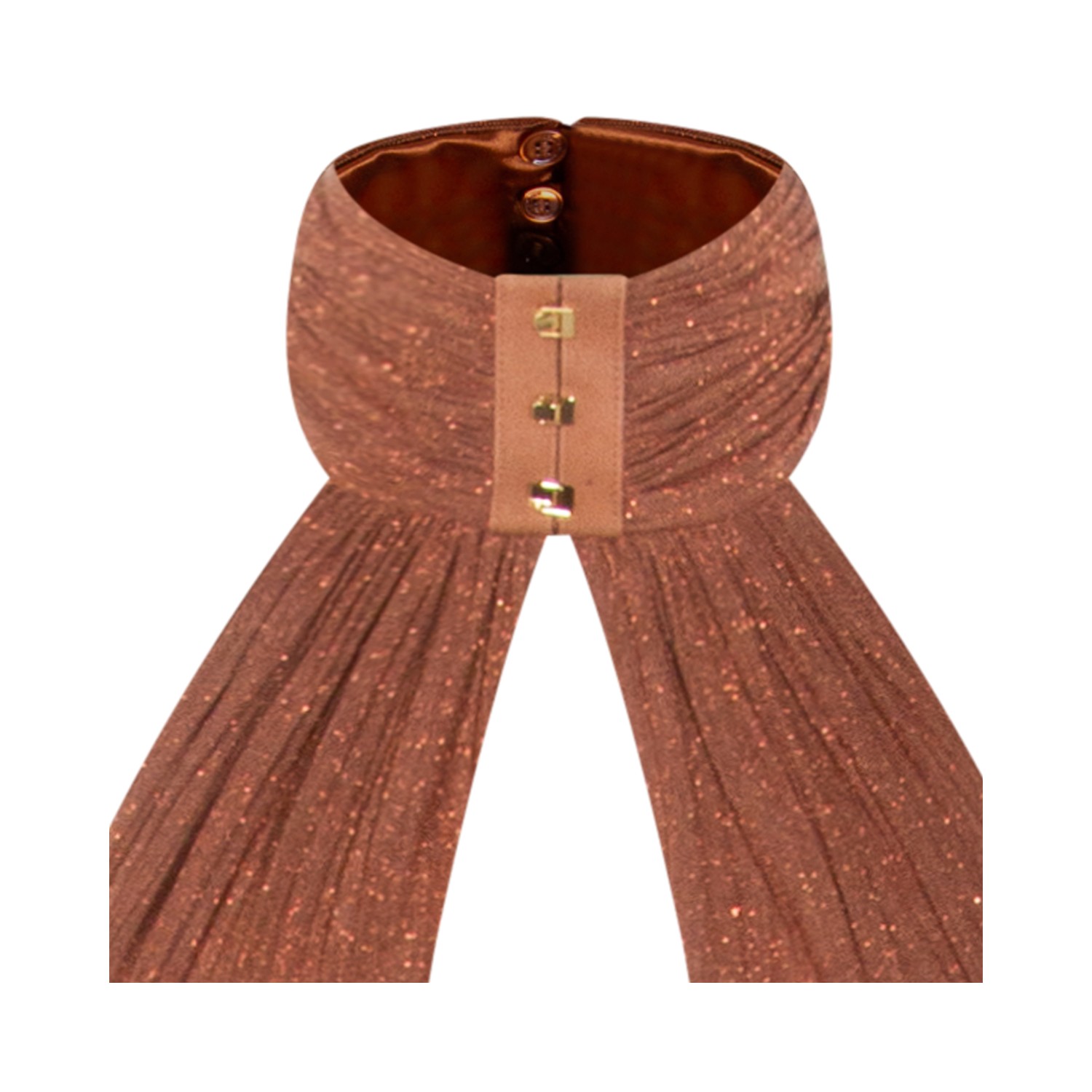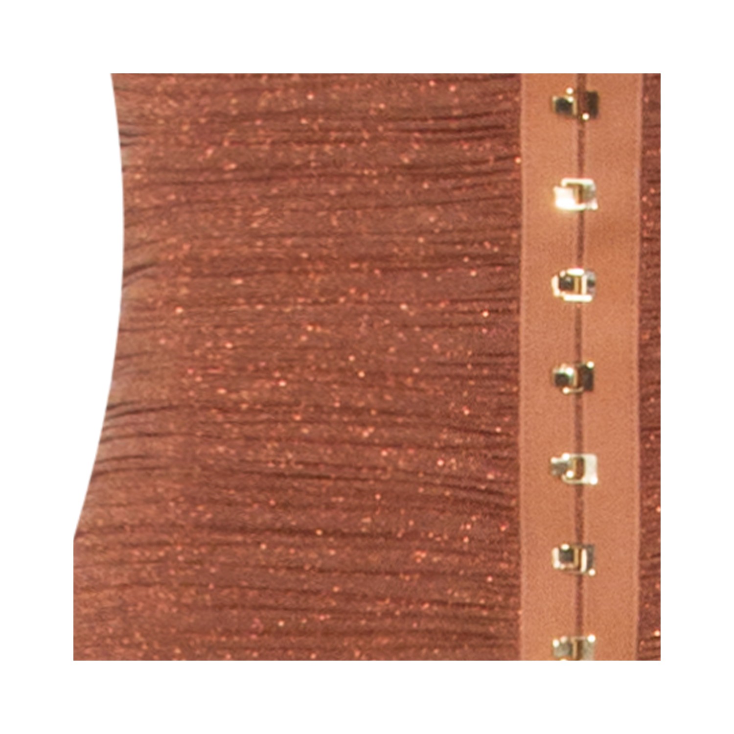 Brown lamjersey dress from Elisabetta Franchi featuring high halterneck, corsetry-inspired hooks on neck and bust, invisible zip on the back, side-slit skirt, drapings, gold metal hooks and slim fit.