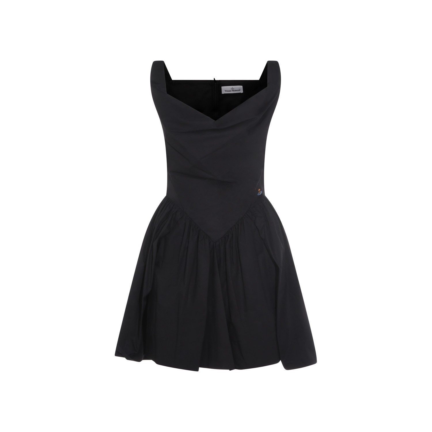 Black mini cotton dress from Vivienne Westwood featuring sleeveless, mini length, back zip fastening and flared skirt.