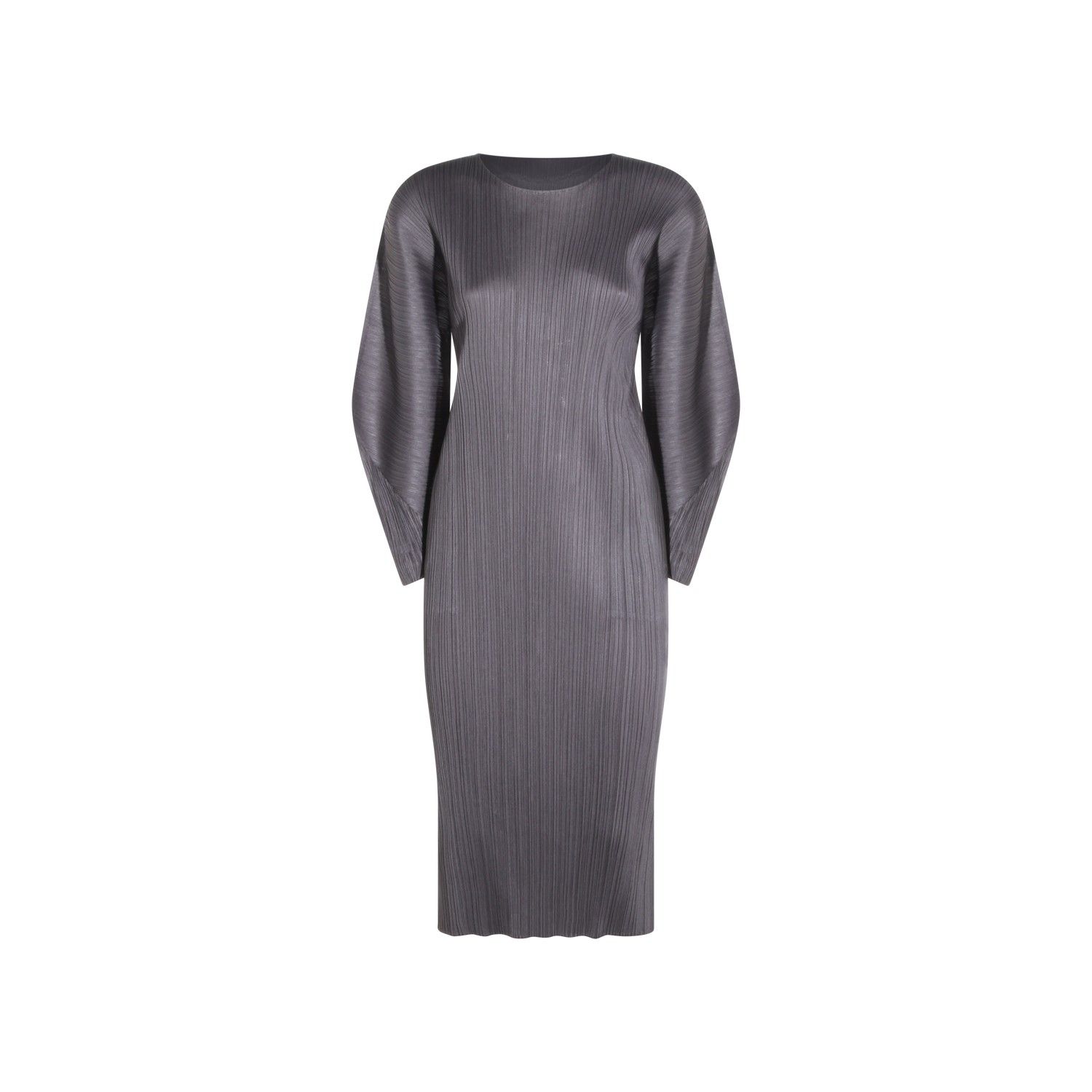 Gray pleated dress from Pleats Please Issey Miyake featuring long sleeves, round collar, midi length and regular vestibility.