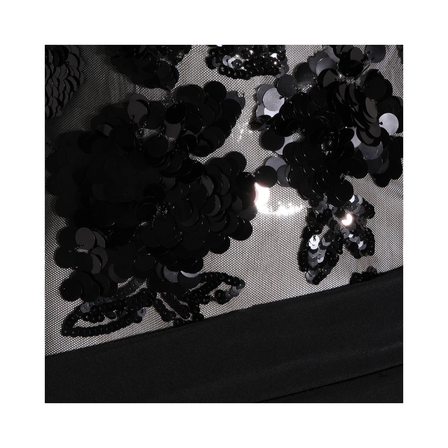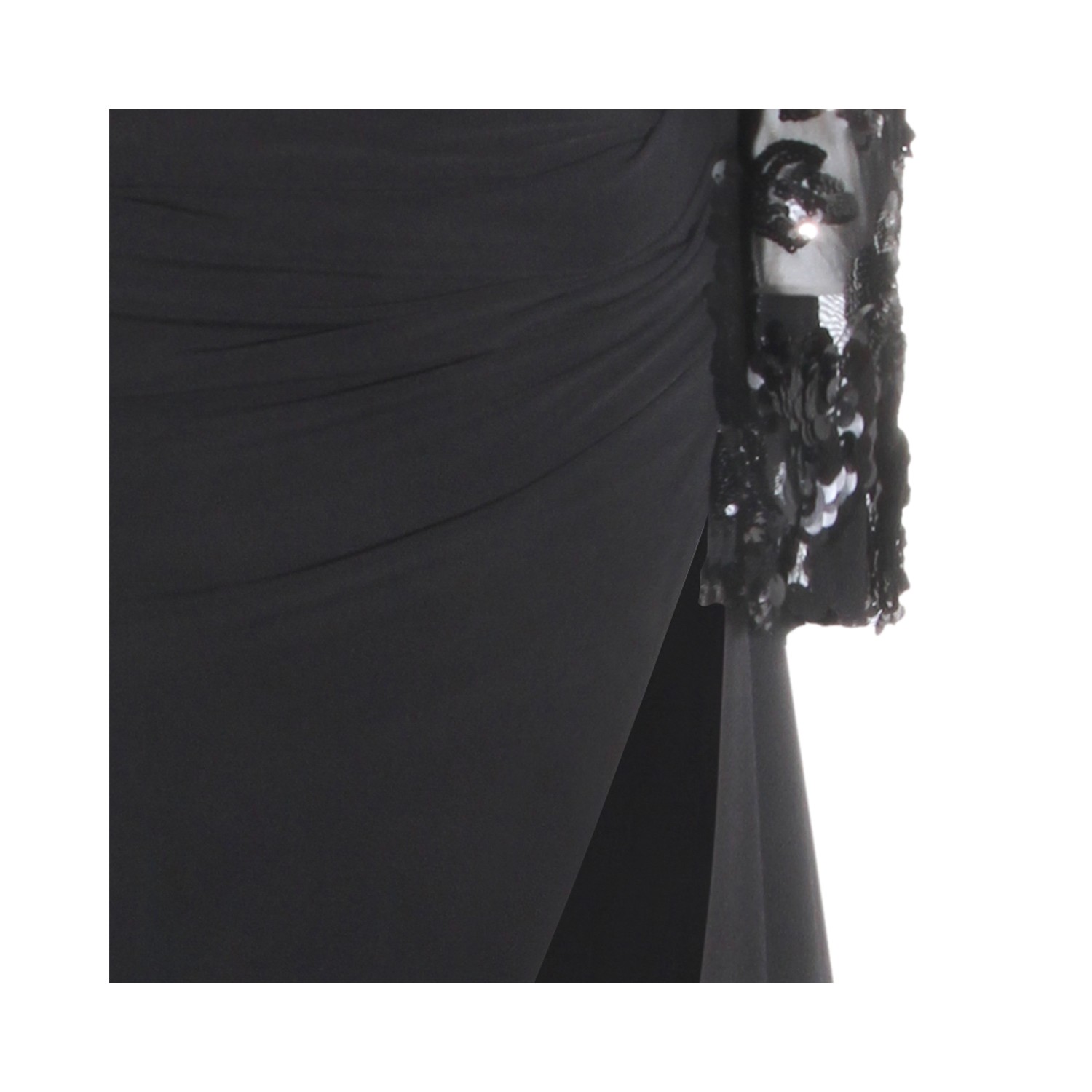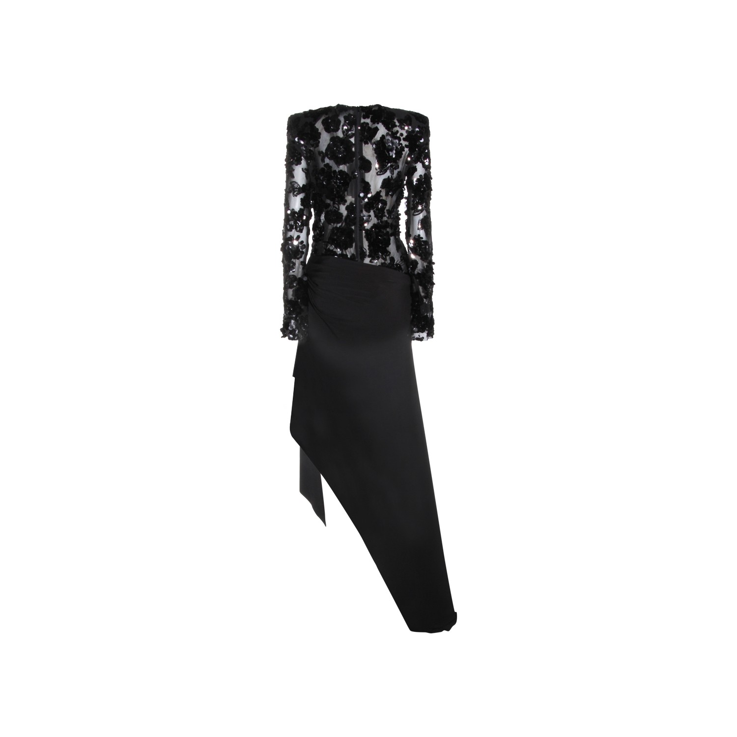 Black dress from Nissa featuring long sleeves, trasparence, round collar, details and slit.