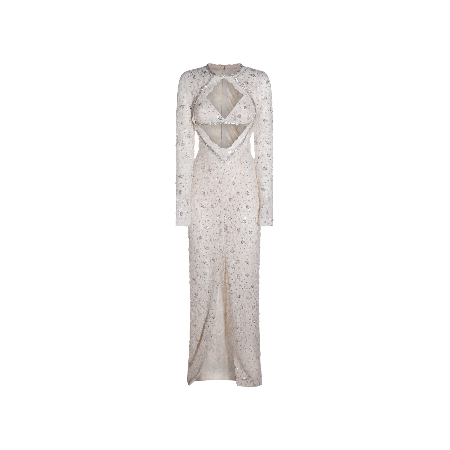 White maxi dress from Nissa featuring long sleeves, round collar, frontal opening, all over pailettes detail, back zip fastening and maxi length.