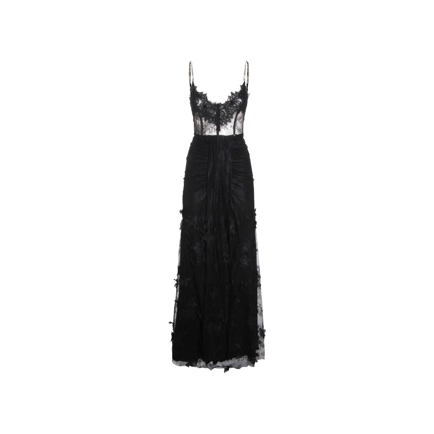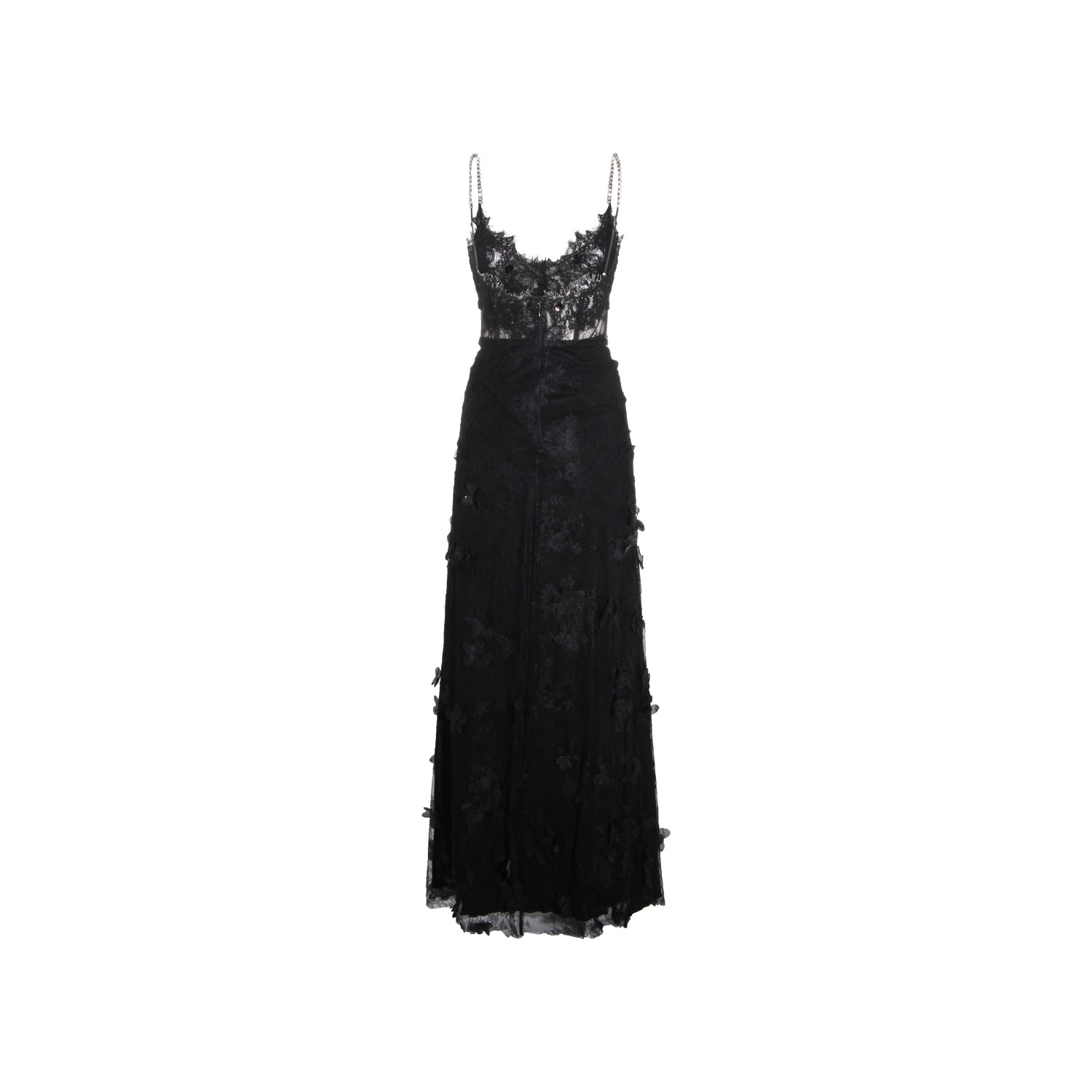 Black maxi dress from Nissa featuring sleeveless, laces, trasparence, heart neckline, maxi skirt and back fastening.