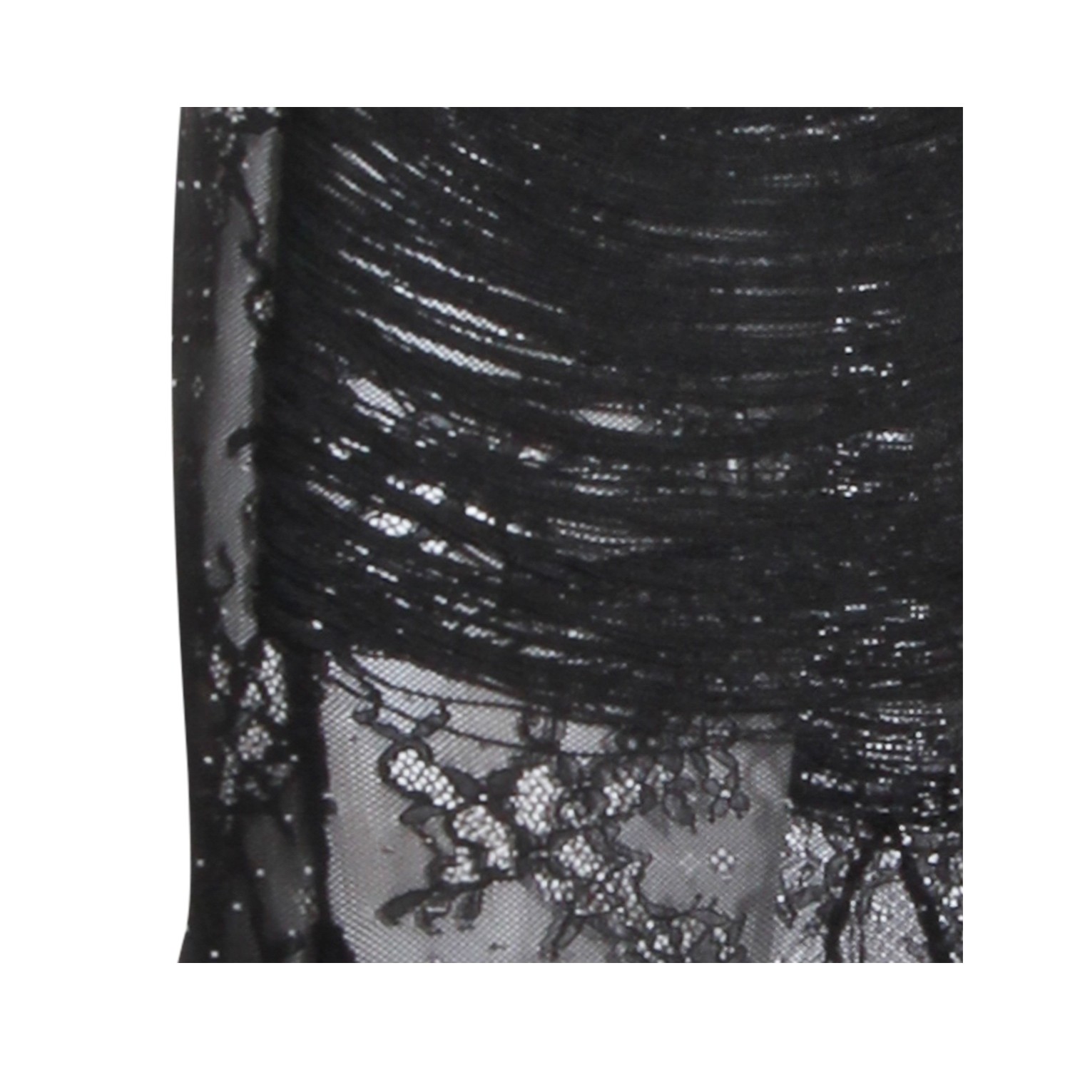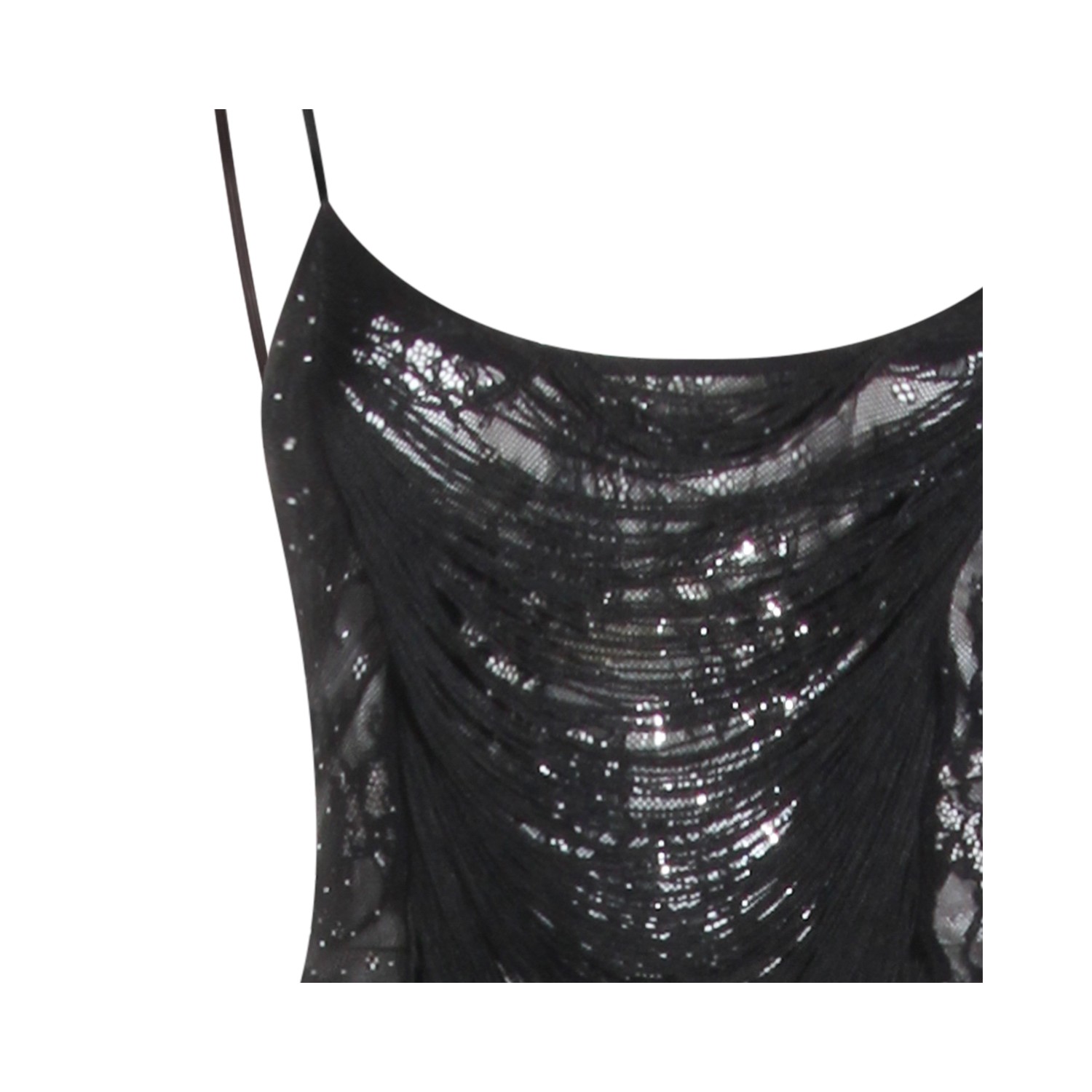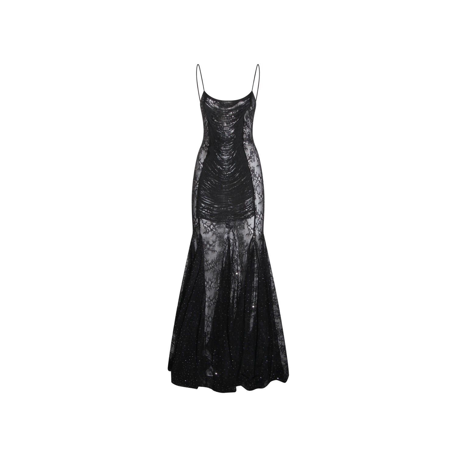 Black dress from Nissa featuring deep neckline, lace details, trasparence, long length, sleeveless and thin straps.