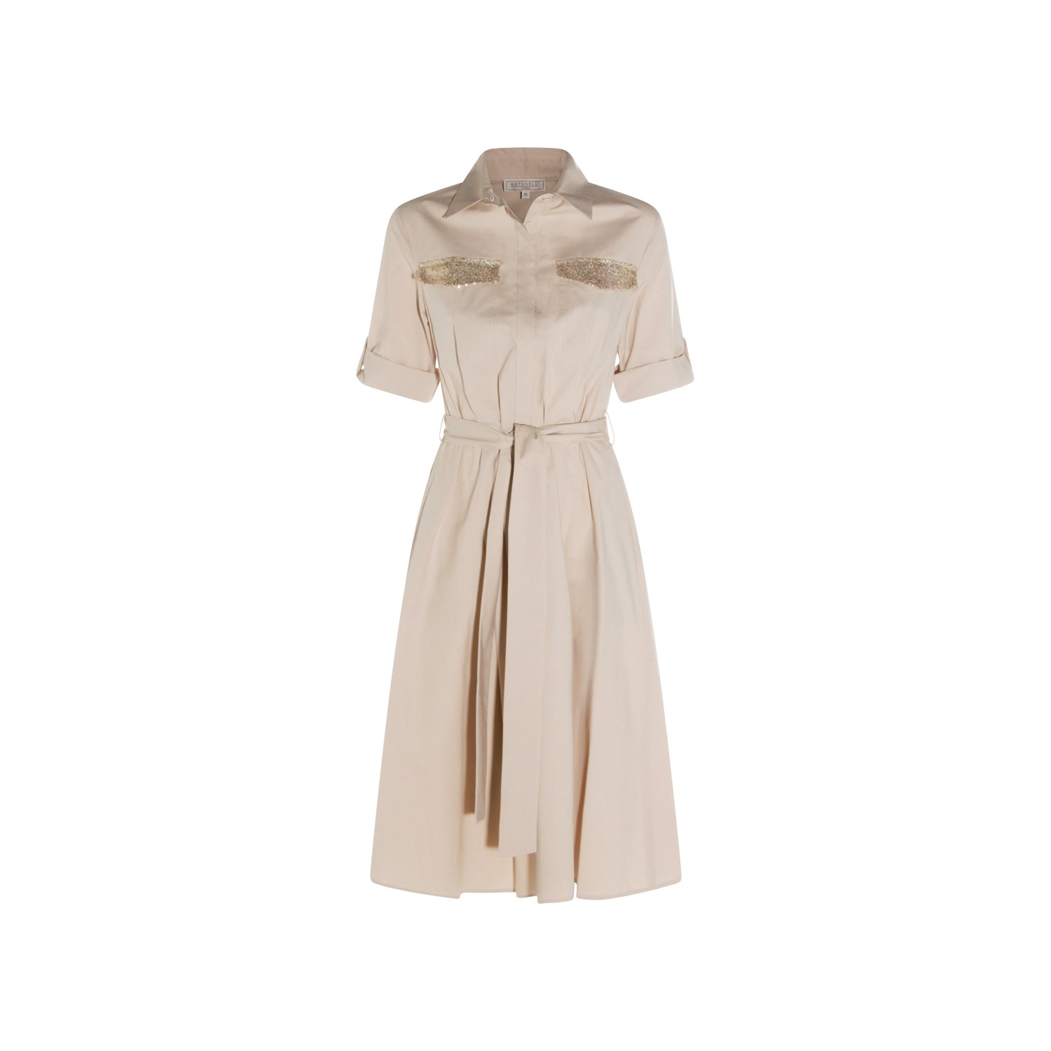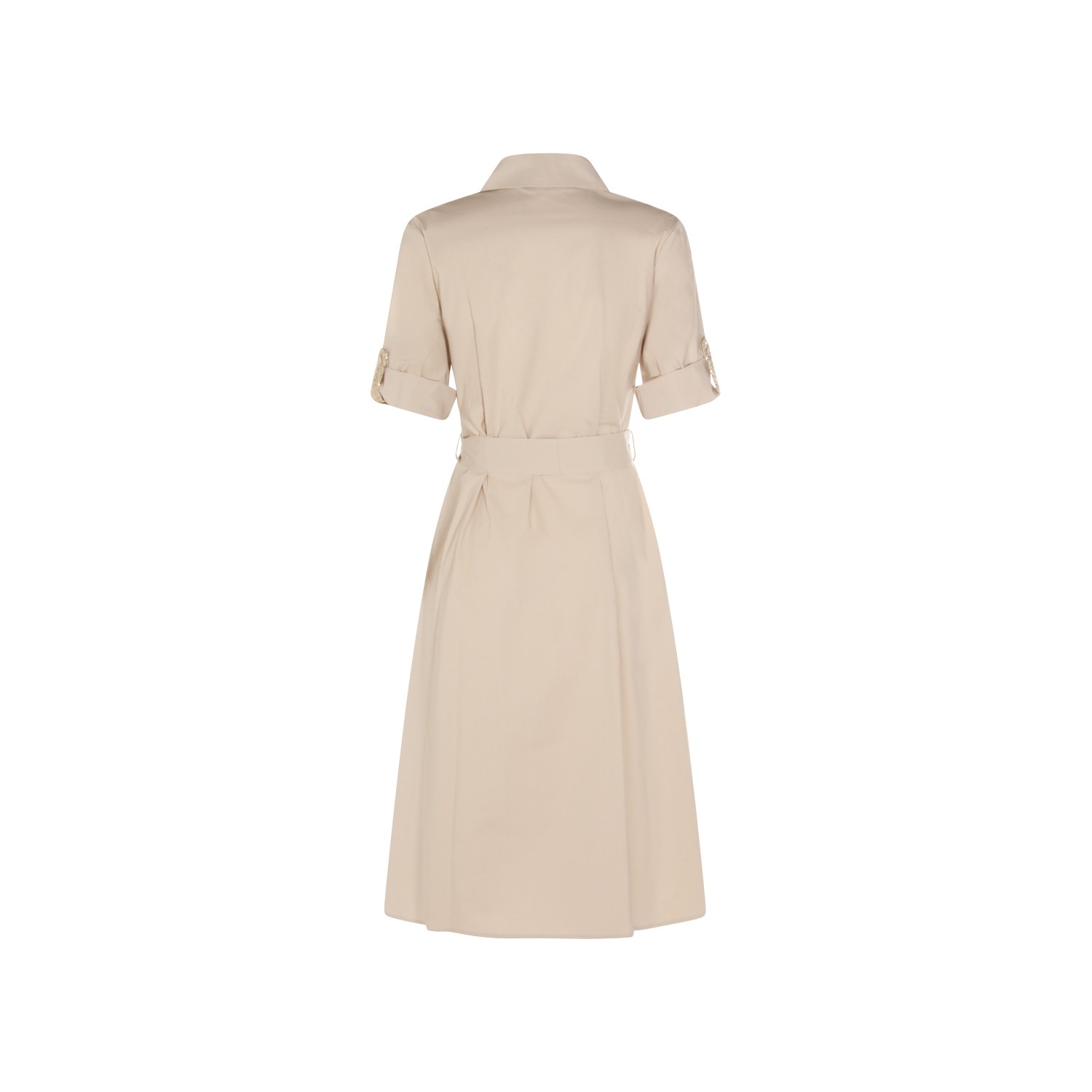 Beige cotton dress from Antonelli Firenze featuring classic collar, short sleeves, matchy belt waist, soft vestibility and midi lenght.