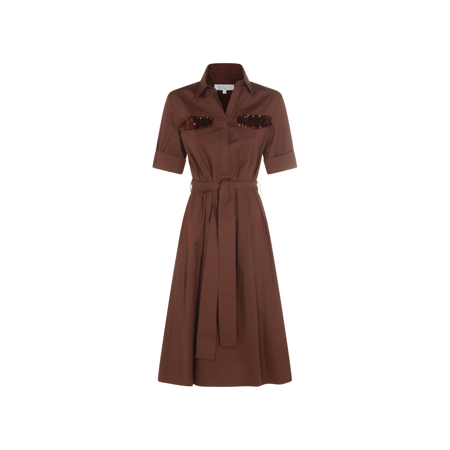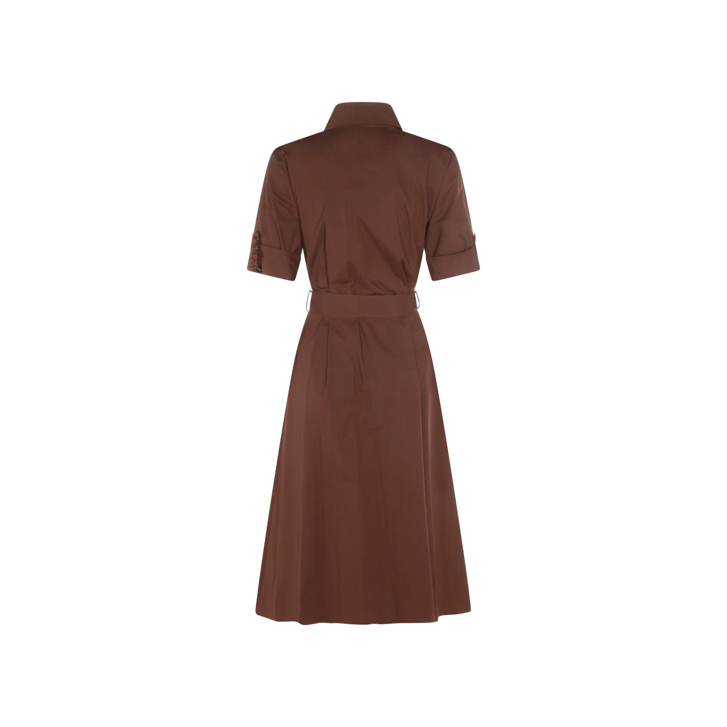 Brown cotton dress from Antonelli Firenze featuring v neck, classic collar, short sleeves, matchy belt waist and midi lenght.