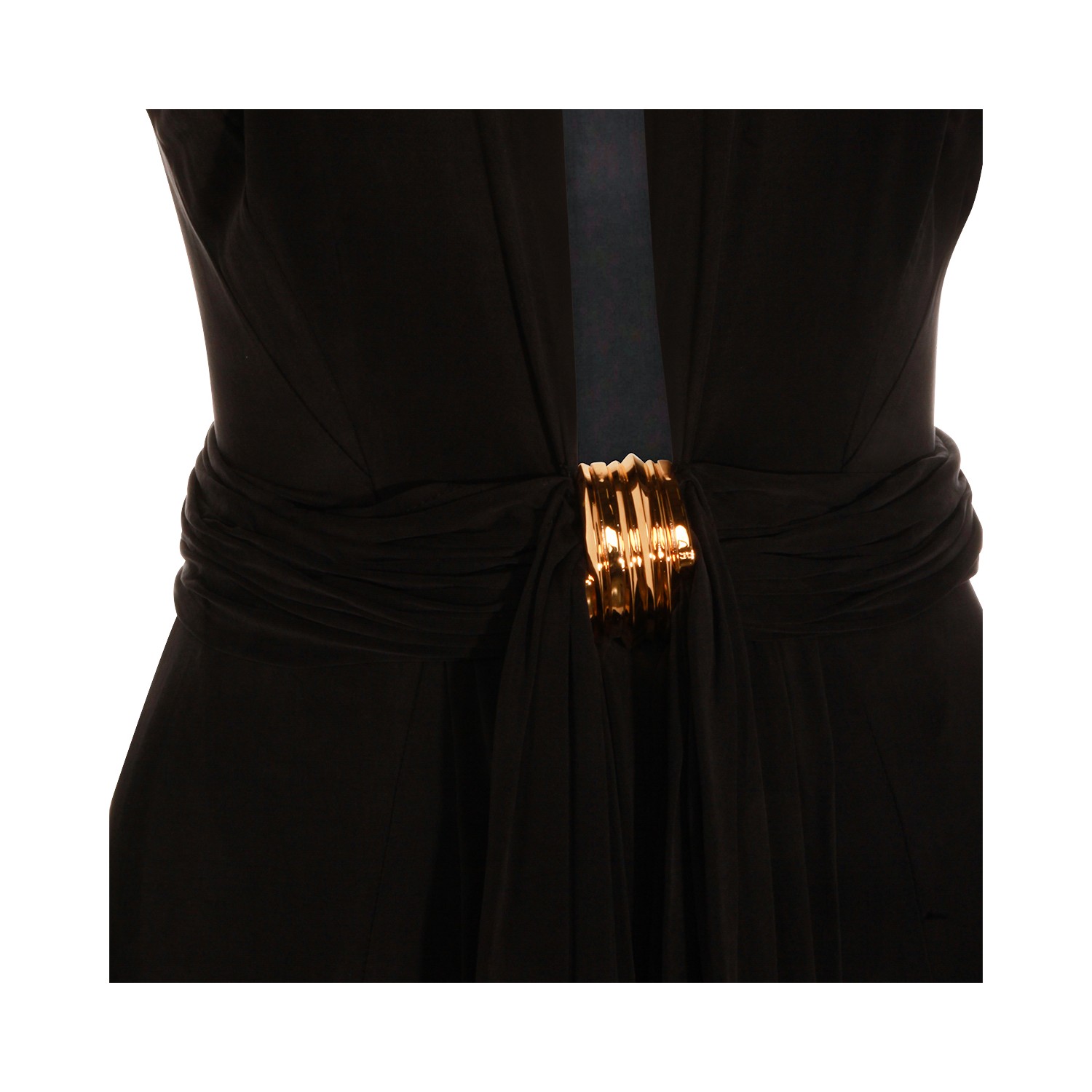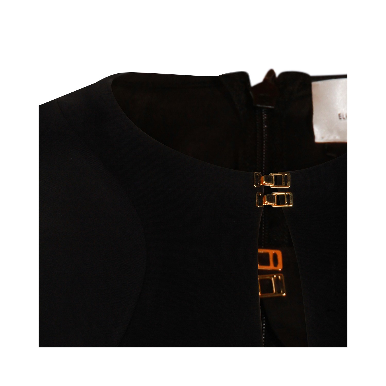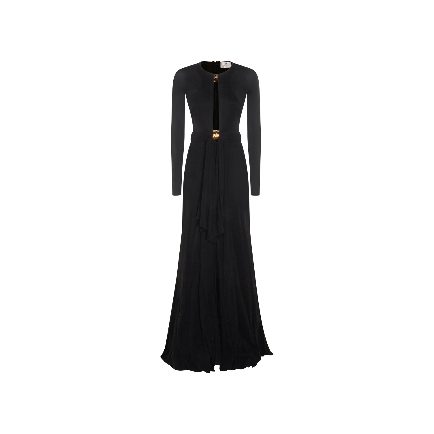 Black dress from Elisabetta Franchi featuring round collar, frontal drop, long sleeves, gold metal details, slit and long lenght.