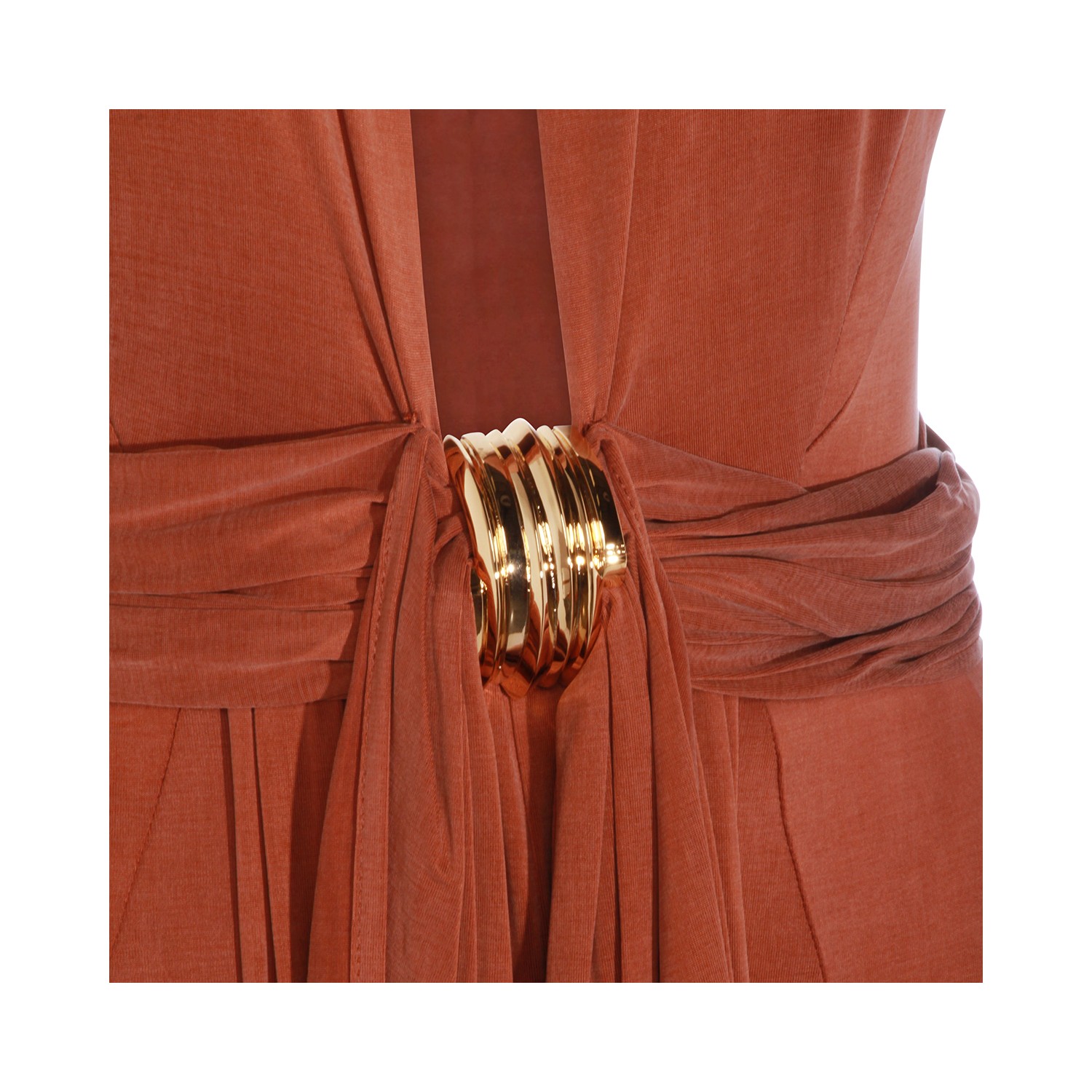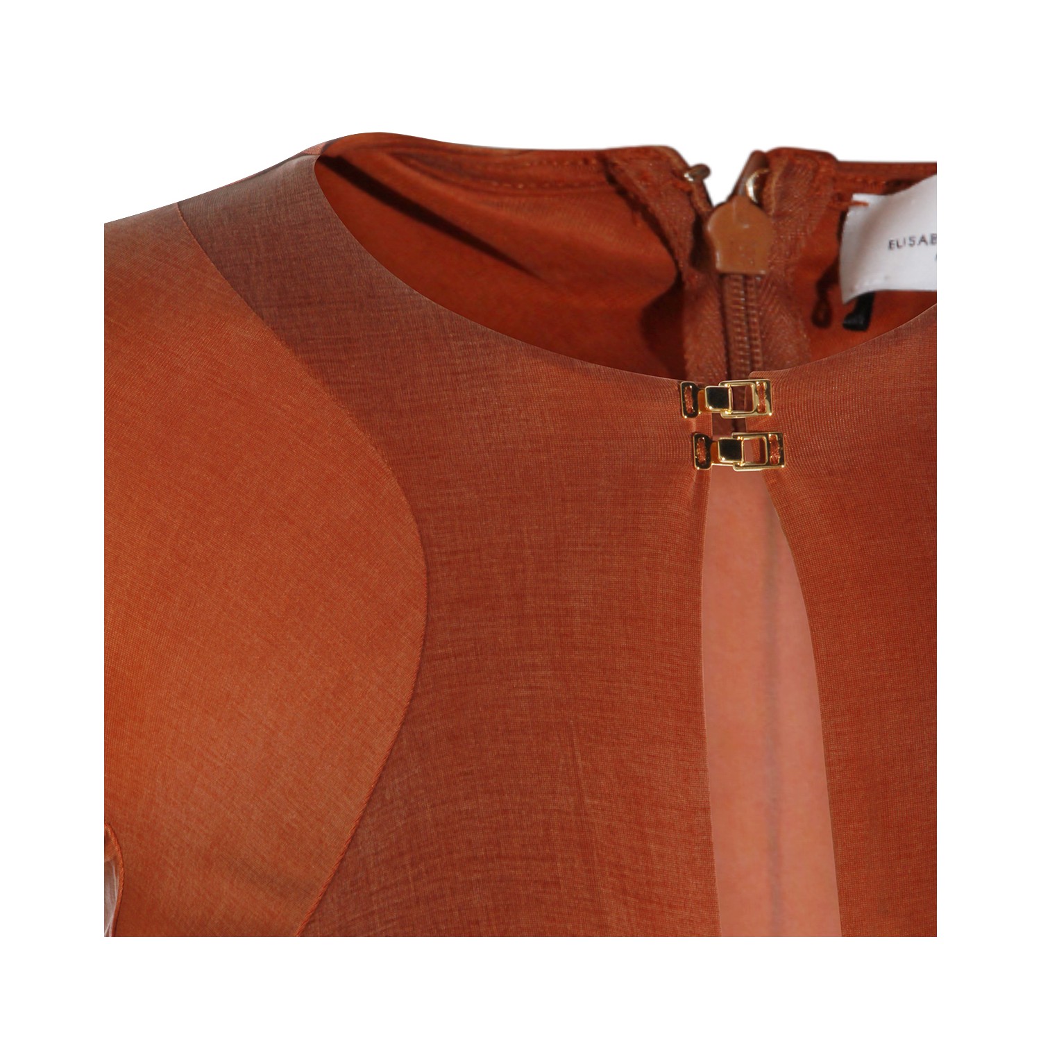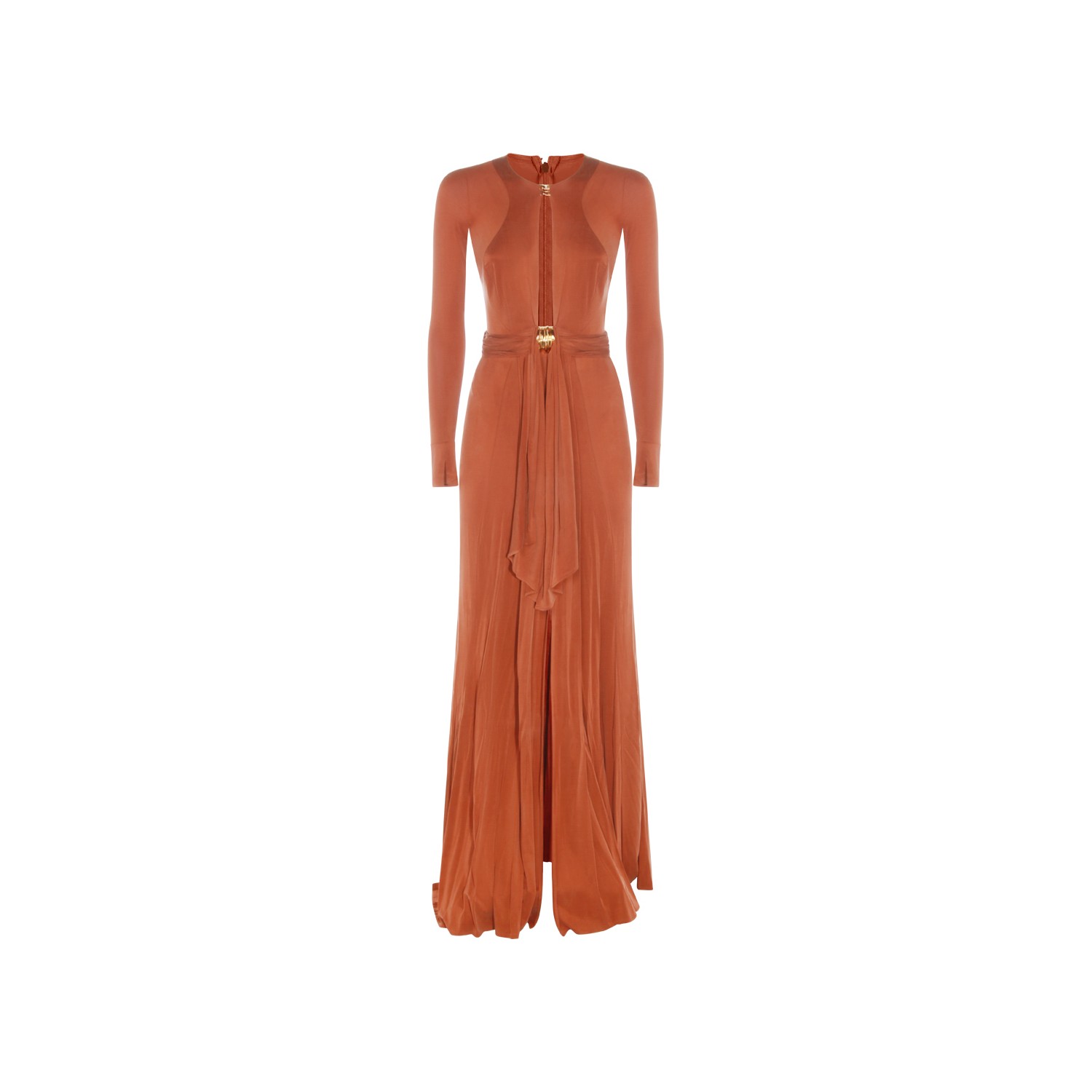 Brick dress from Elisabetta Franchi featuring round collar, frontal drop, long sleeves, gold metal details, slit and long lenght.