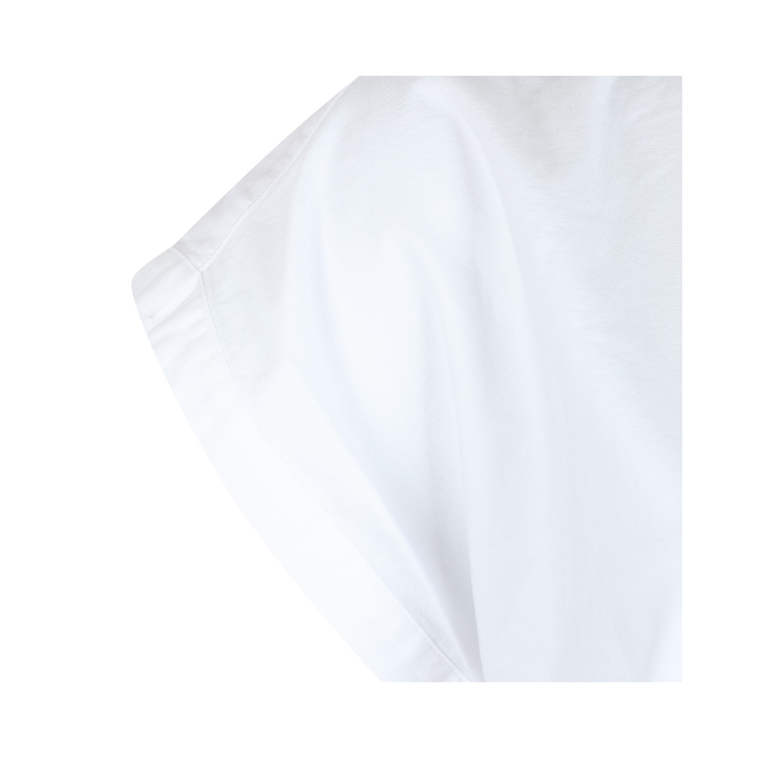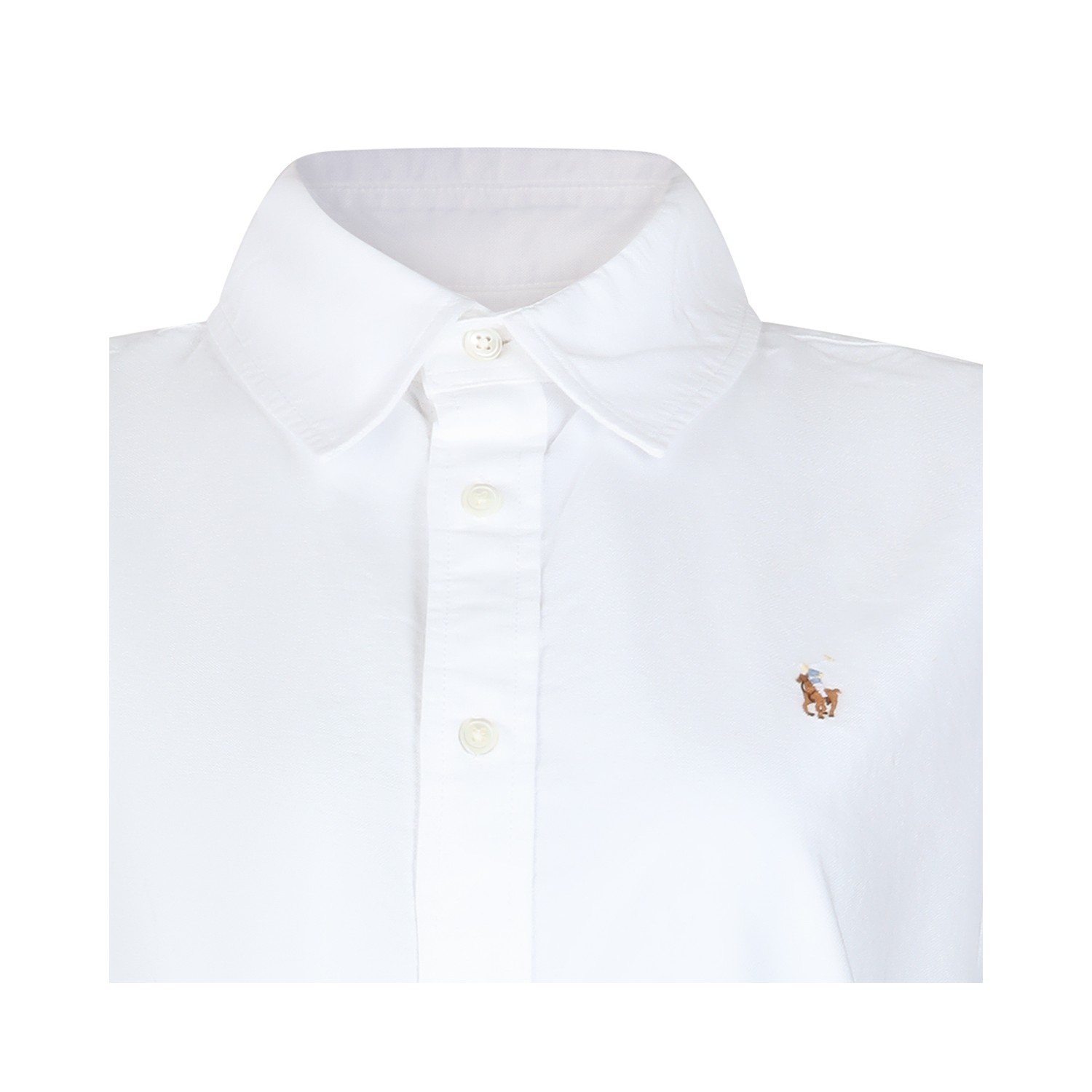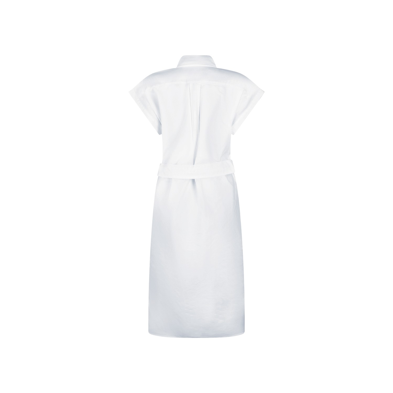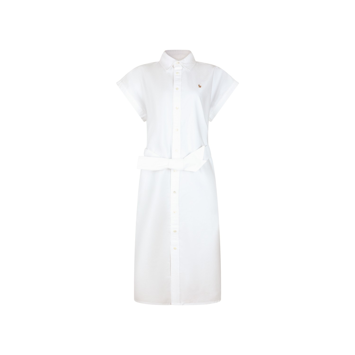White cotton dress from Polo Ralph Lauren featuring polo shirt collar, short sleeves, embroidered logo, frontal buttons fastening, matchy belt waist and midi lenght.