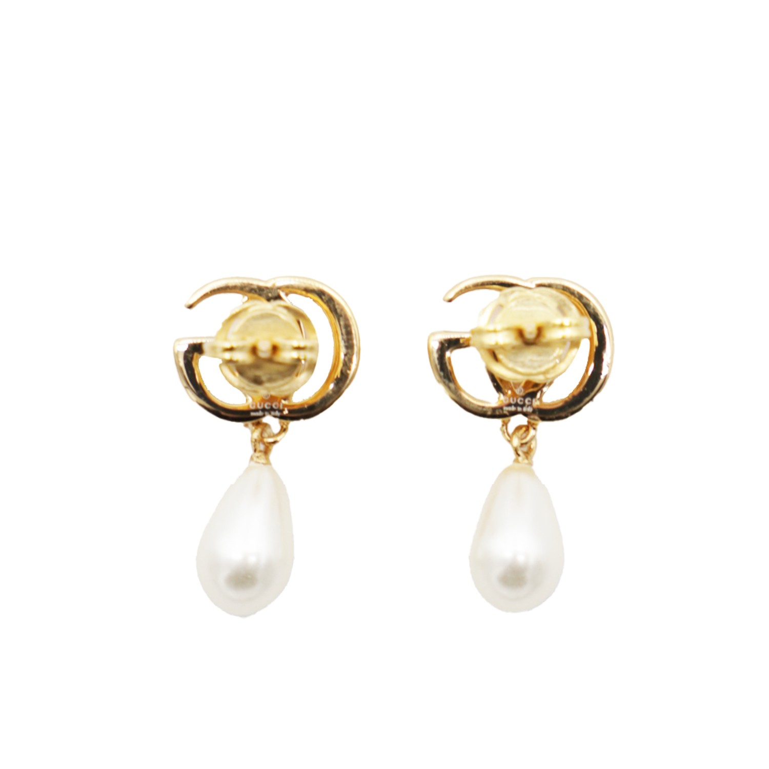 White and gold brass earrings from Gucci featuring pearl, logo and back fastening.