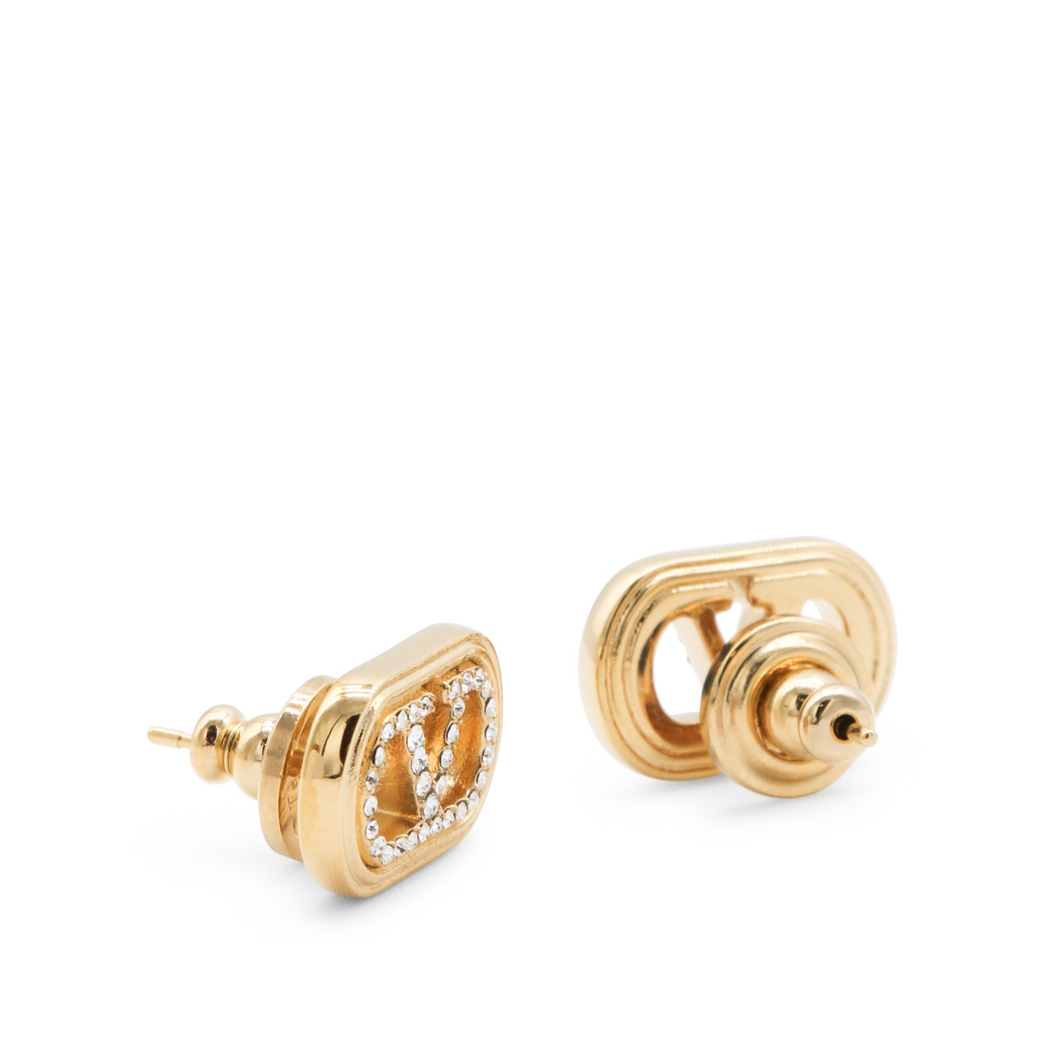 Gold and crystal earrings from Valentino Garavani featuring gold tone logo, back fastening and crystal details.