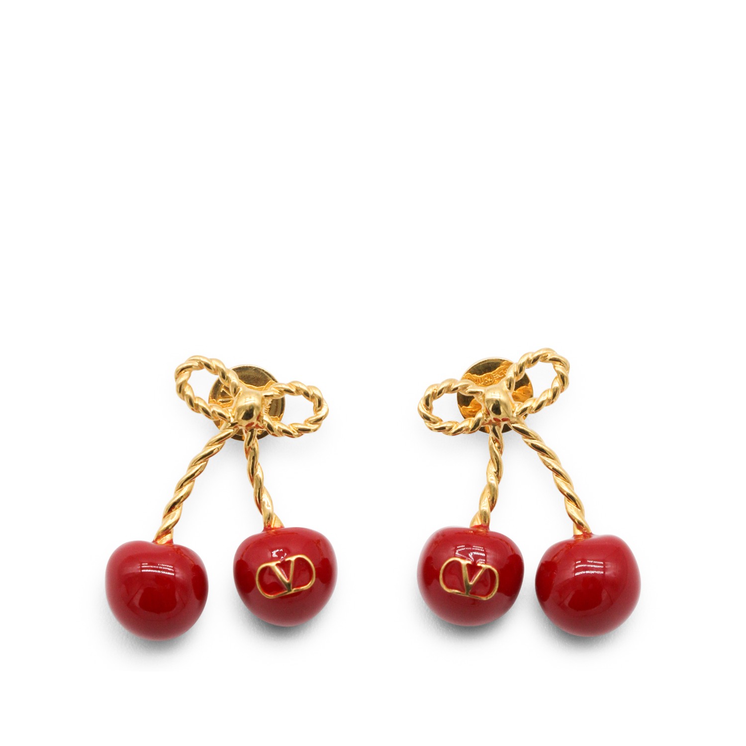 Gold and red brass earrings from Valentino Garavani featuring cherry shape, gold tone hardware and logo.