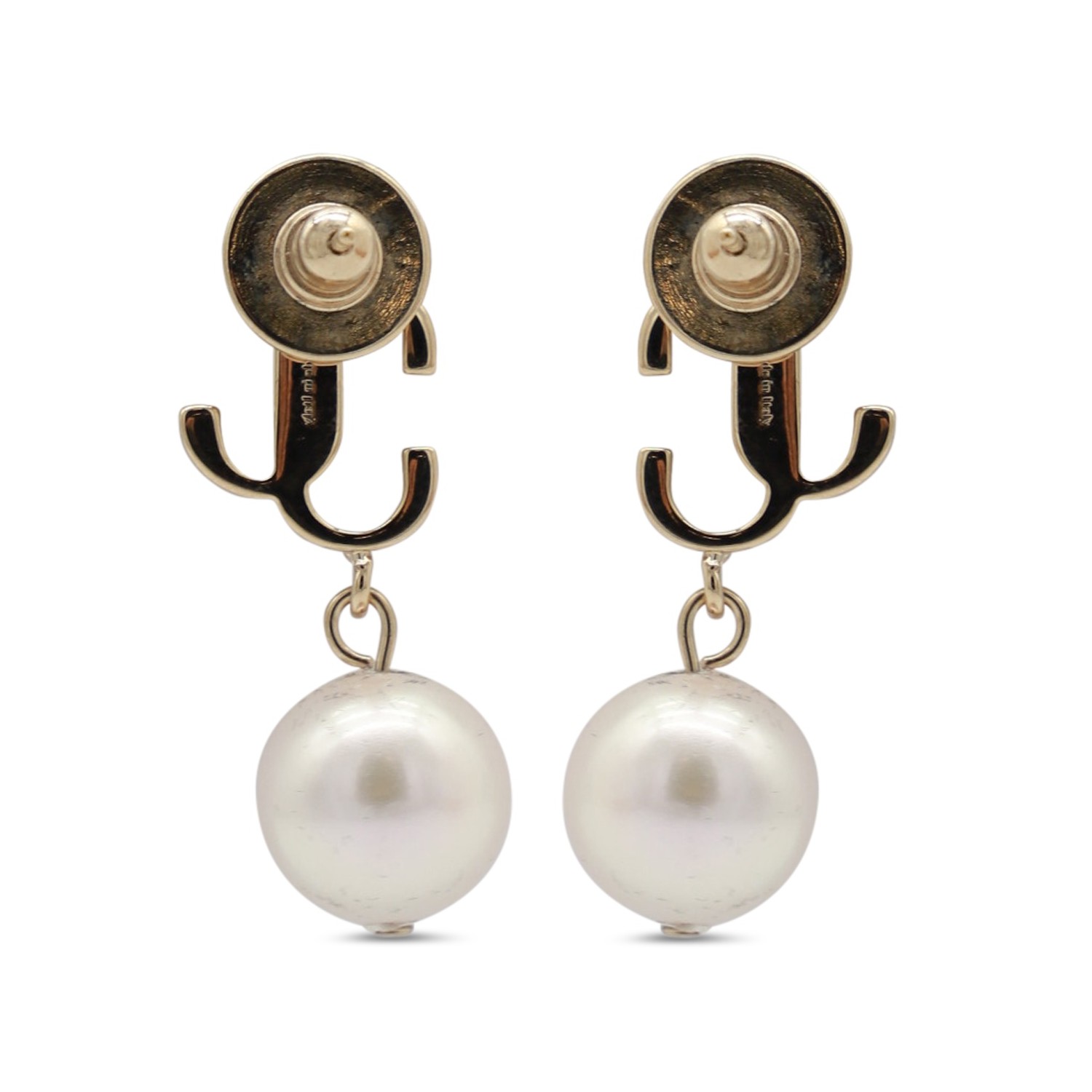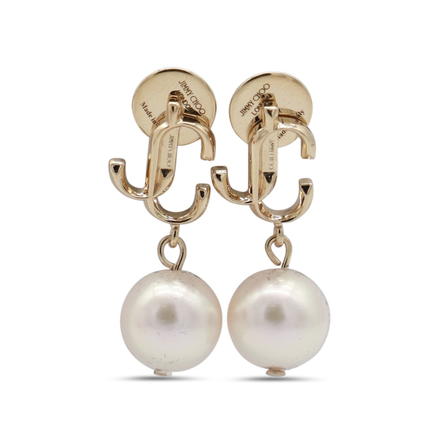 Gold tone brass earrings from Jimmy Choo featuring gold tone, back fastening, pearl and logo.