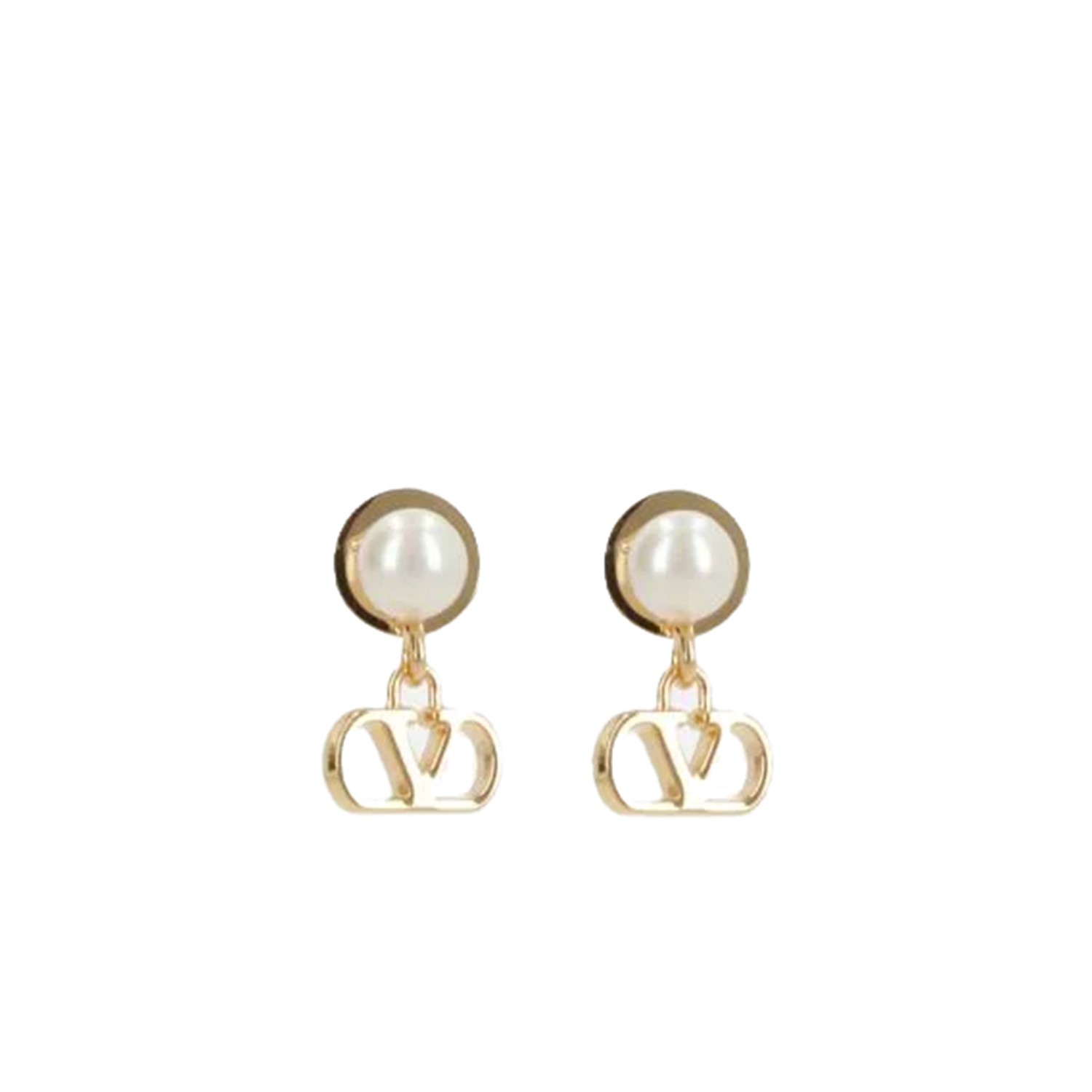 Gold and pearl earrings from Valentino Garavani featuring resin pears, Vlogo pendant, pin closure and gold tone hardware.