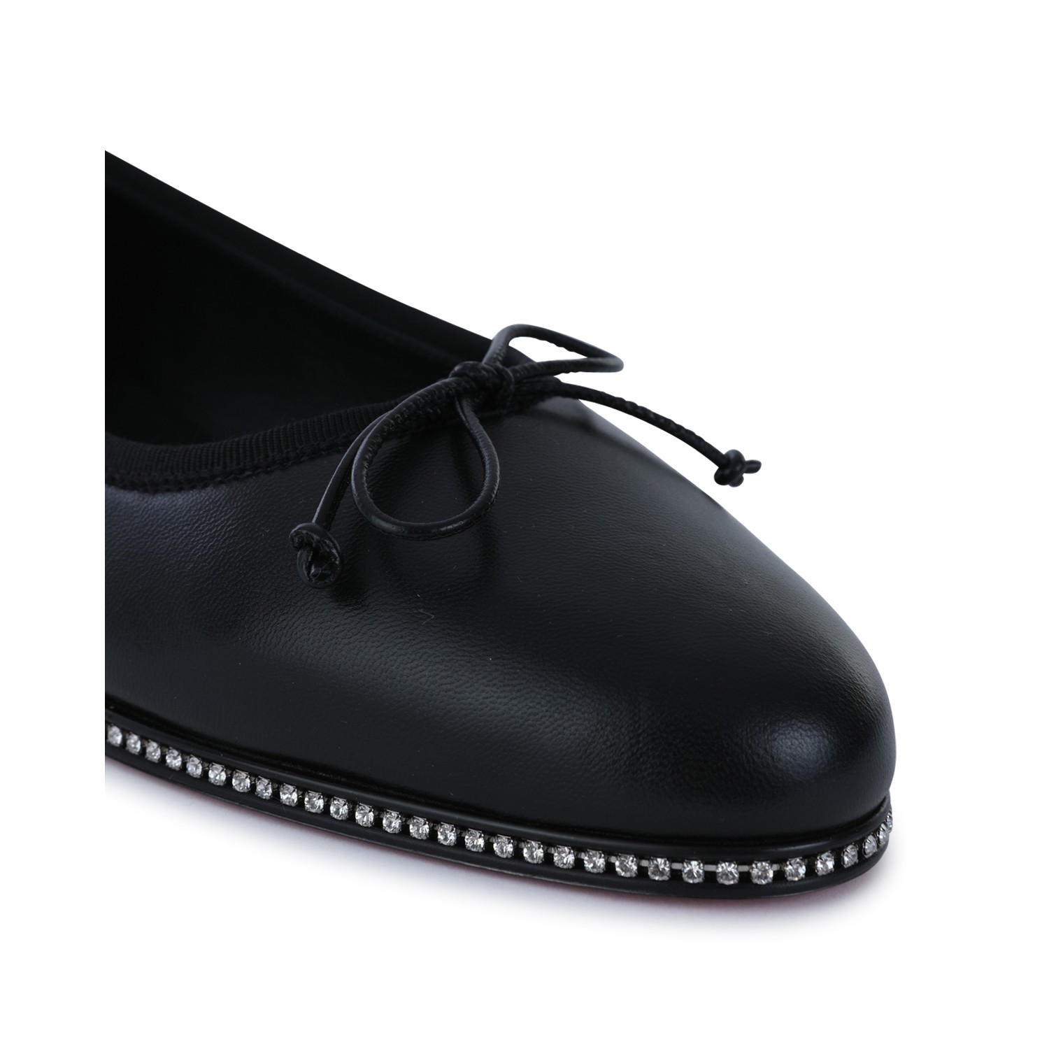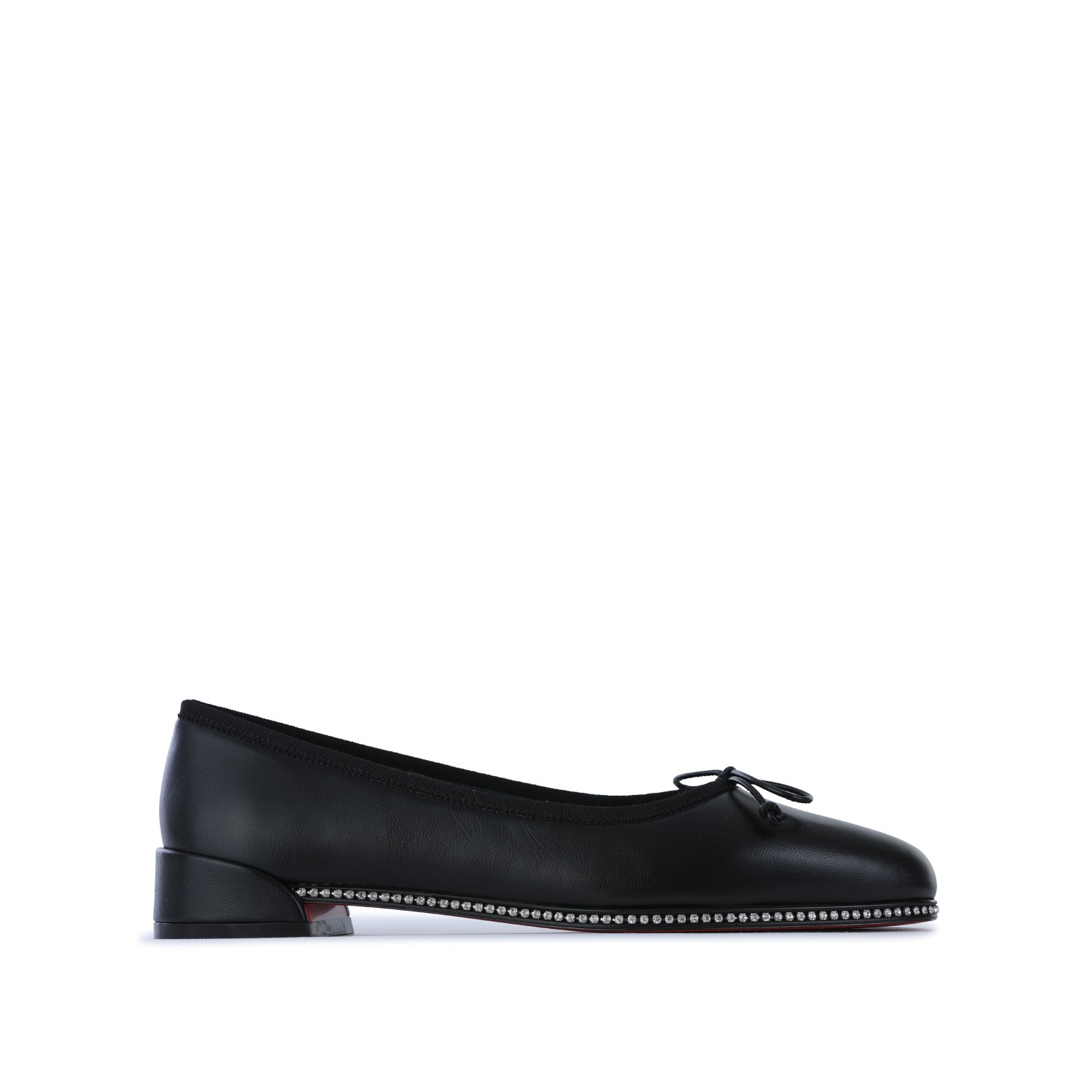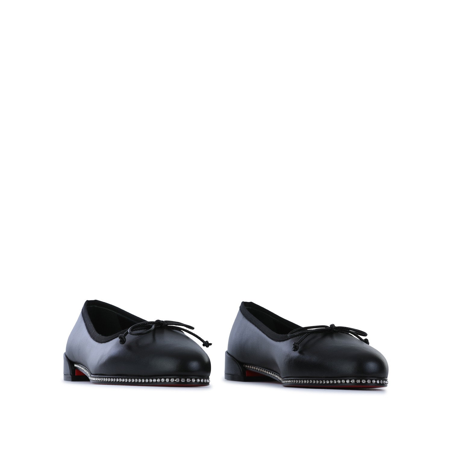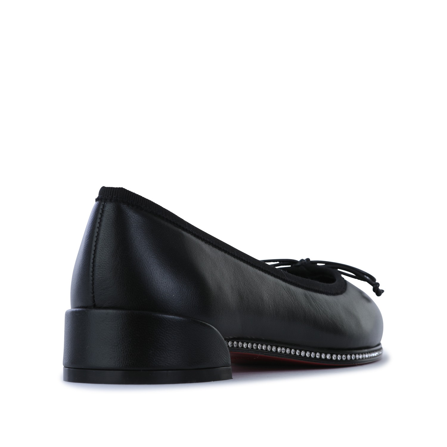 Black leather Sweetie Strass flats from Christian Louboutin featuring round toe, front bow, slip-on style, strass, branded insole and red leather sole.