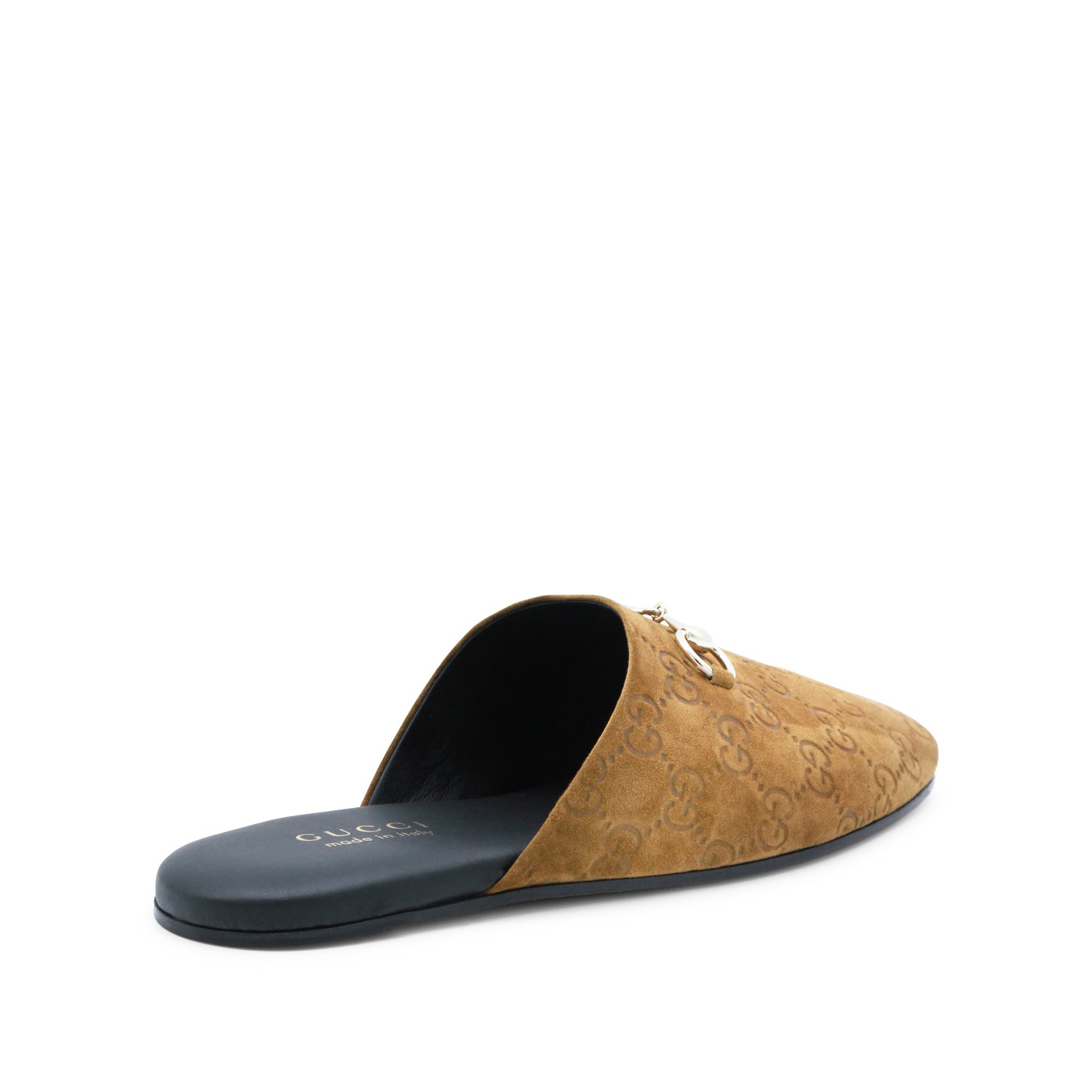 Brown leather flats from Gucci featuring round toe, all-ove GG texture, suede, slip-on style, open back, horsebit buckle detail and flat sole.