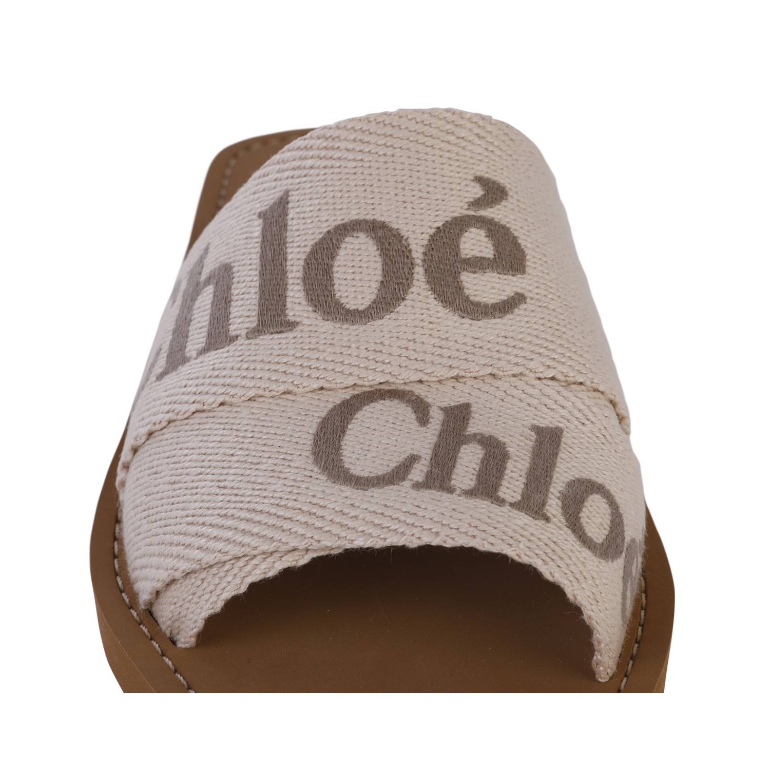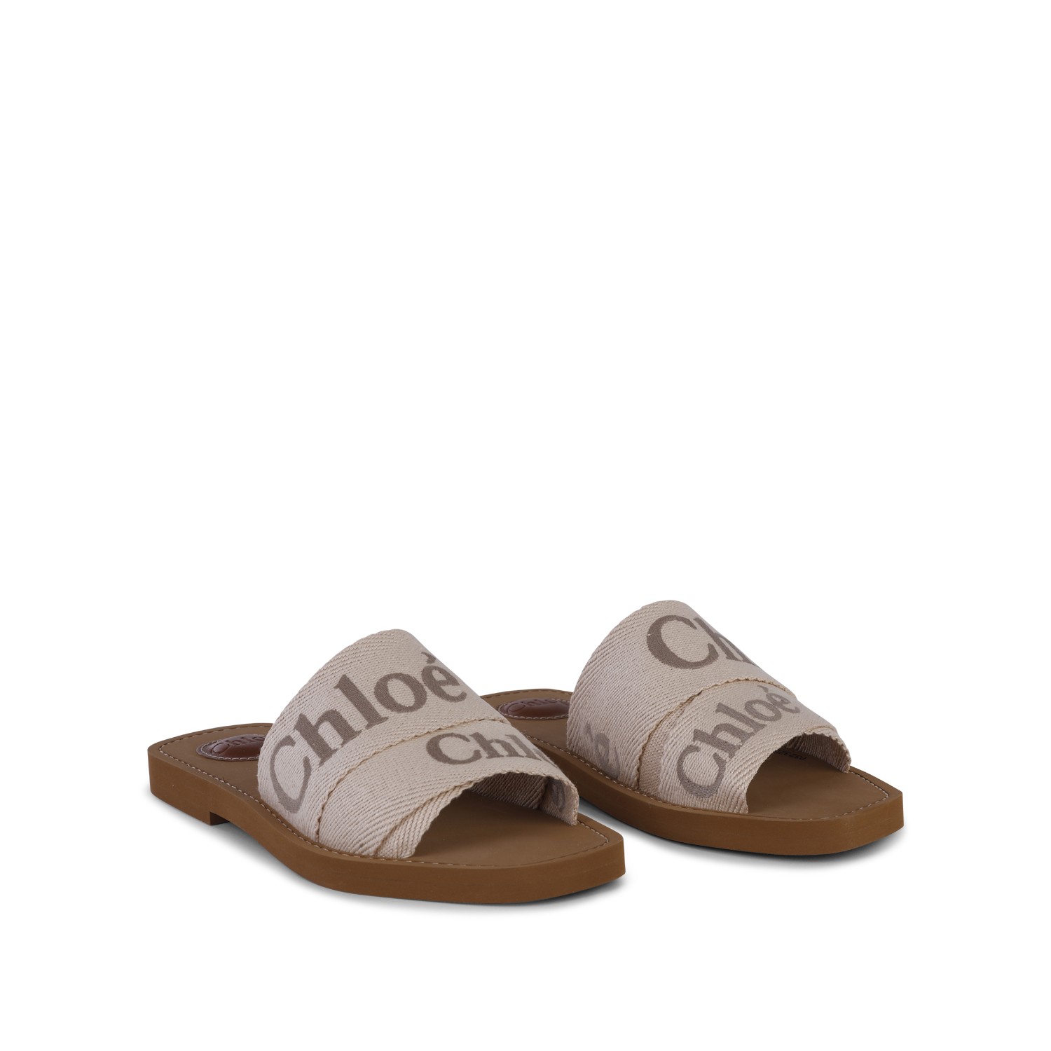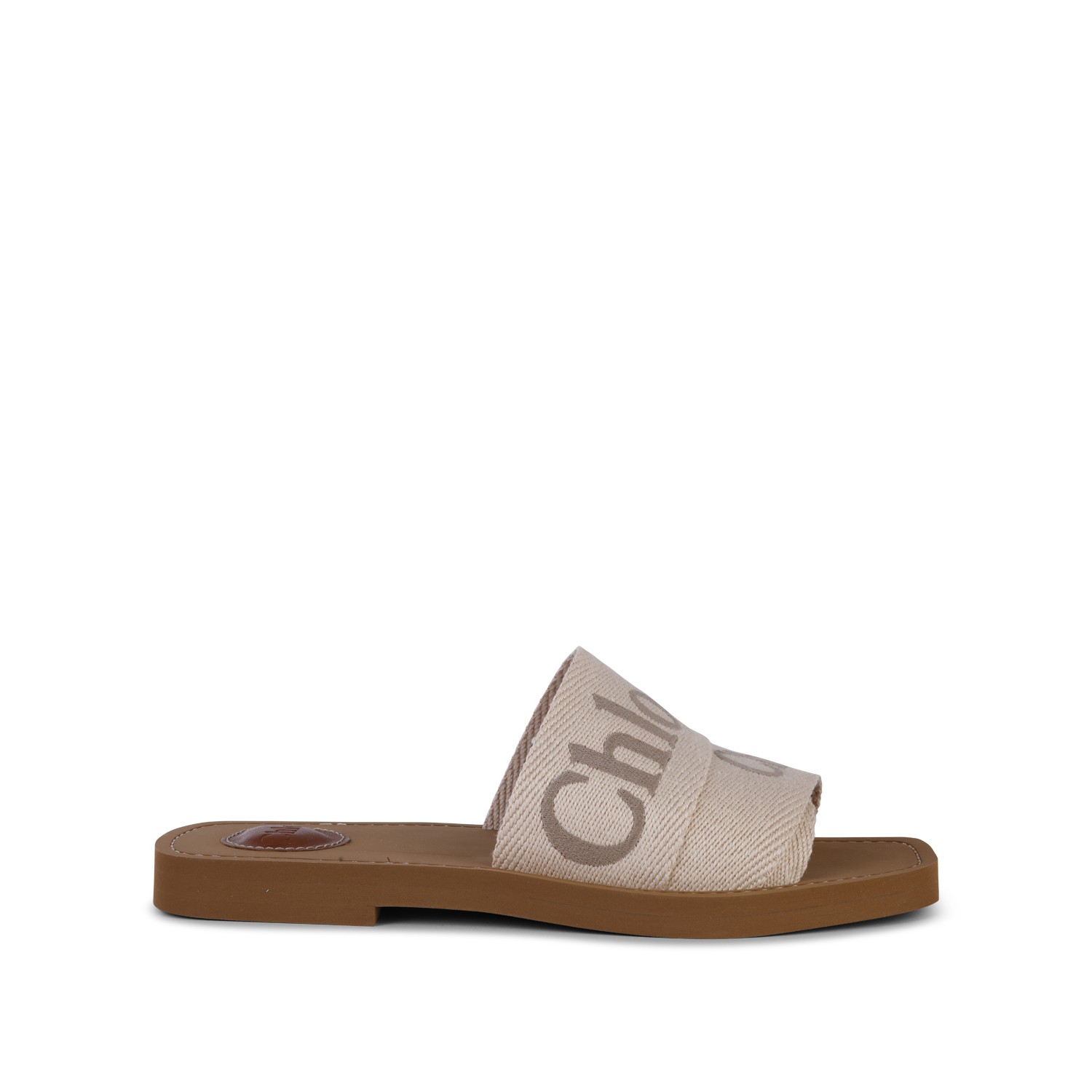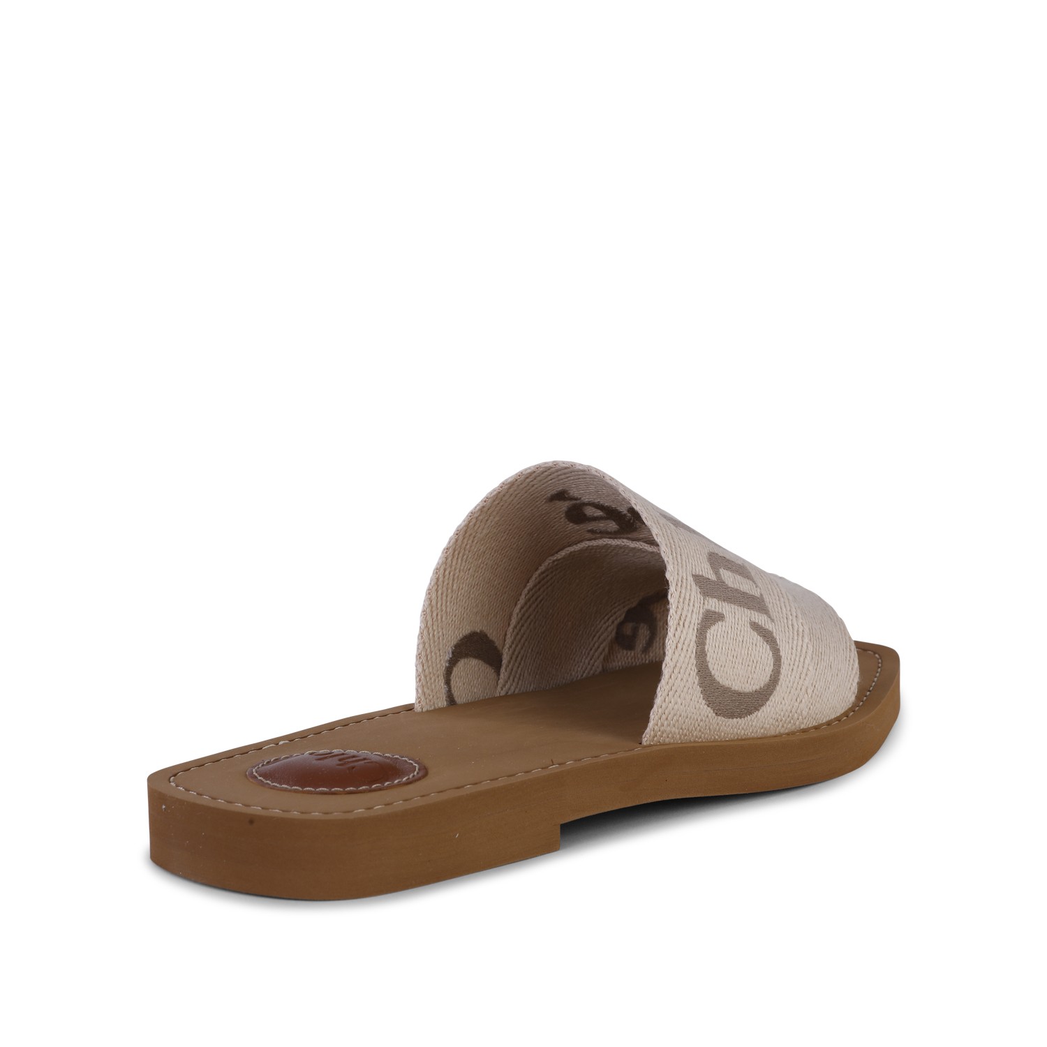 Blushy beige canvas Woody flats from Chlofeaturing slip-on style, round toe, open toe, flat sole and branded insole.