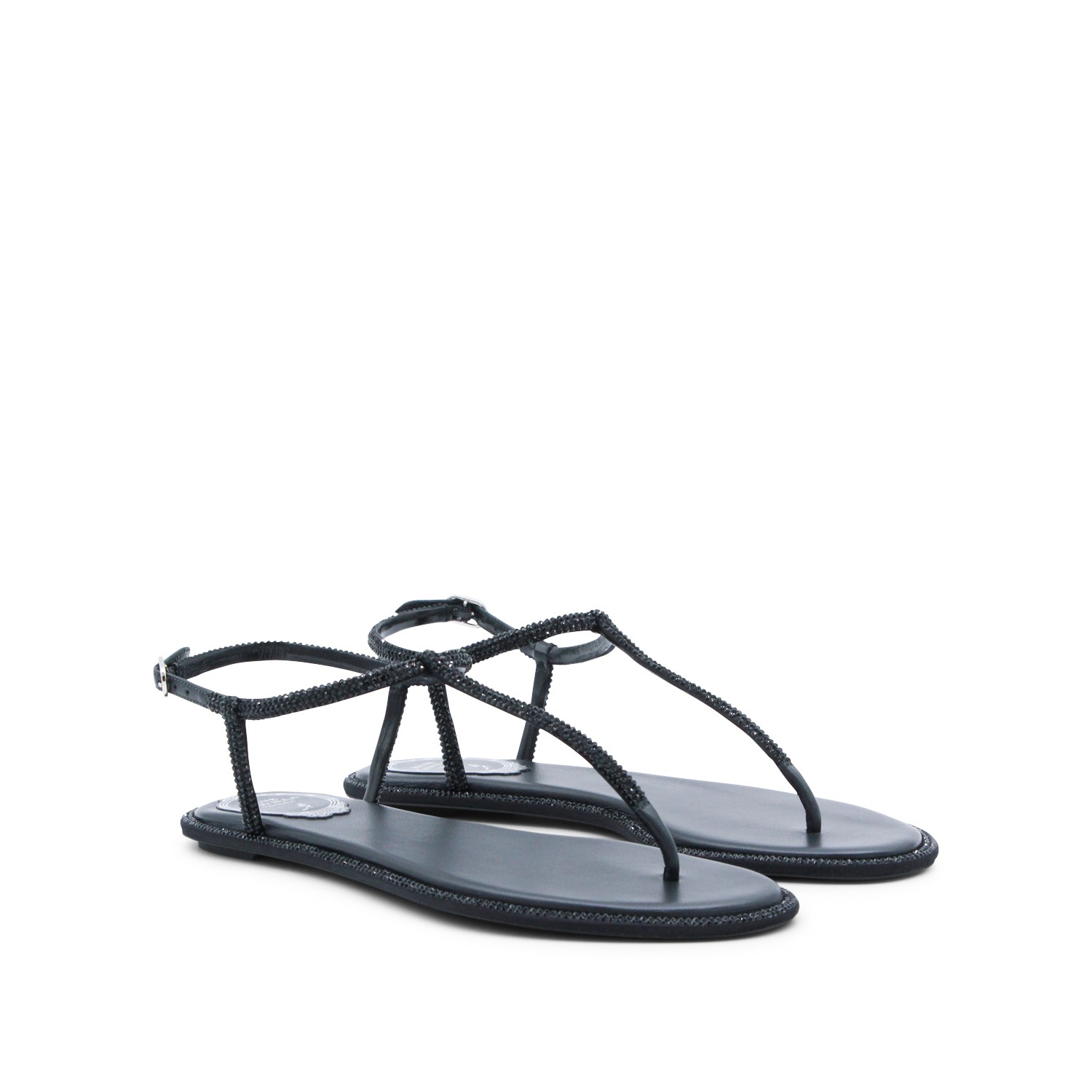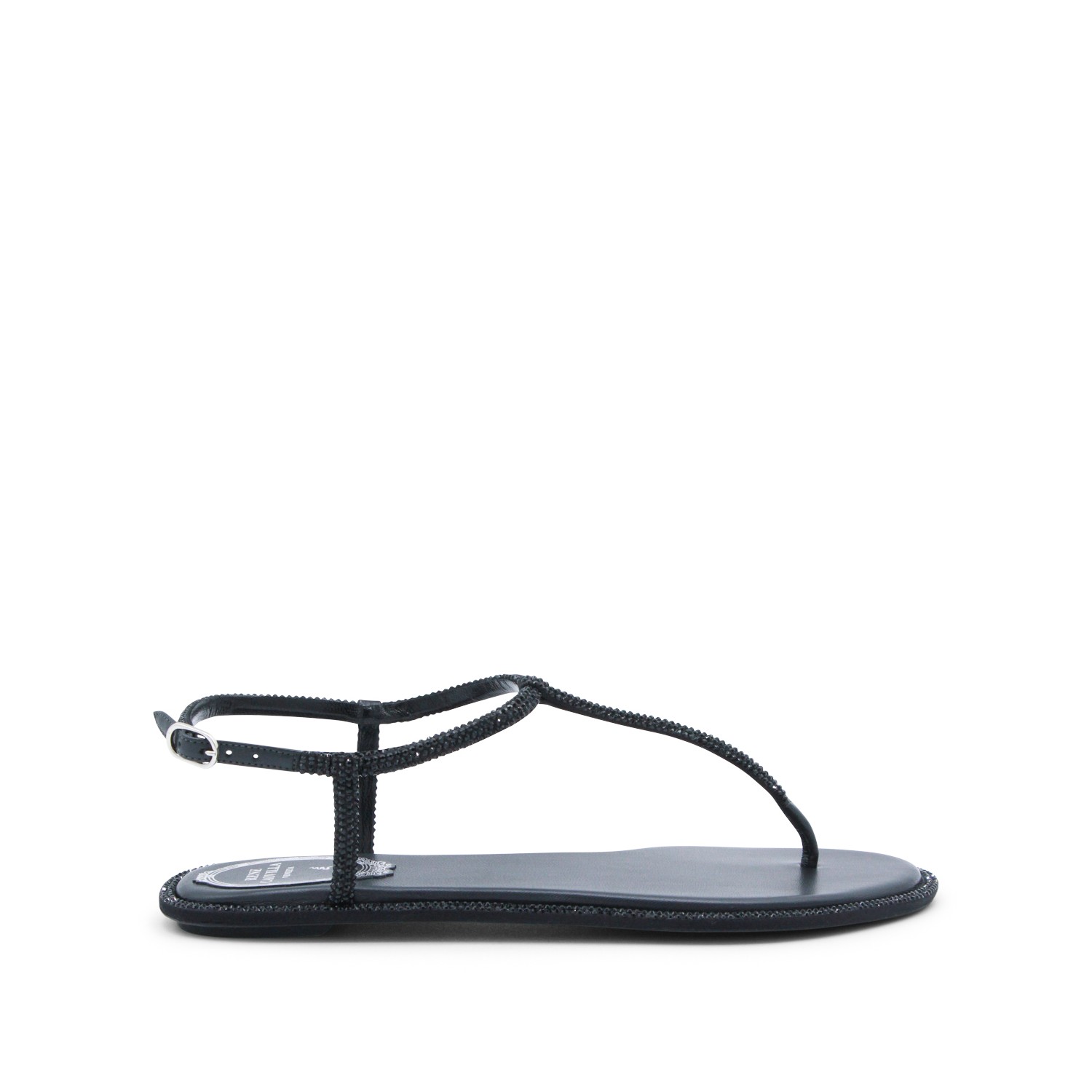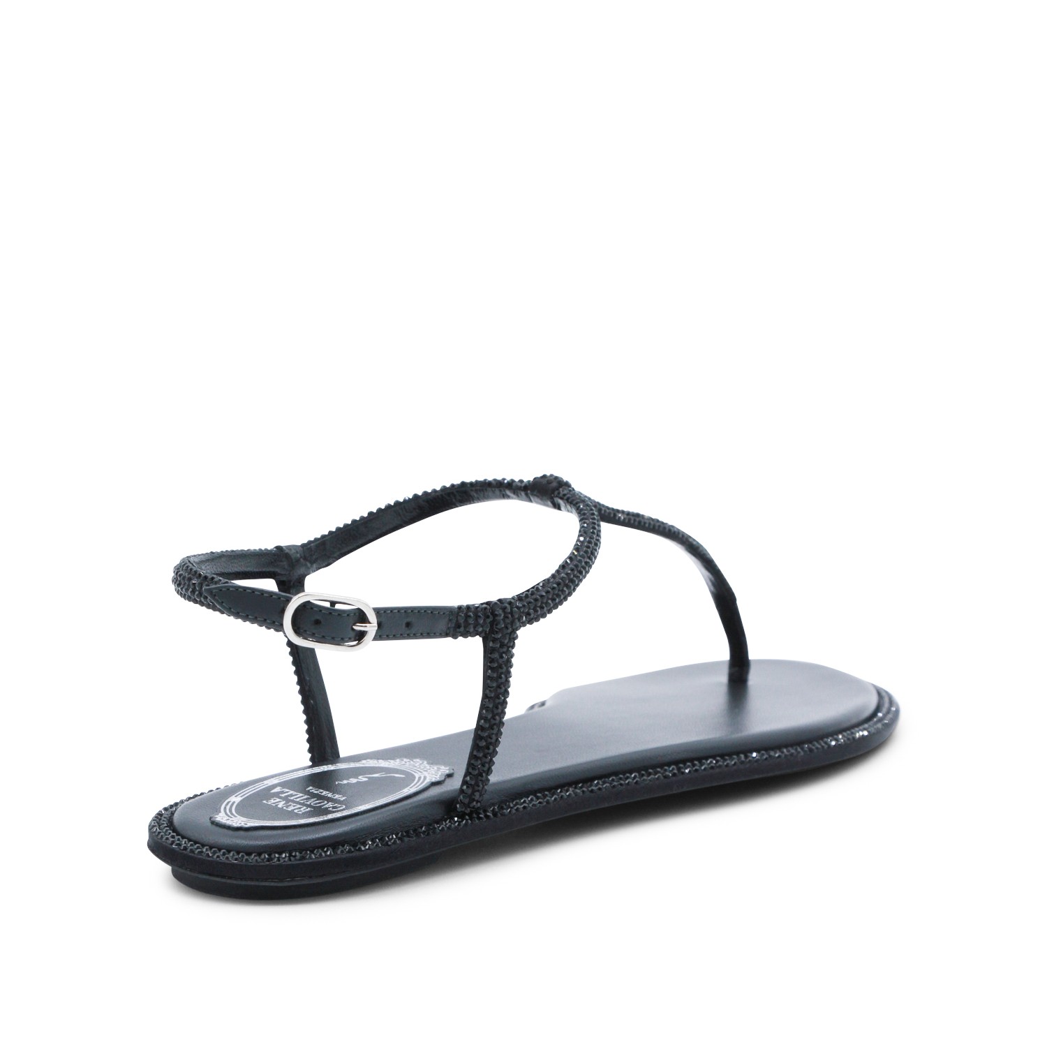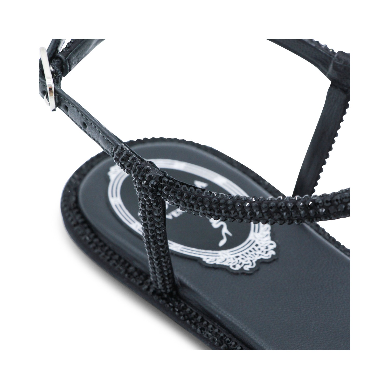 Black leather flats from RenCaovilla featuring round open toe, strass, buckle fastening and leather sole.