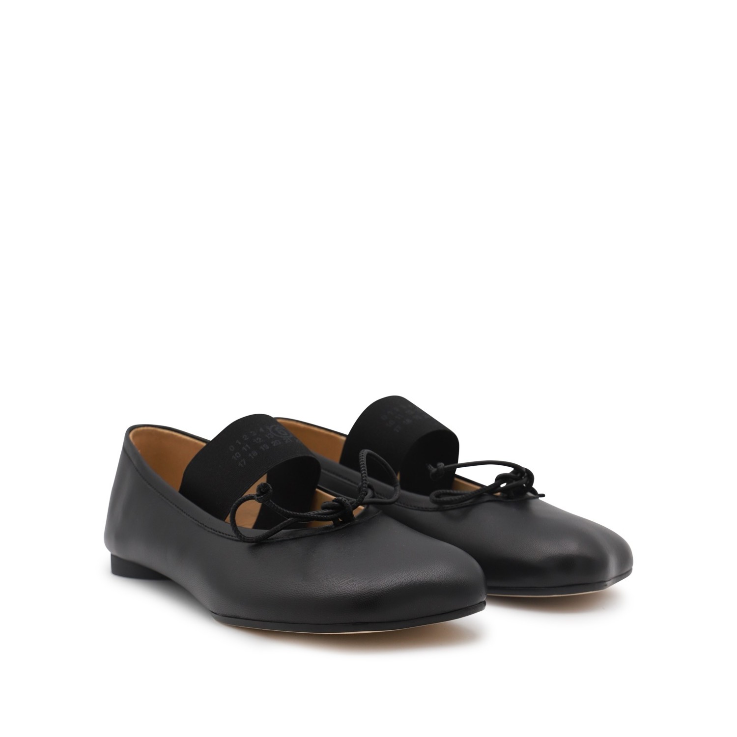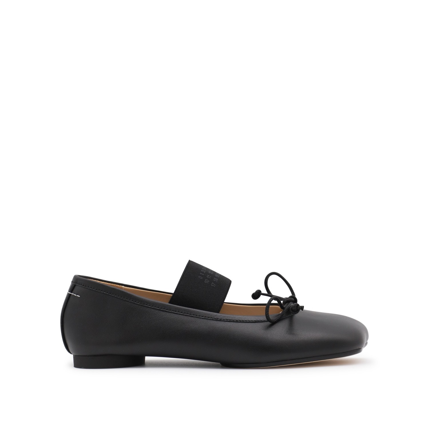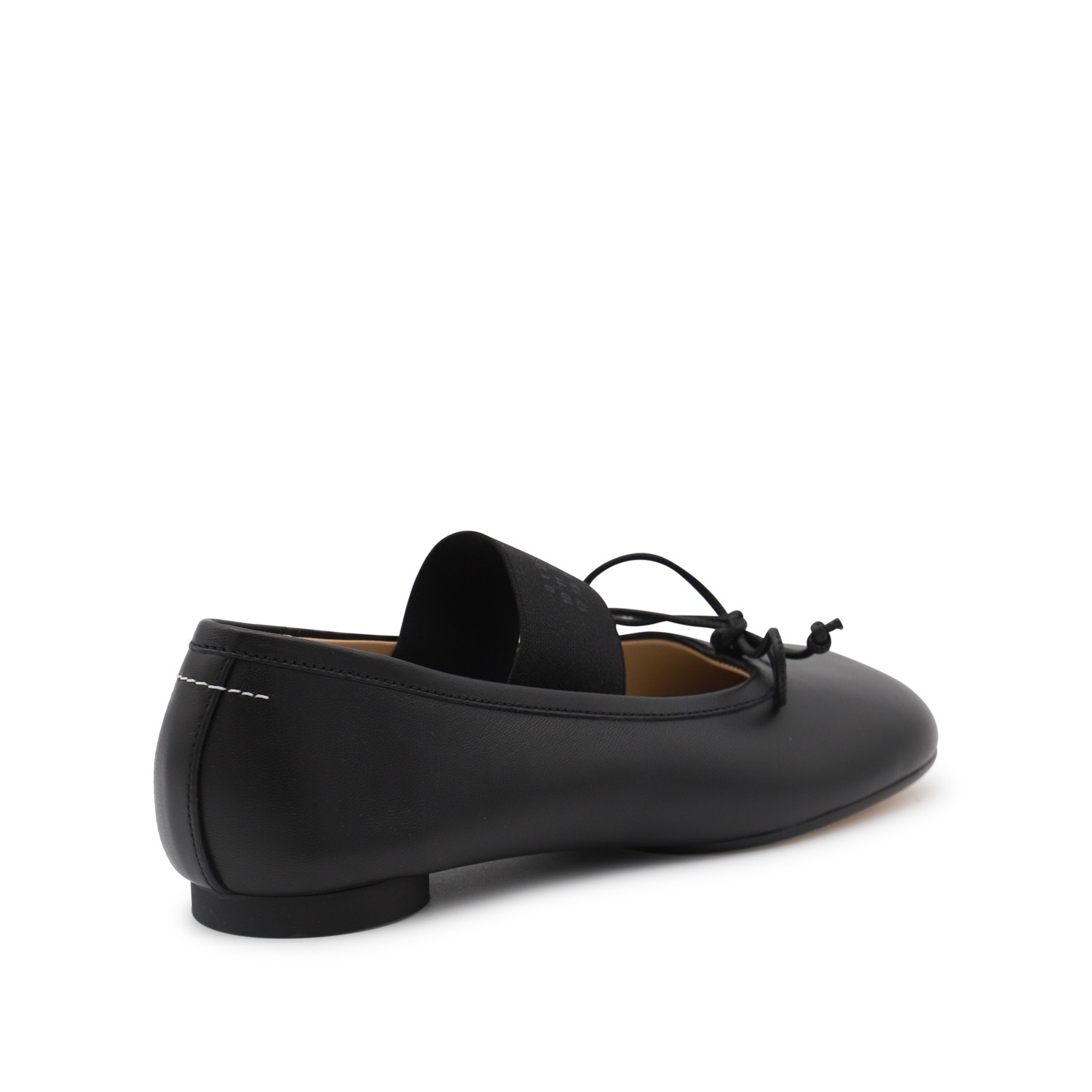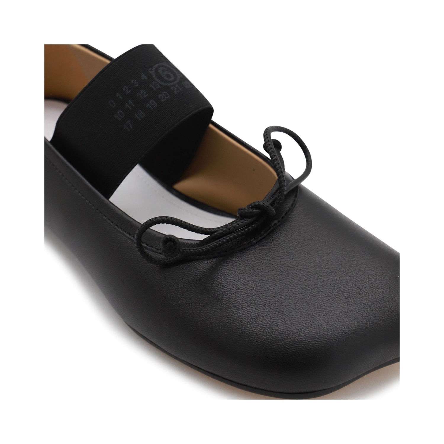Black leather flats from MM6 Maison Margiela featuring square toe, slip-on style, ribbon, elasticated band, white stitching on the back and leather sole.