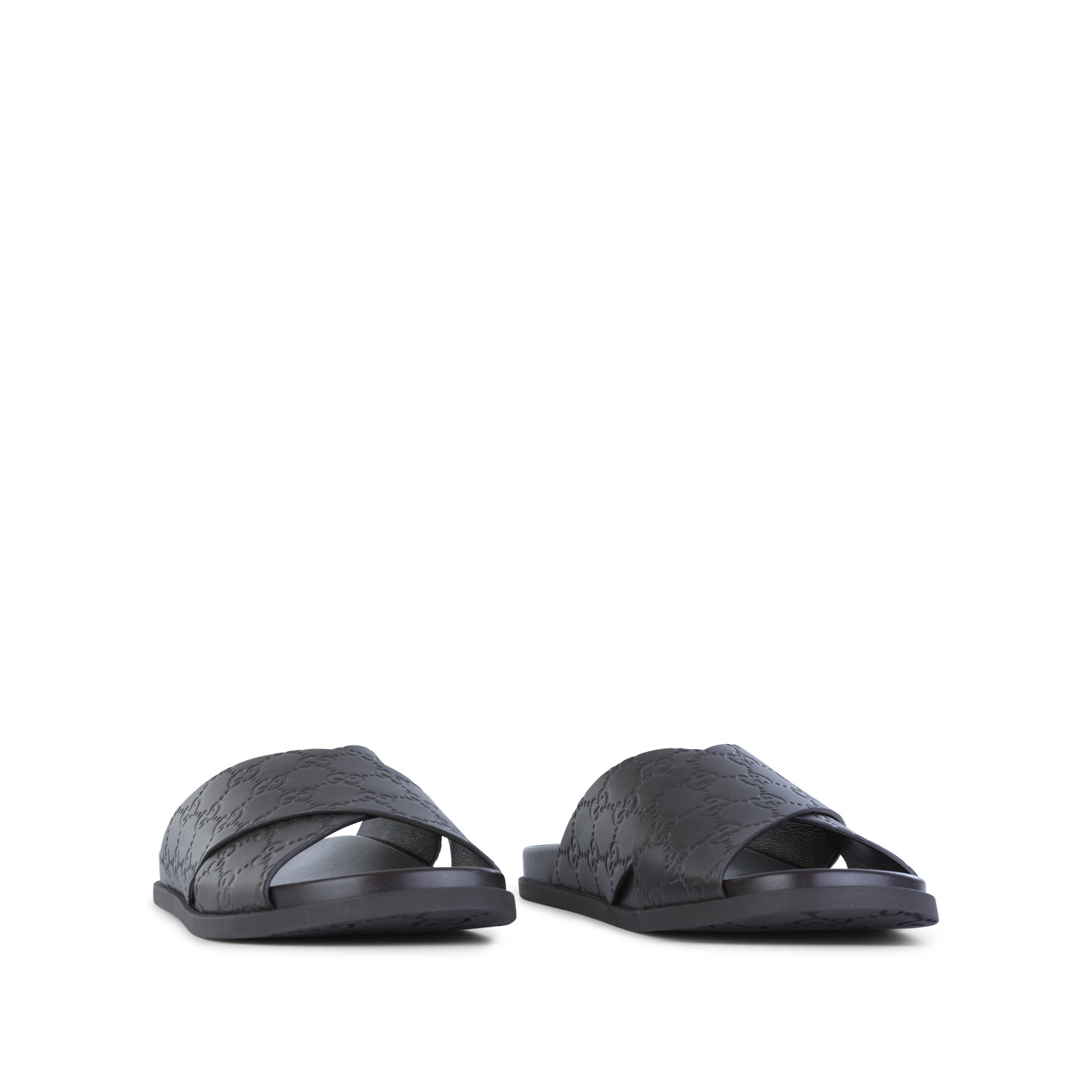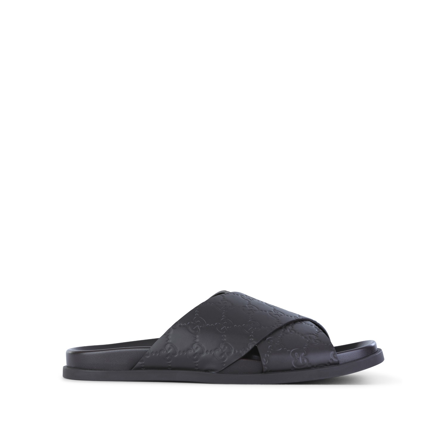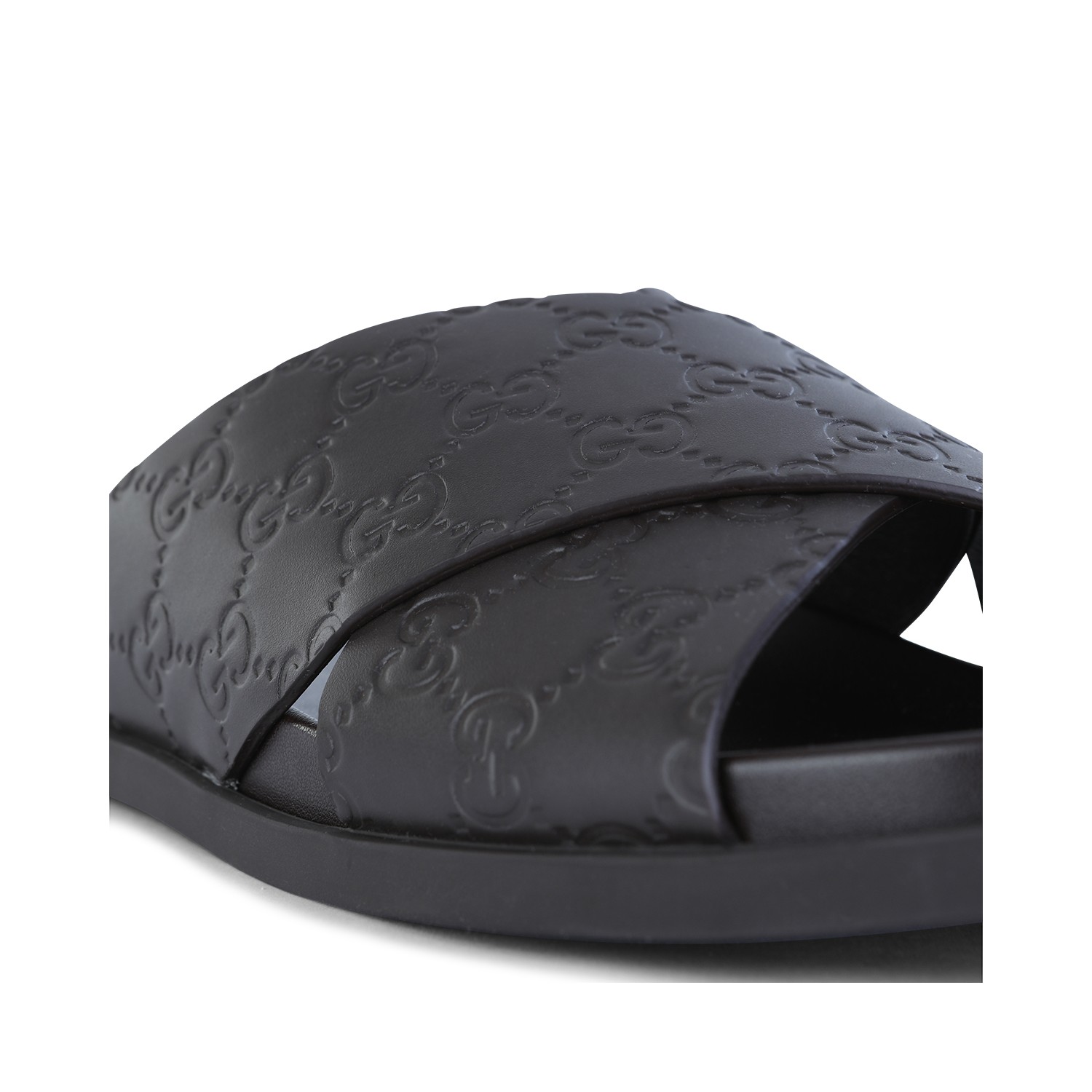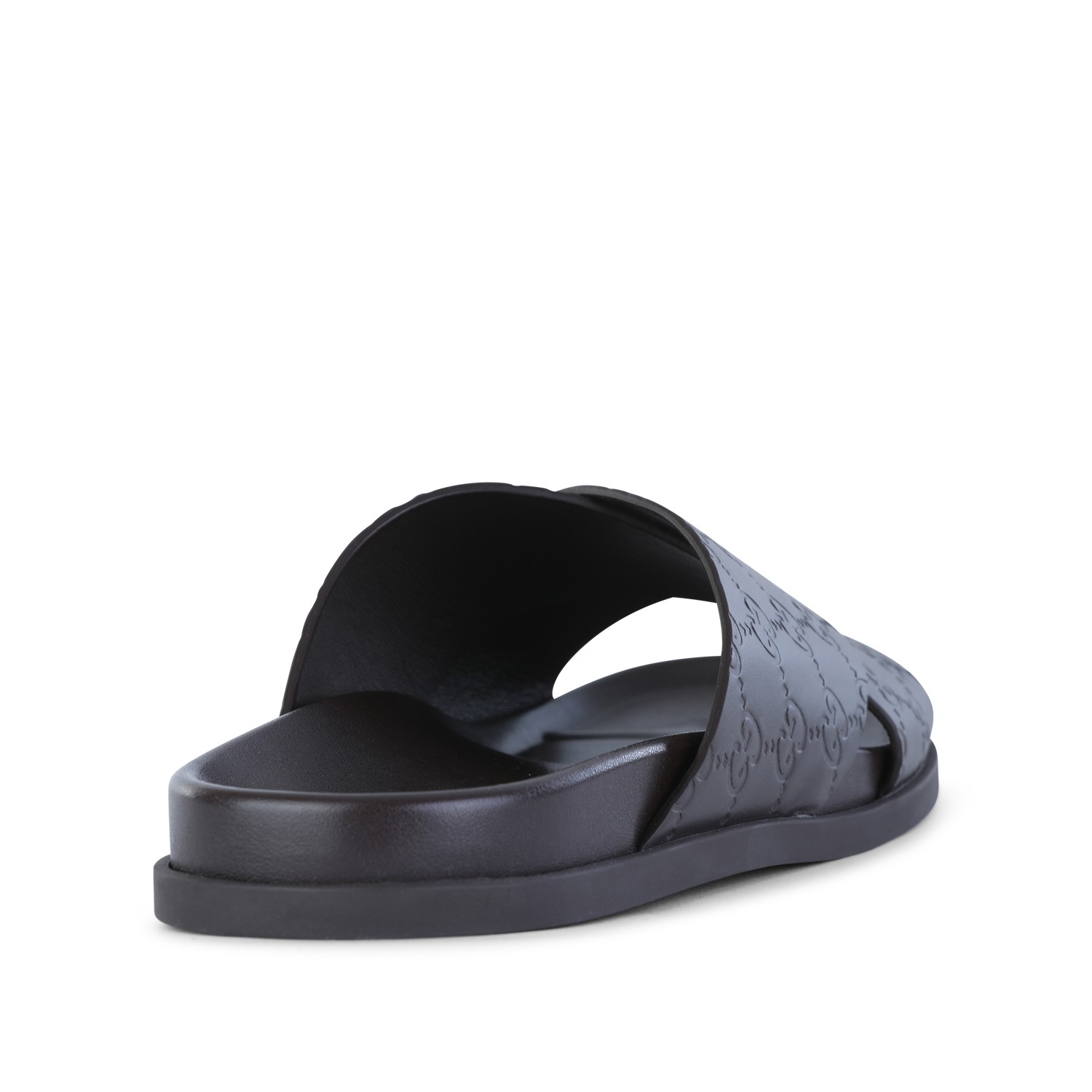 Brown leather Logo flats from Gucci featuring flat line, embroidered straps, brand insole and rubber sole.