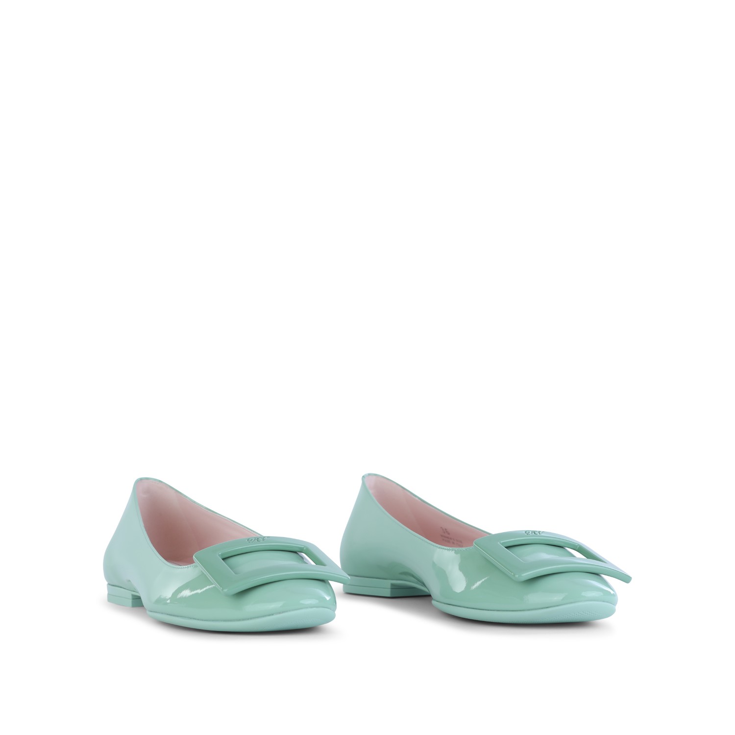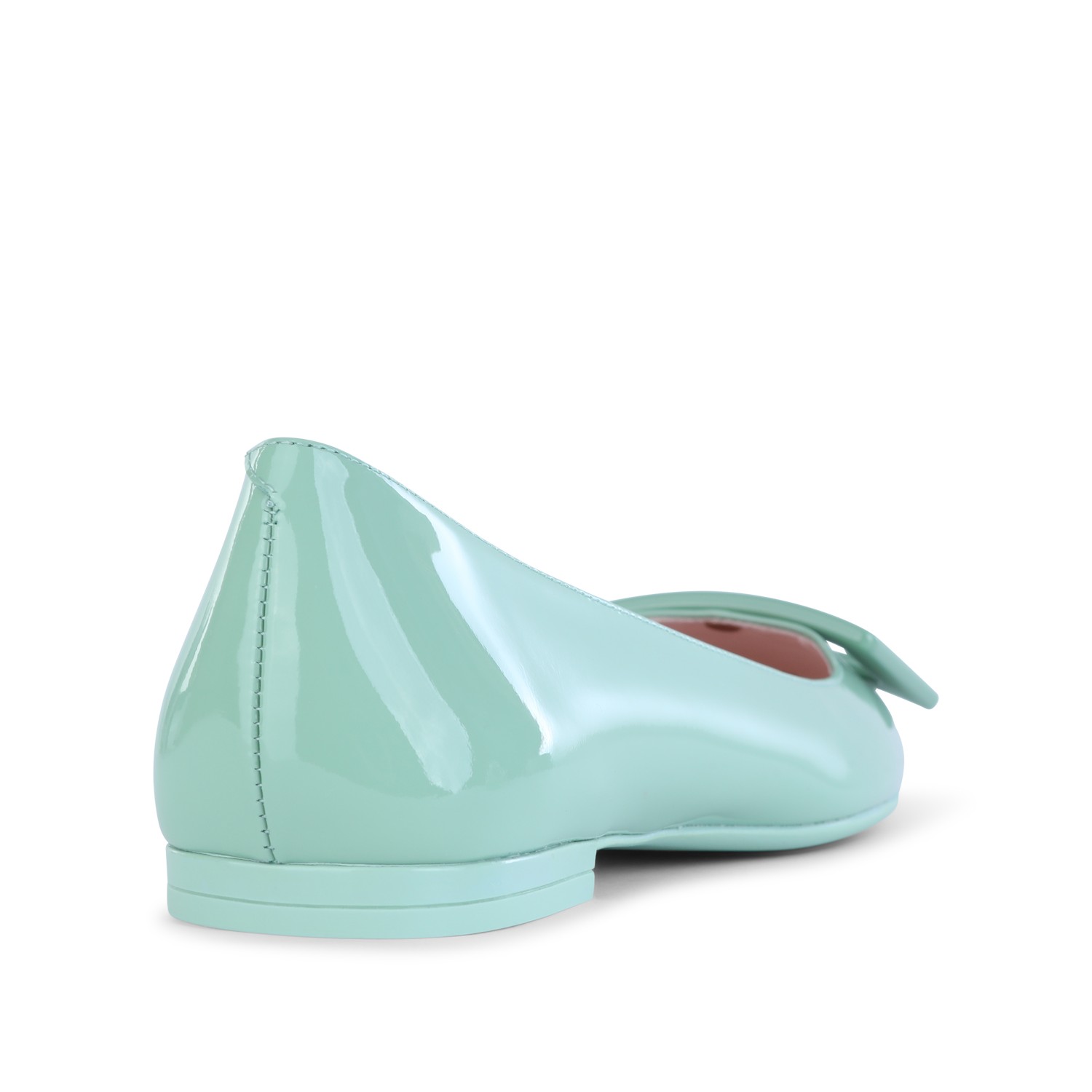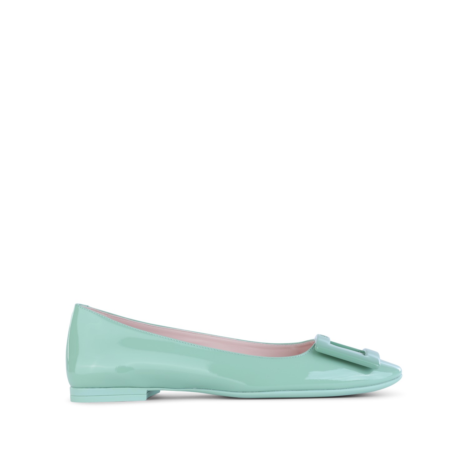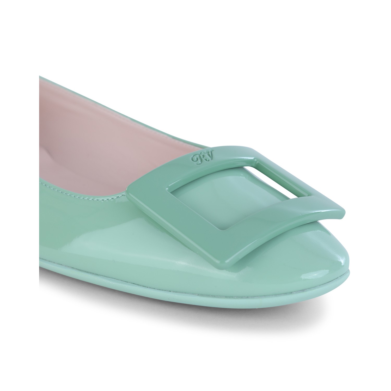 Green flats from Roger Vivier featuring square toe, slip-on style, frontal detail and leather sole.