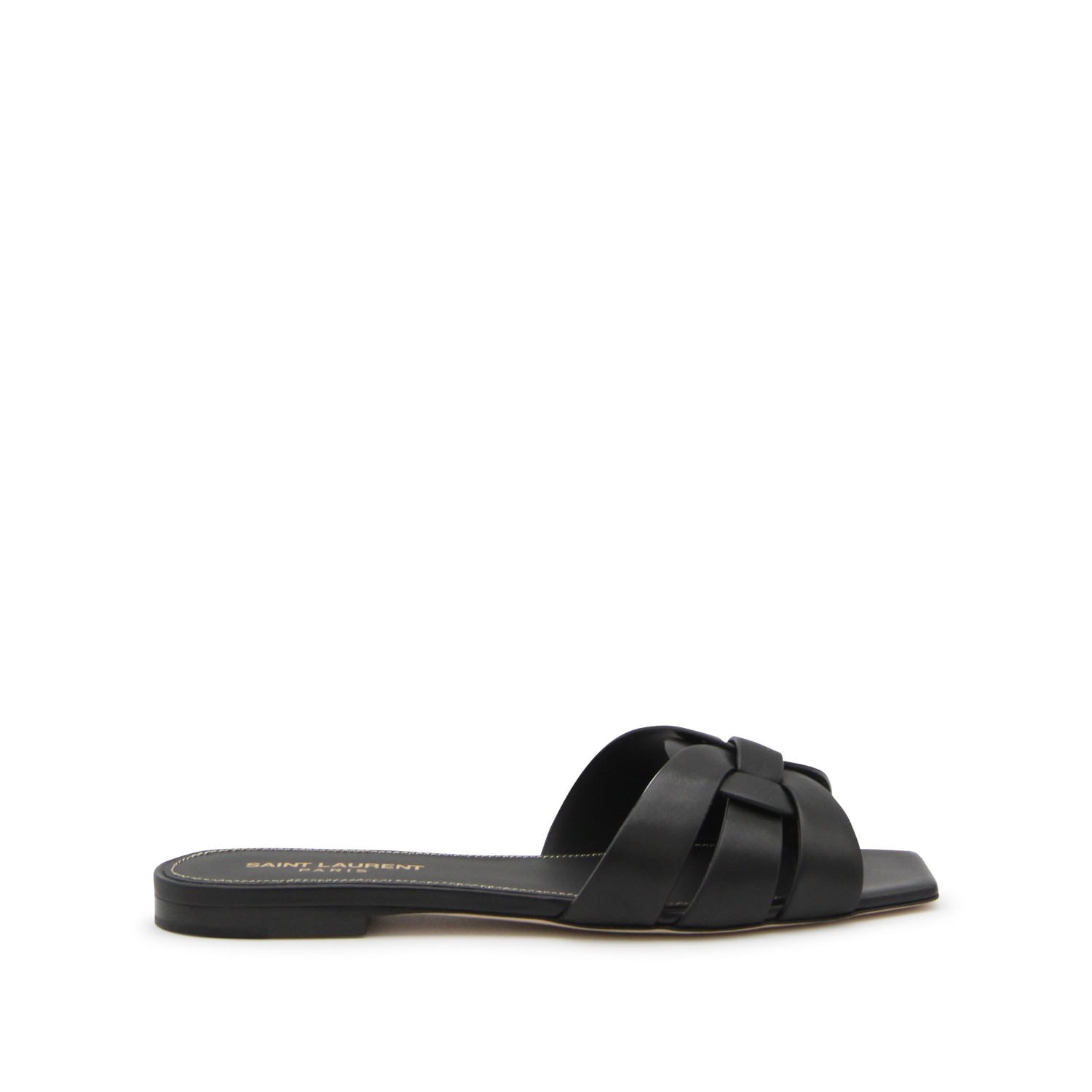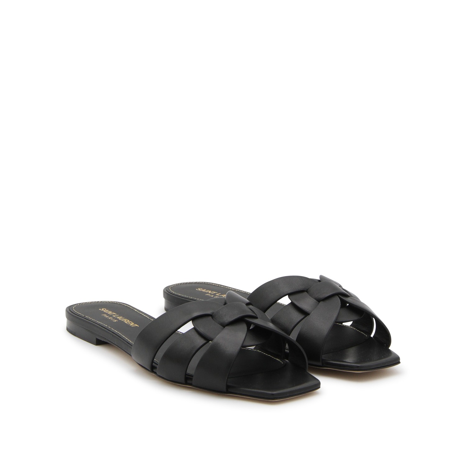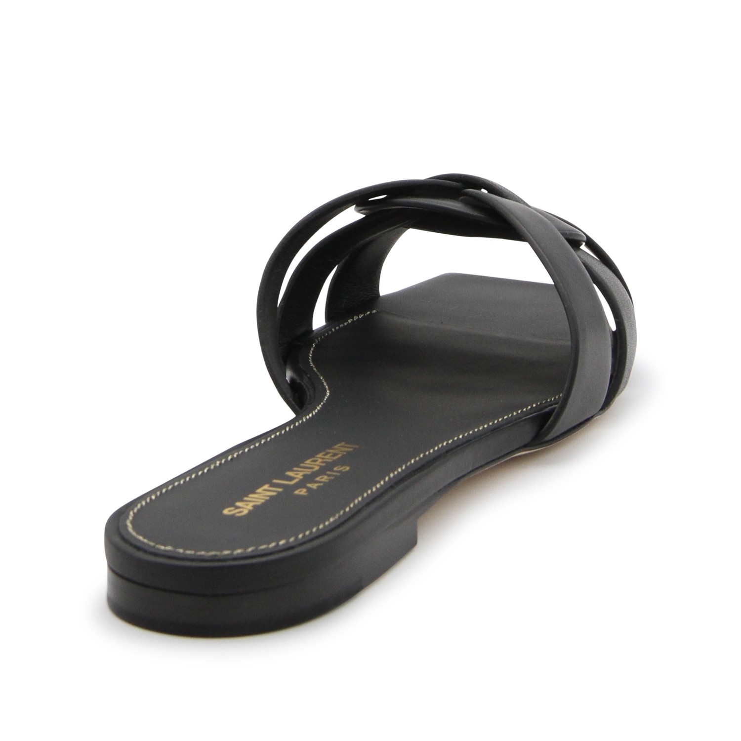 Black leather Tribute flats from Saint Laurent featuring open square toe, branded insole, slip-on style and flat rubber sole.