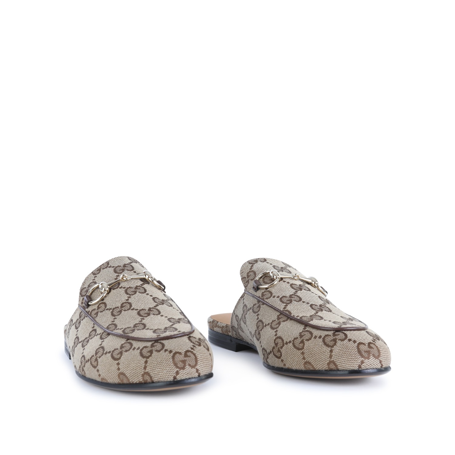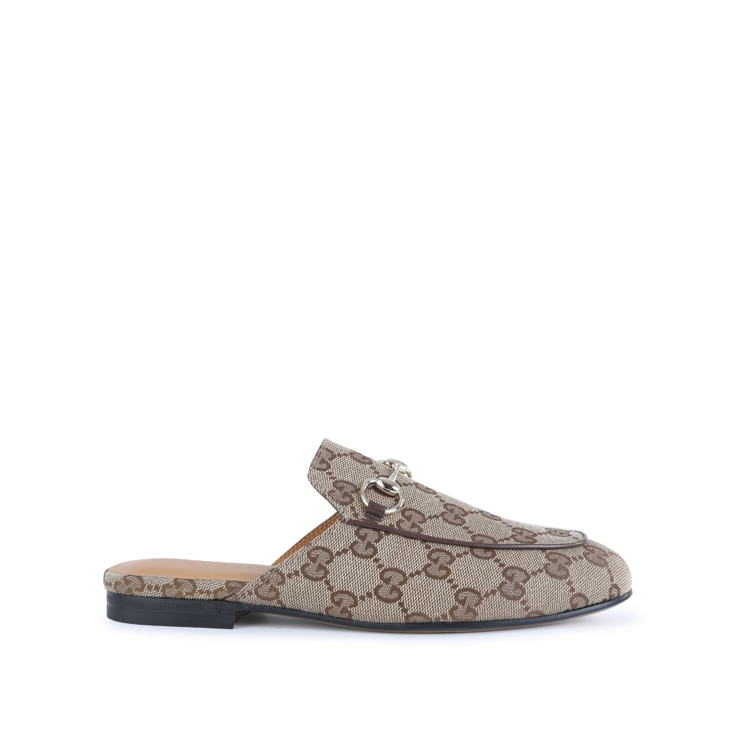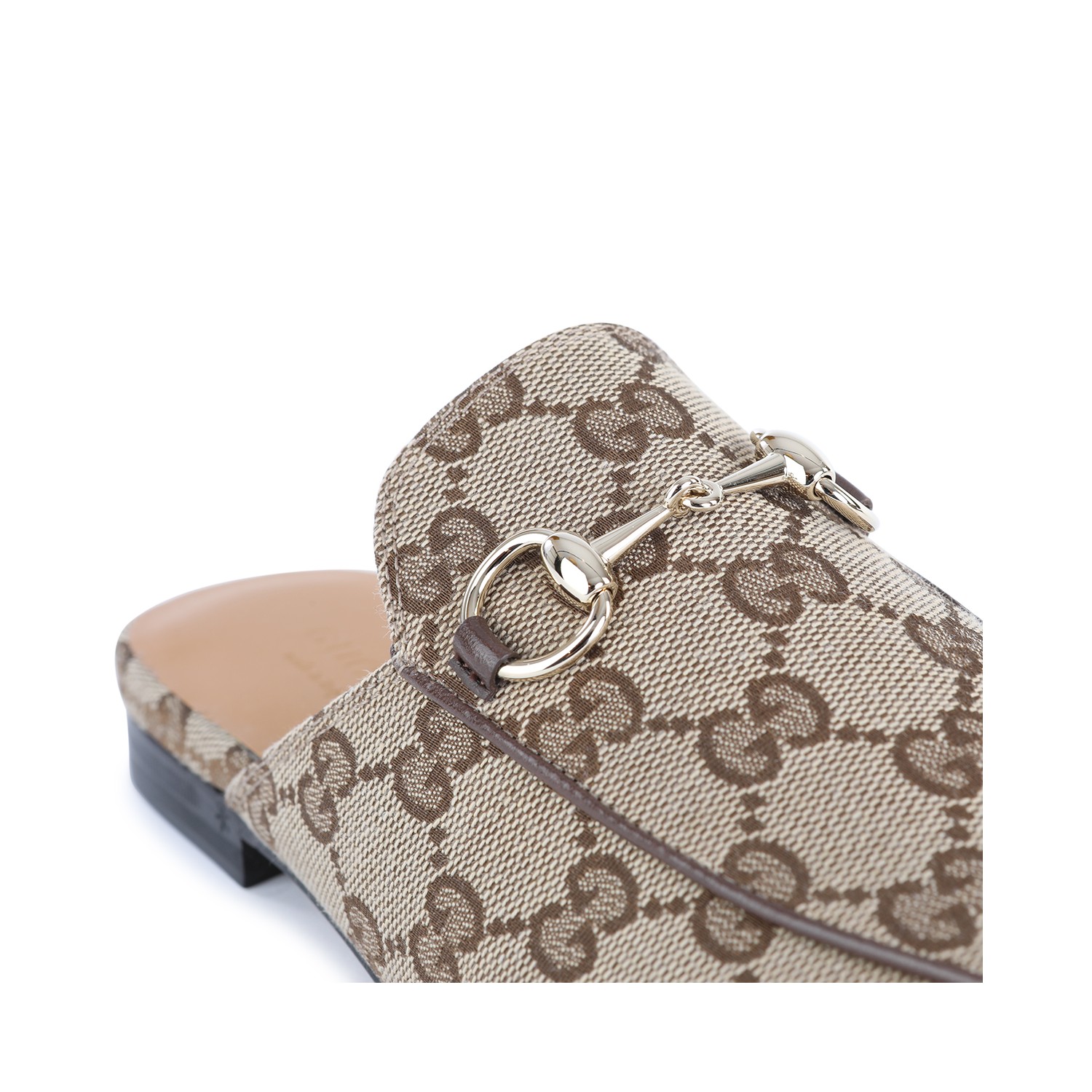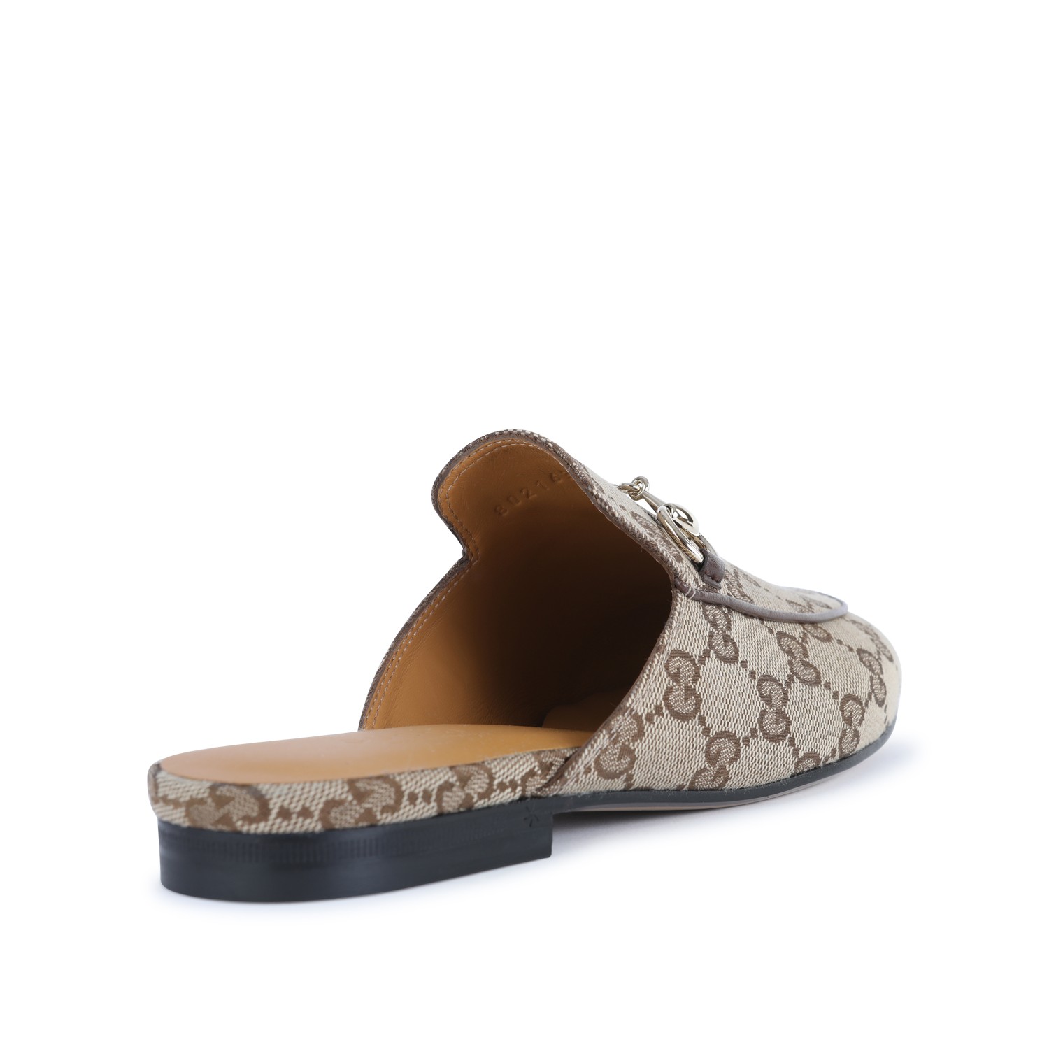 Beige flats from Gucci featuring all-over GG pattern, round toe, open back, slip-on style and flat leather sole.