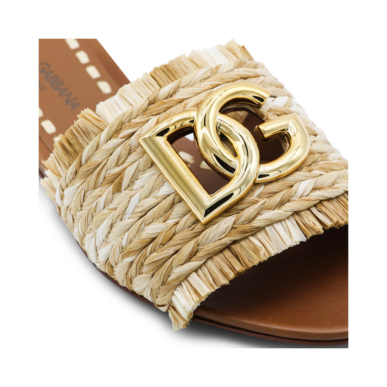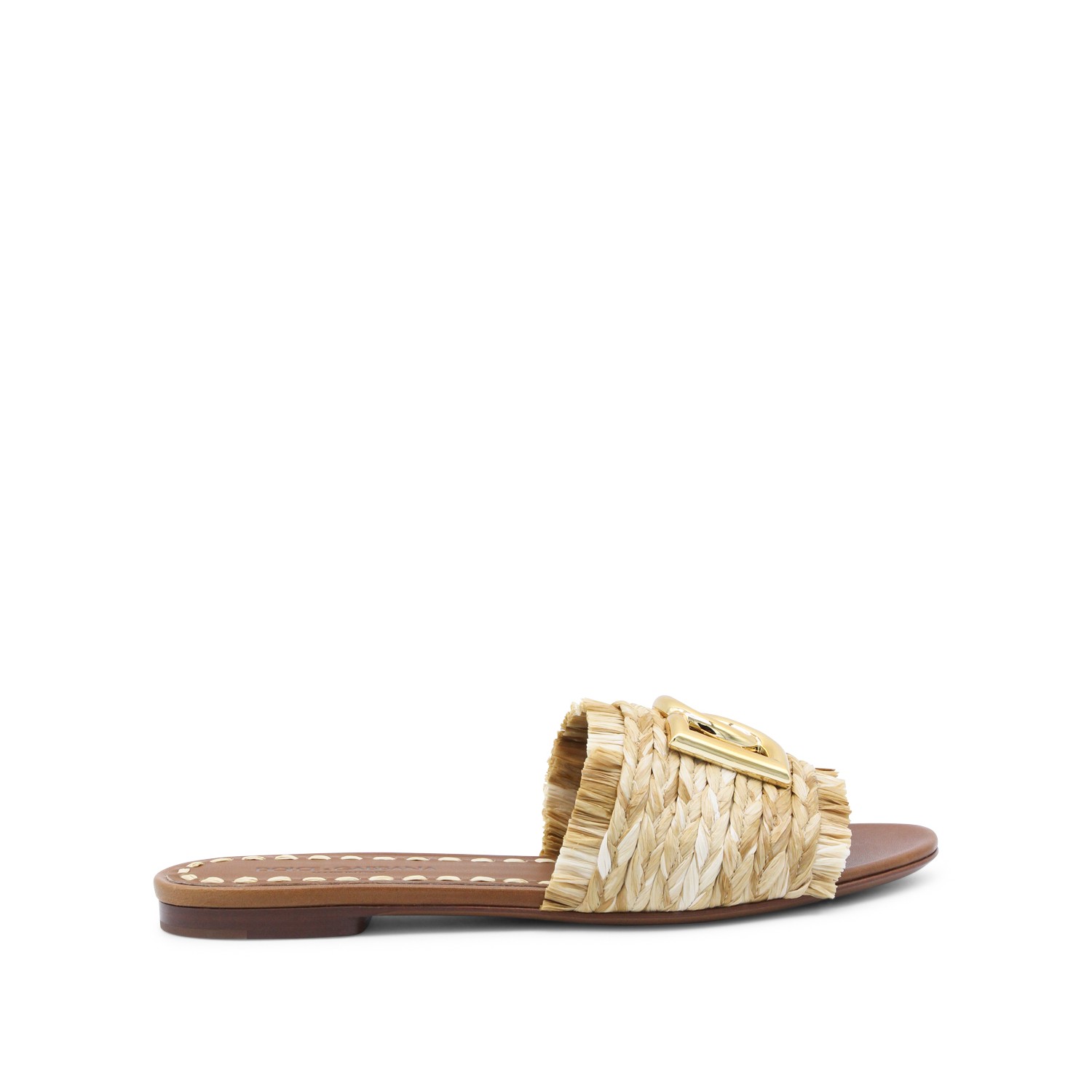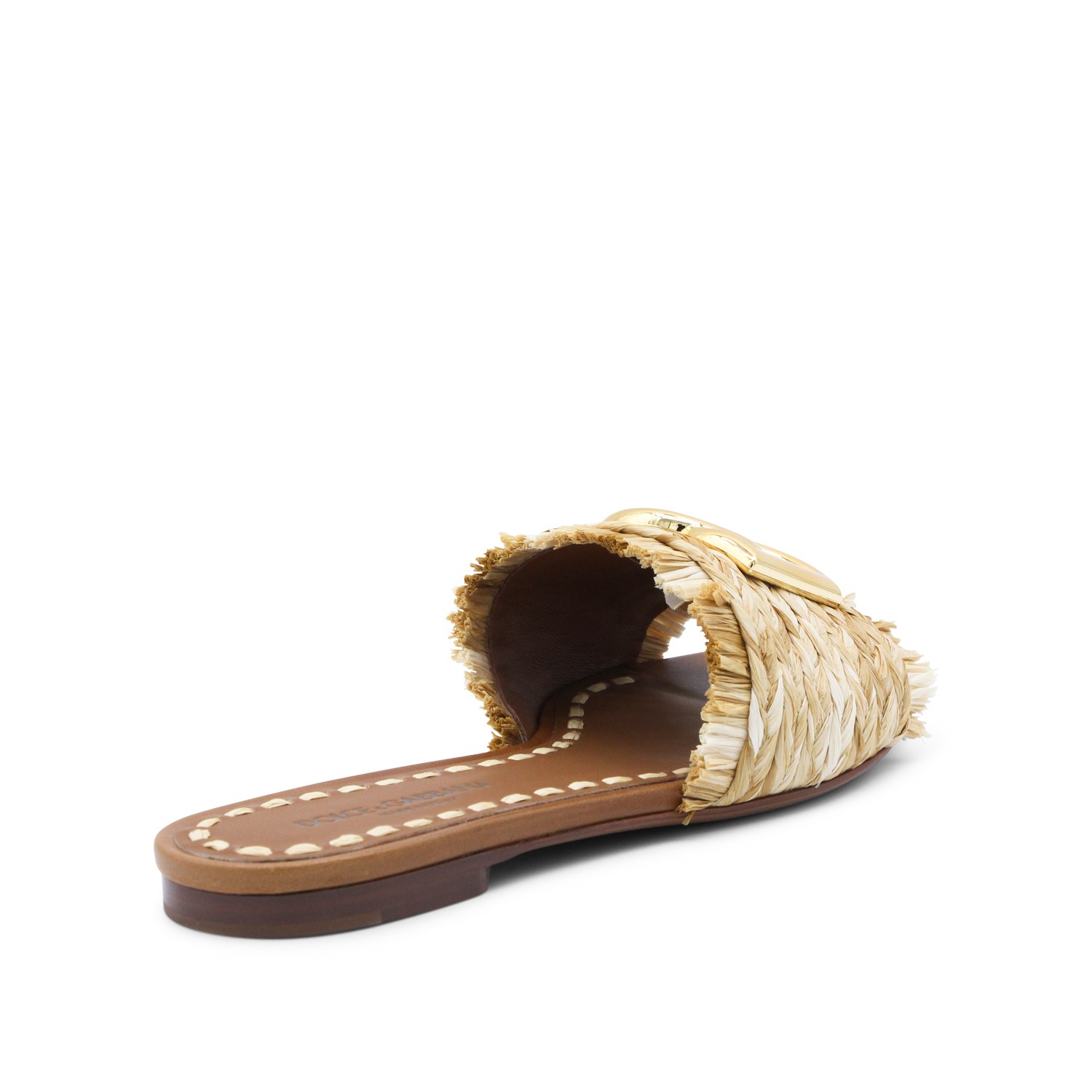 Beige leather flats from Dolce&Gabbana featuring round open toe, open back, raffia and logo.