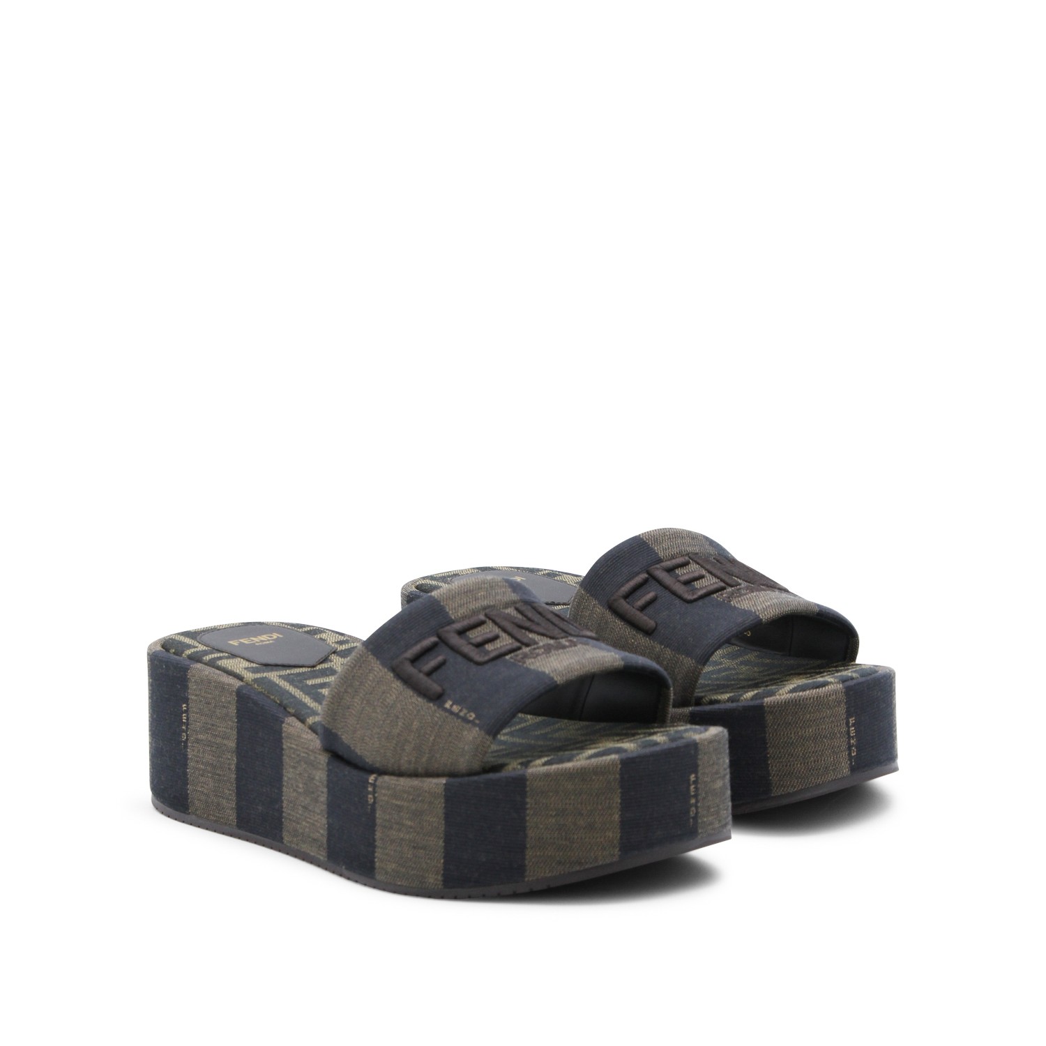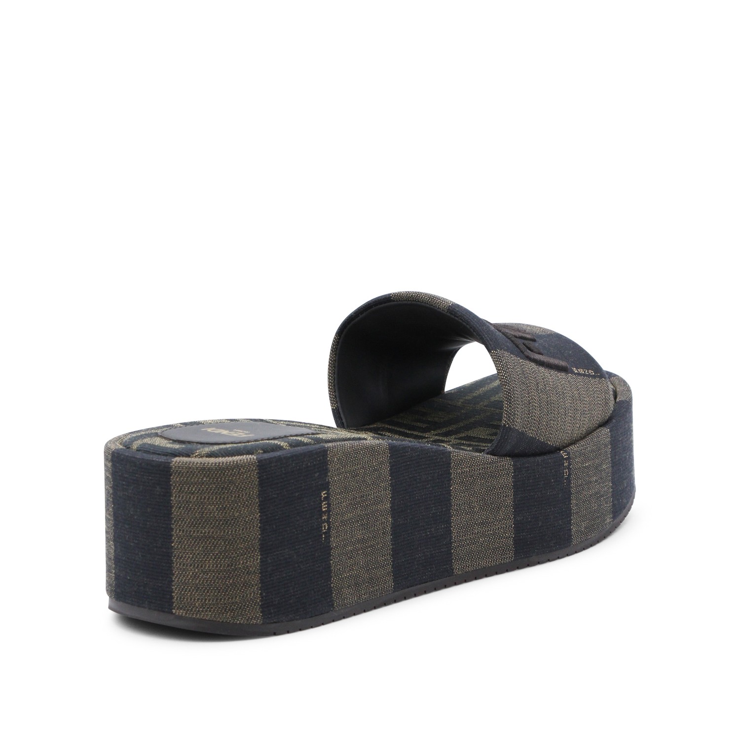 Black and dark grey flats from Fendi featuring round open toe, frontal logo and high platform.