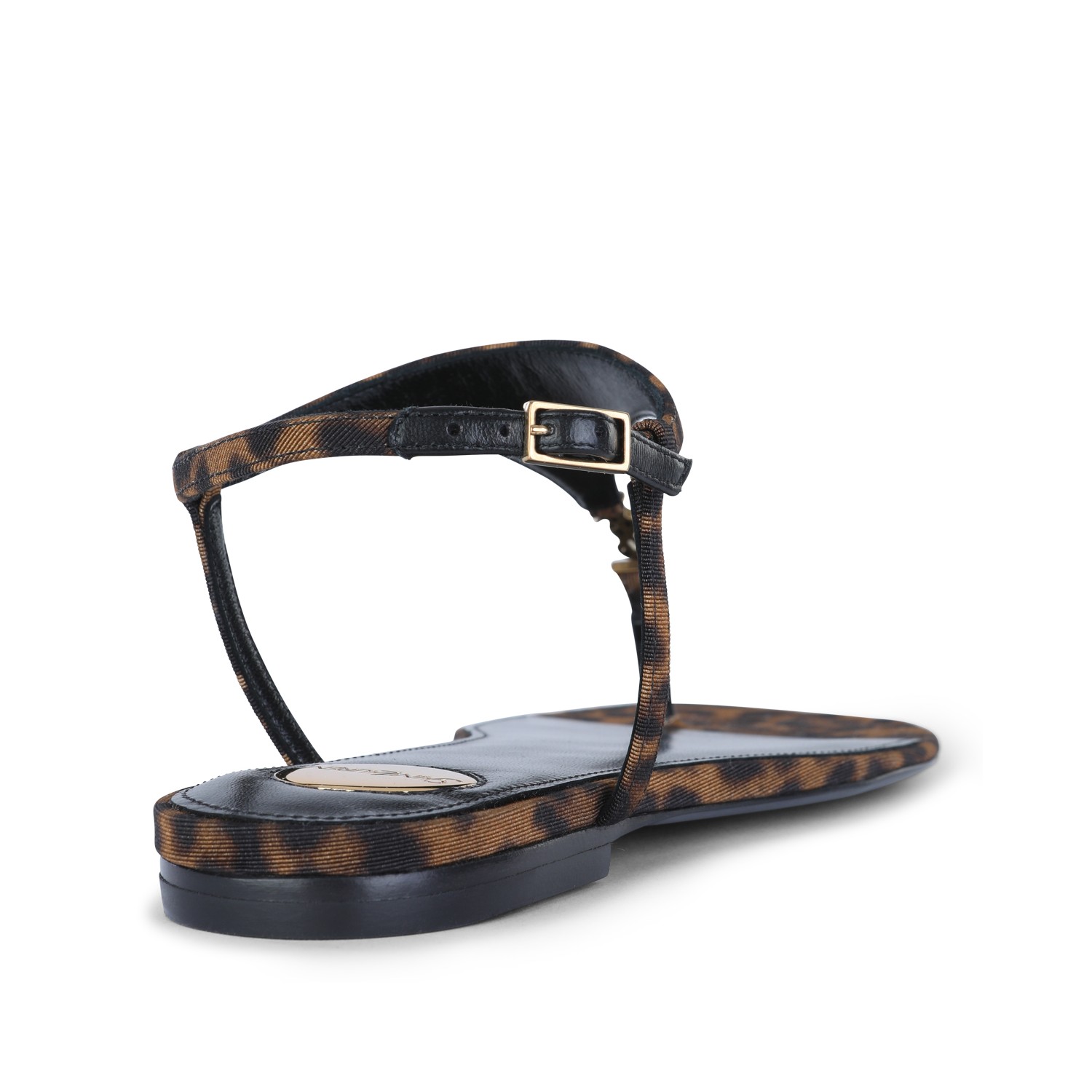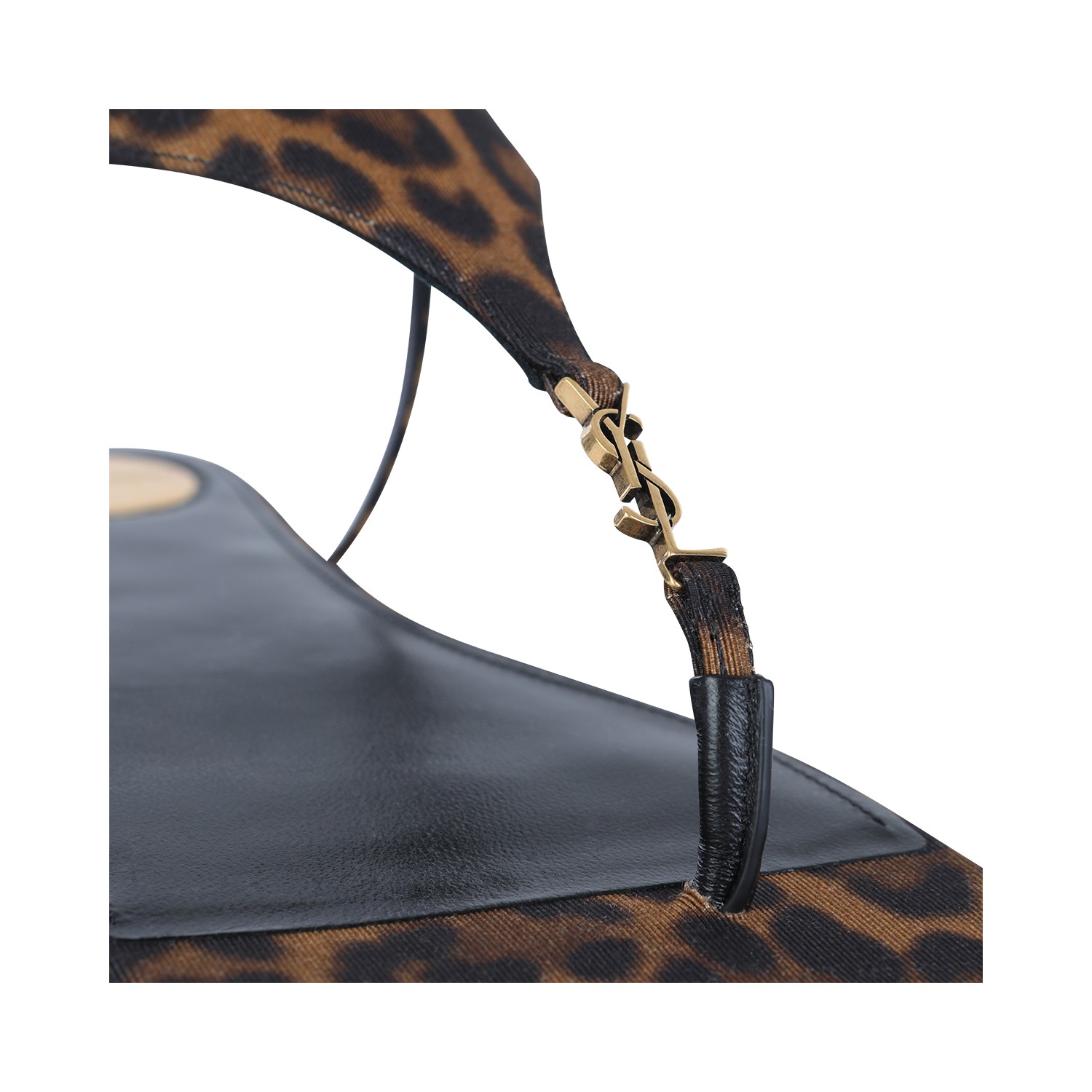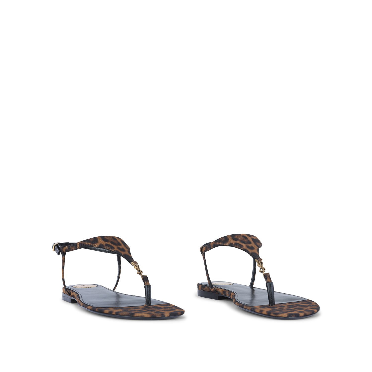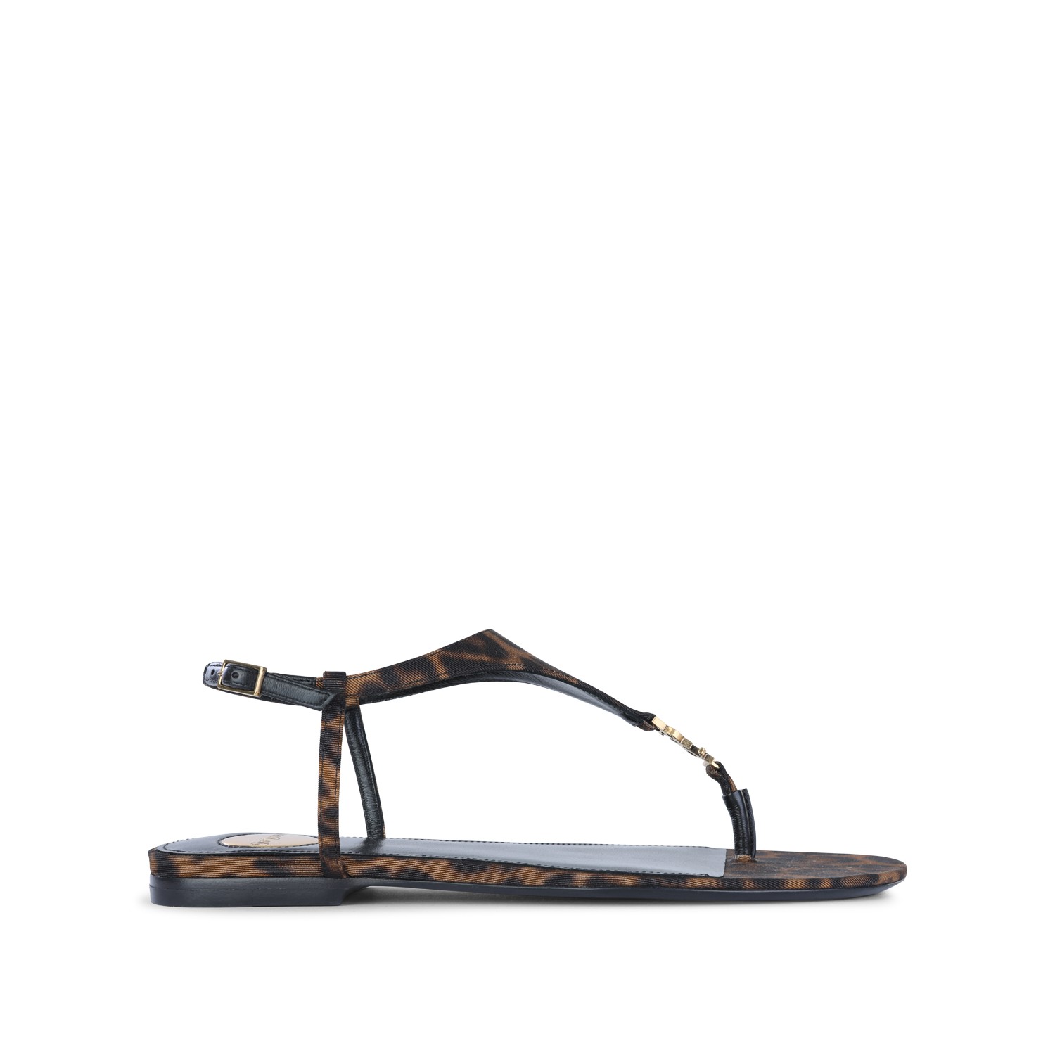 Brown and black Cassandra flat from Saint Laurent featuring open round toe, leopard print, adjustable ankle strap and leather sole.