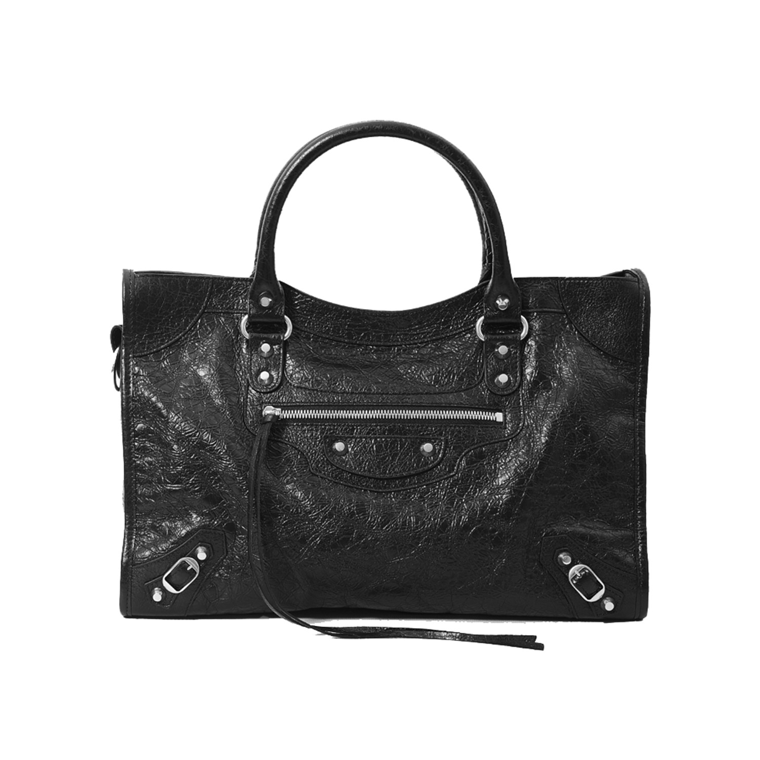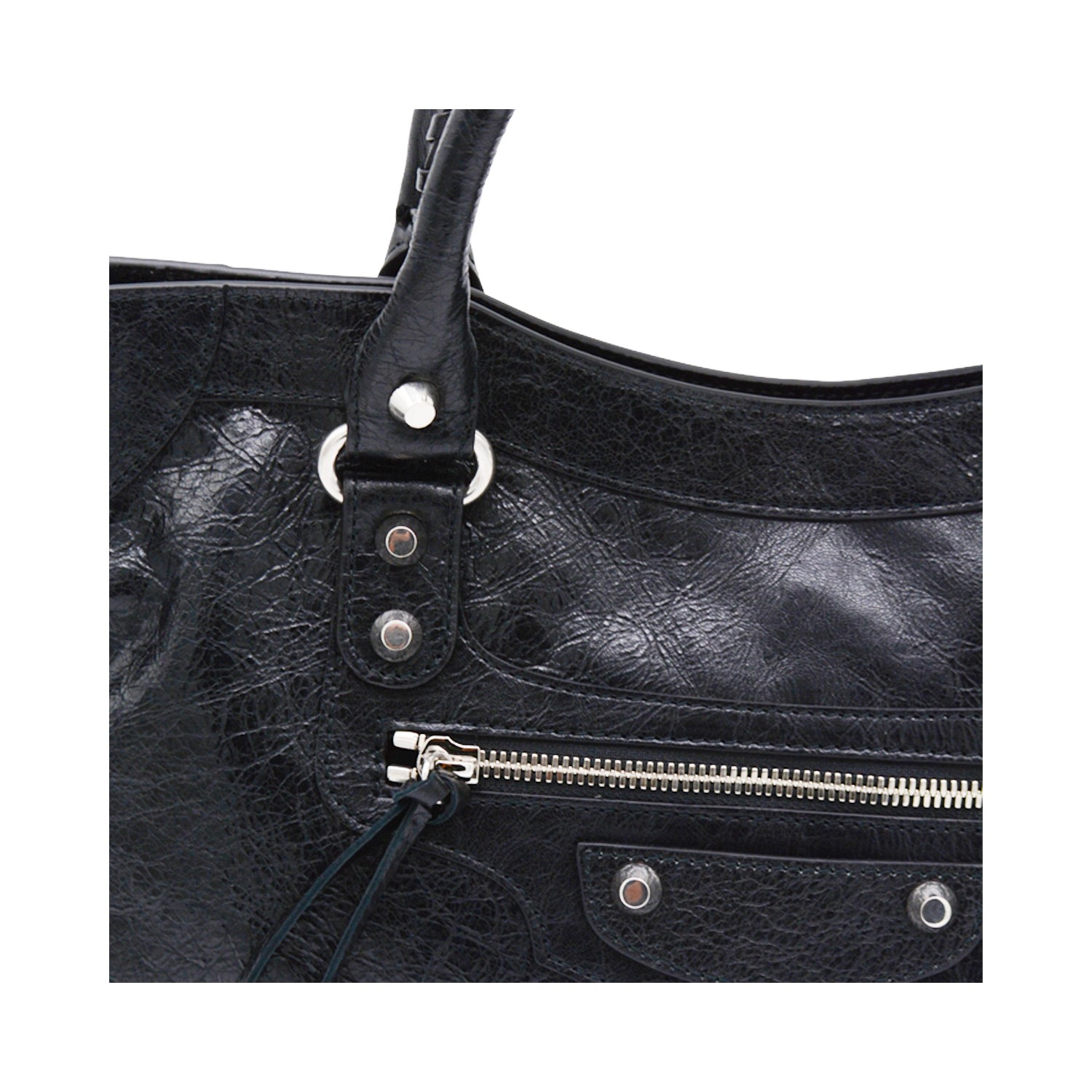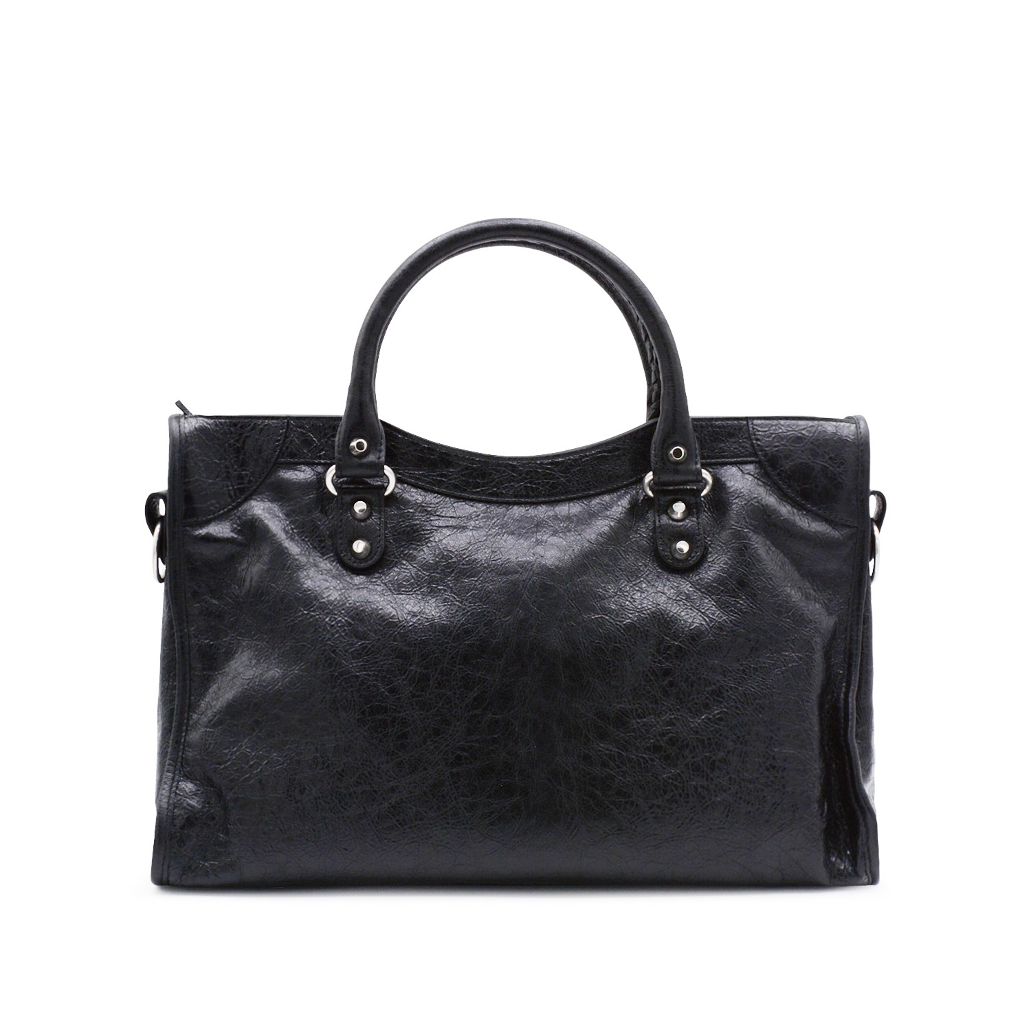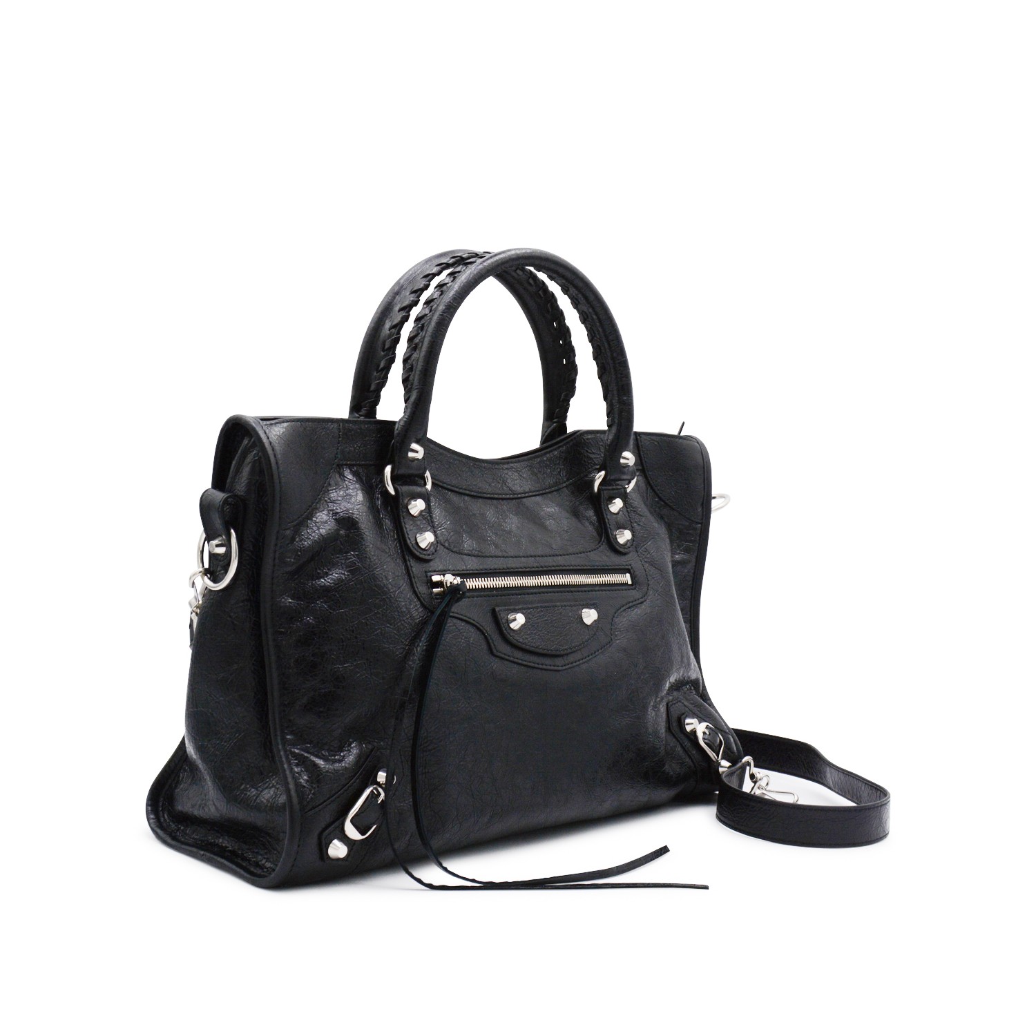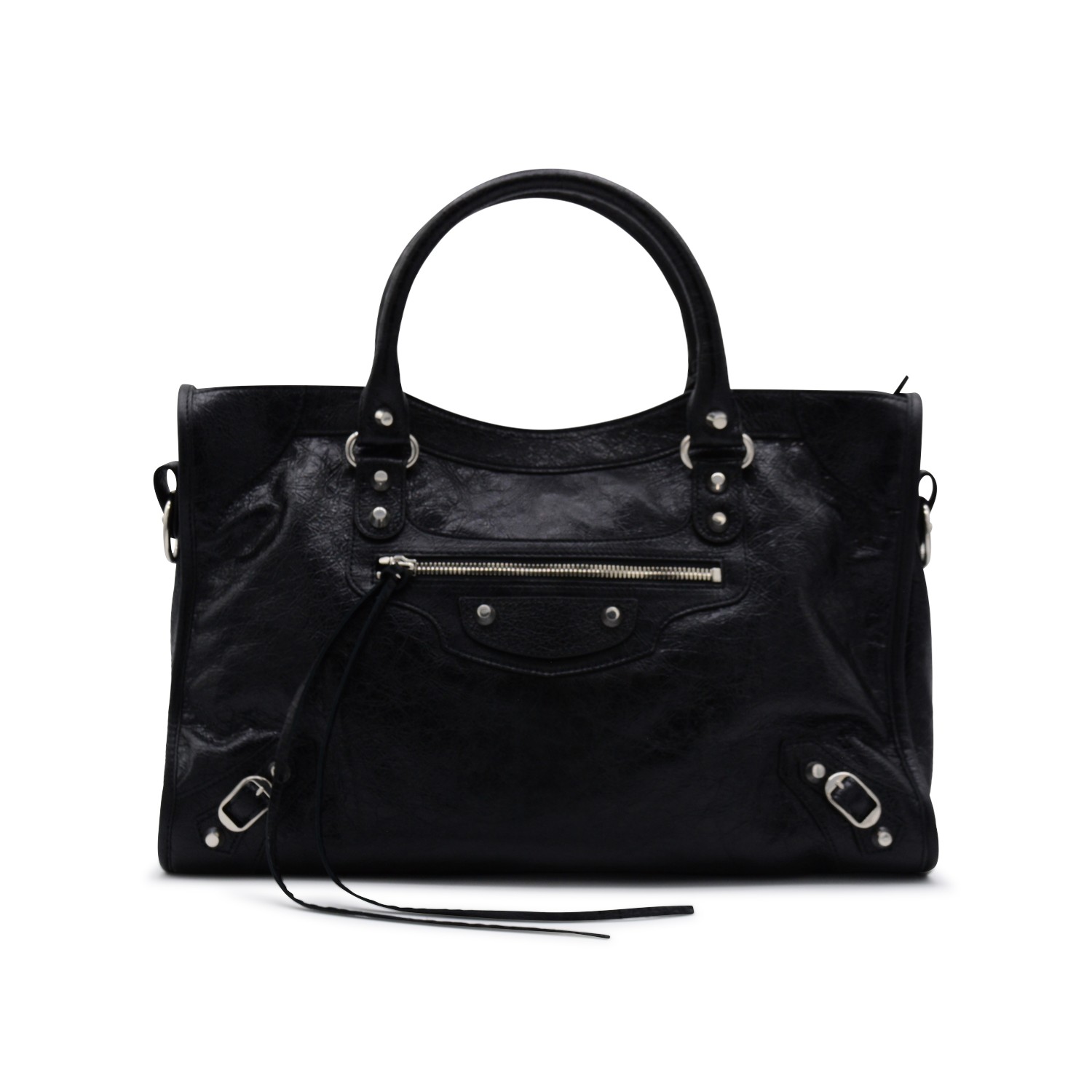 Black leather Le City medium top handle bag from Balenciaga featuring top handles, silver tone hardware, adjustable and removable shoulder strap, zip fastening, front zip pocket, main compartment and internal zip pocket.