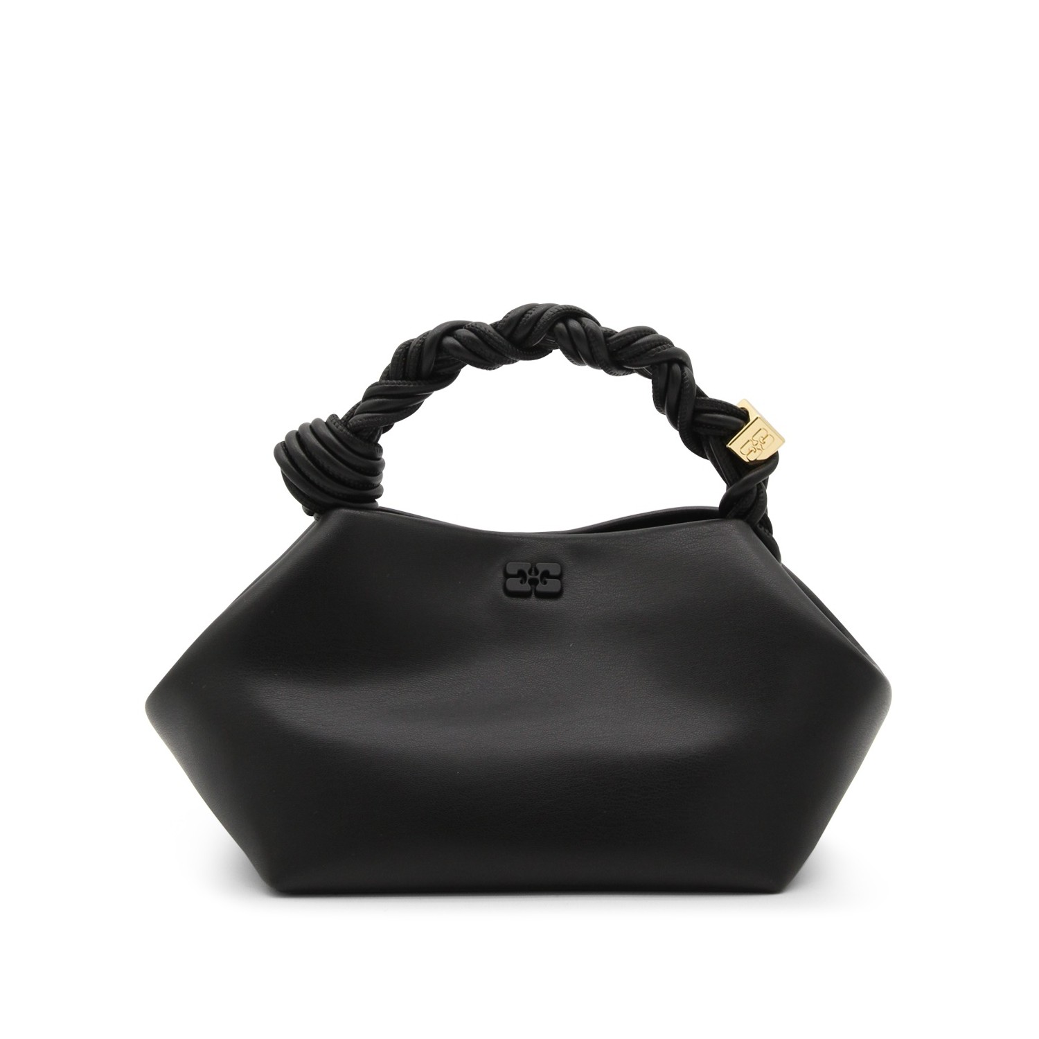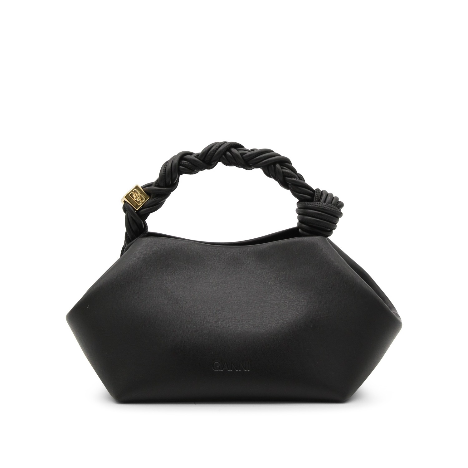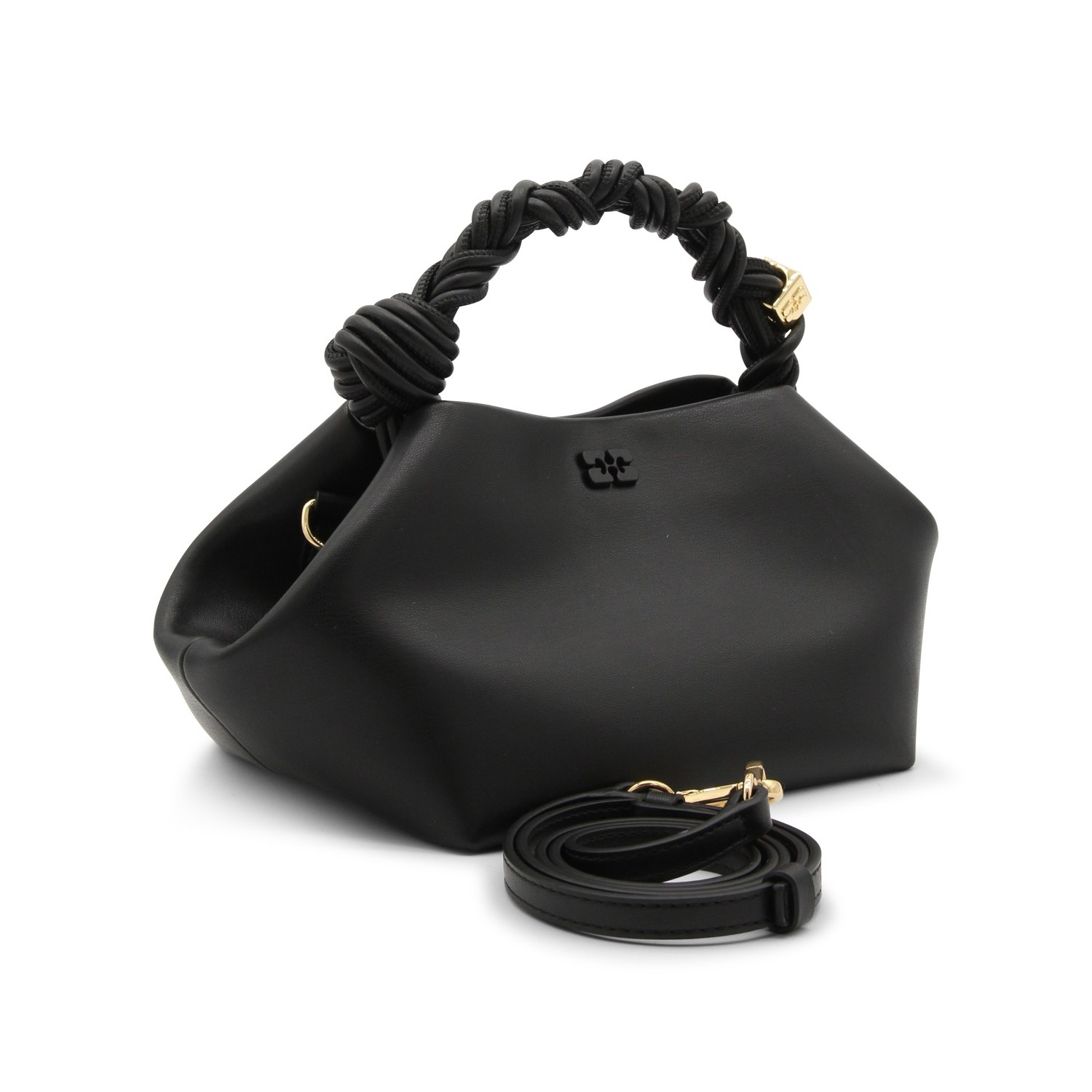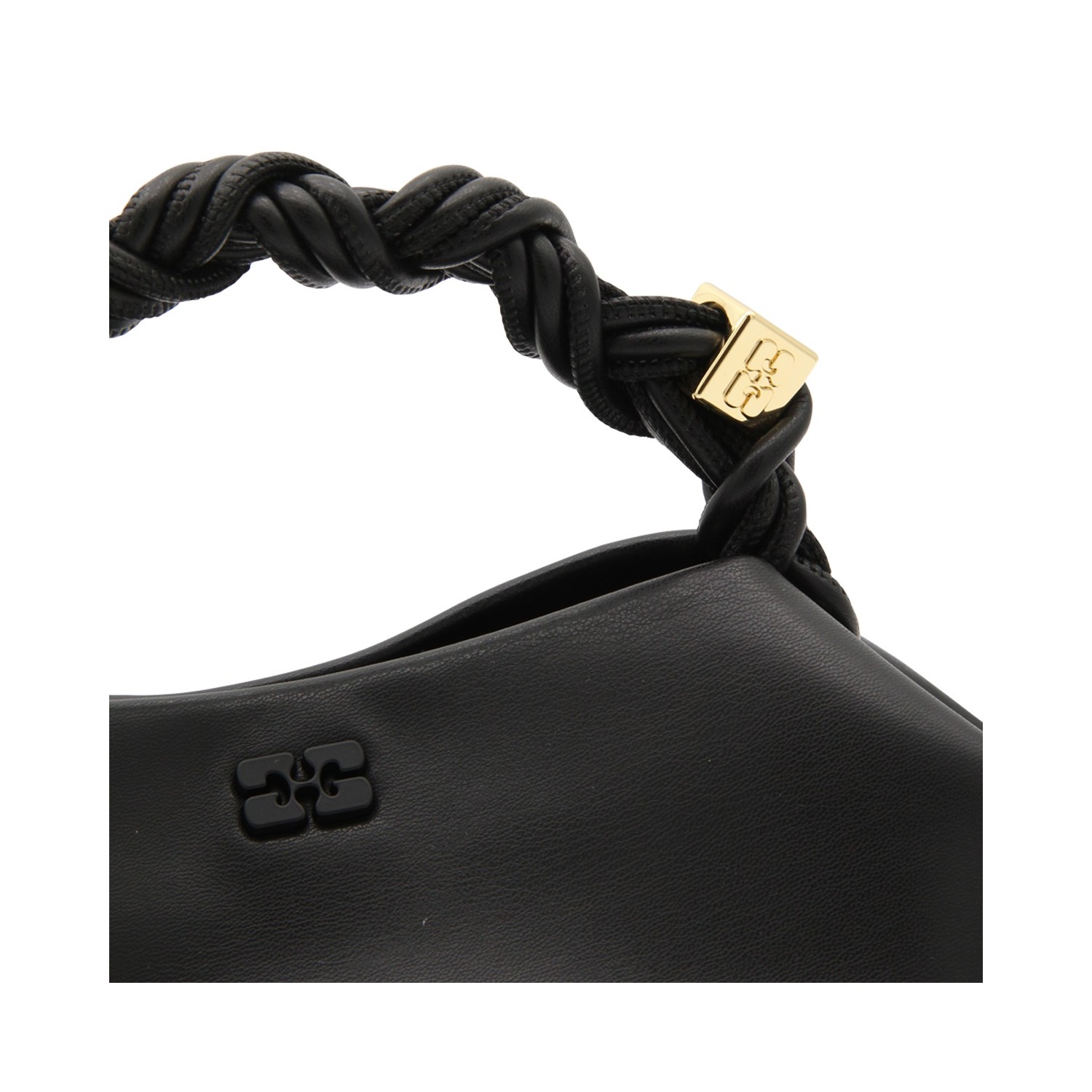 Black leather top handle bag from Ganni featuring top handle, removable strap, upper fatening, logo and gold tone hardware.
