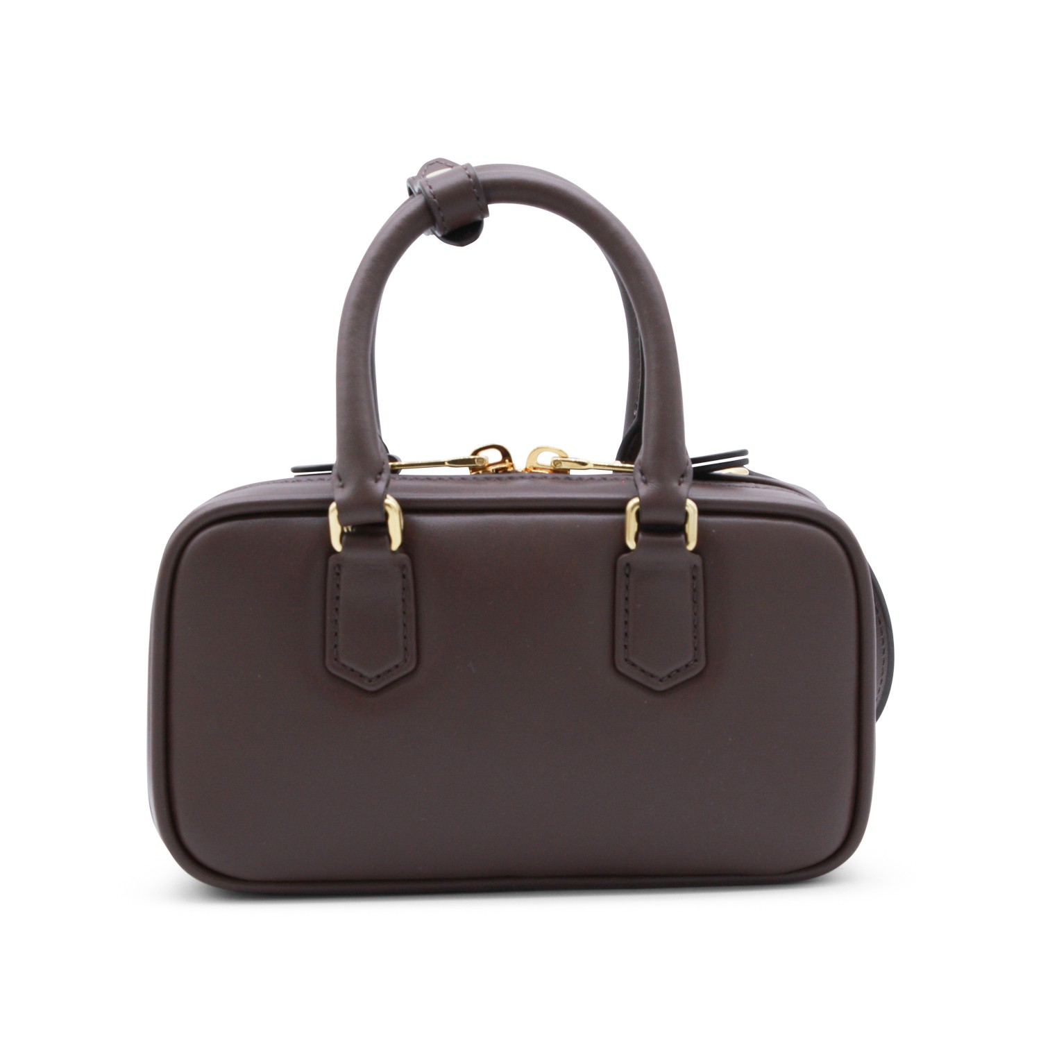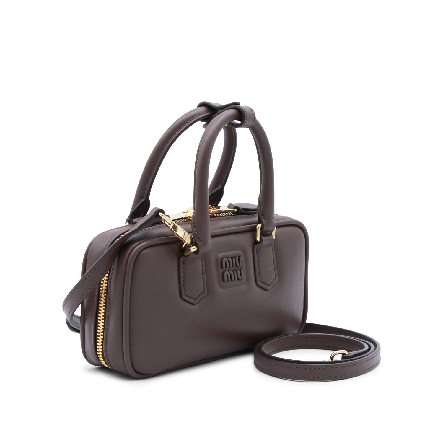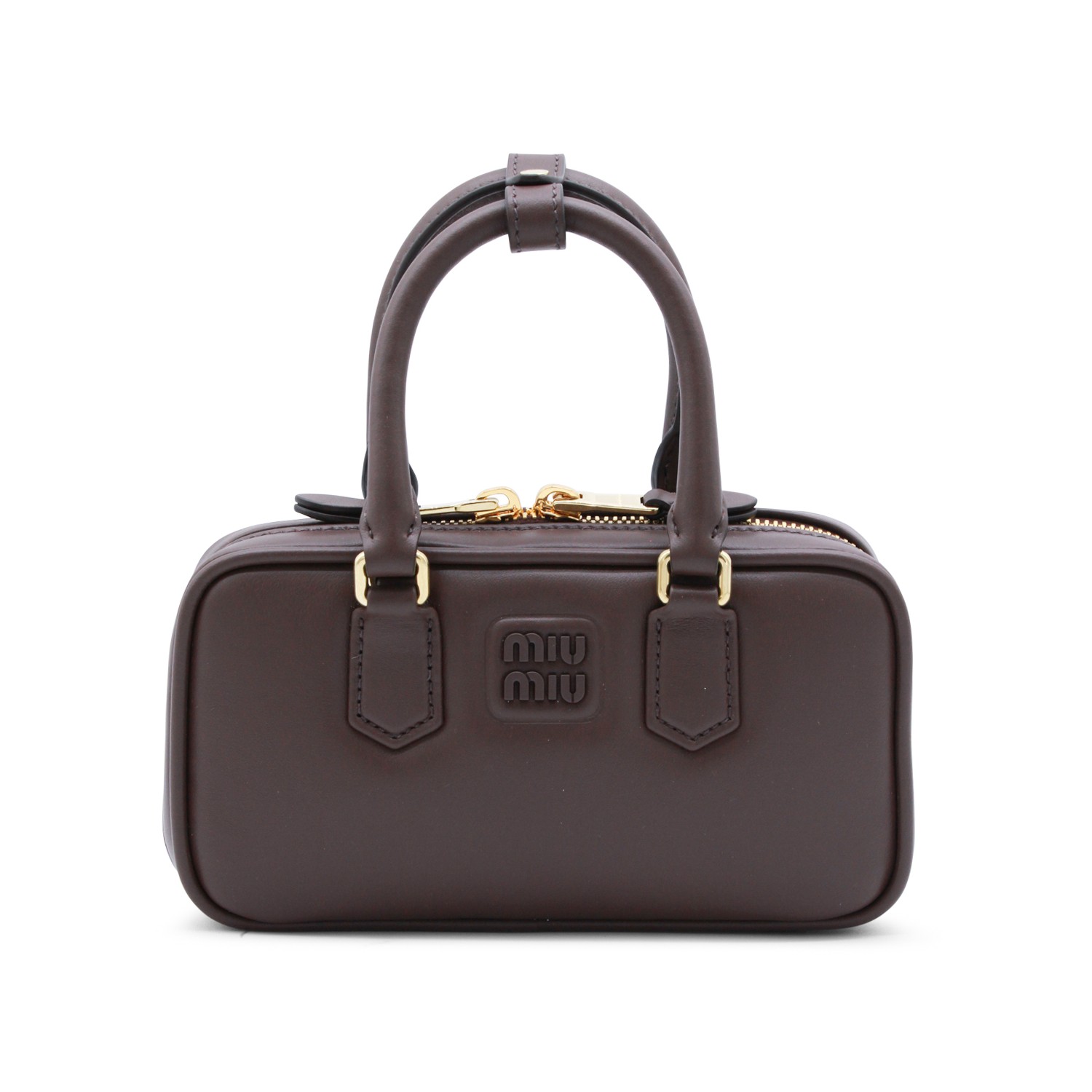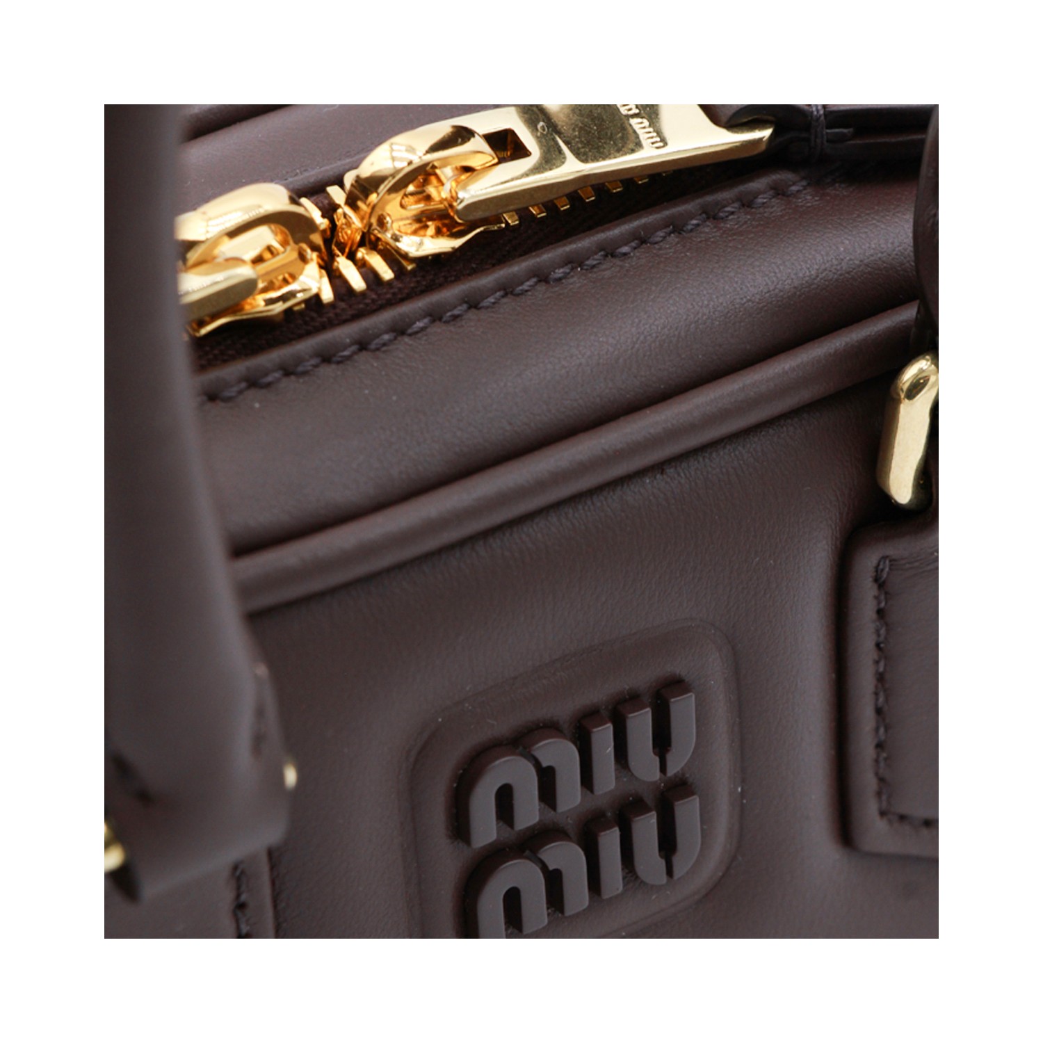 Dark brown leather top handle bag from Miu Miu featuring top handles, zip fastening, main compartment, internal zip pocket, golden hardware and frontal logo detail.