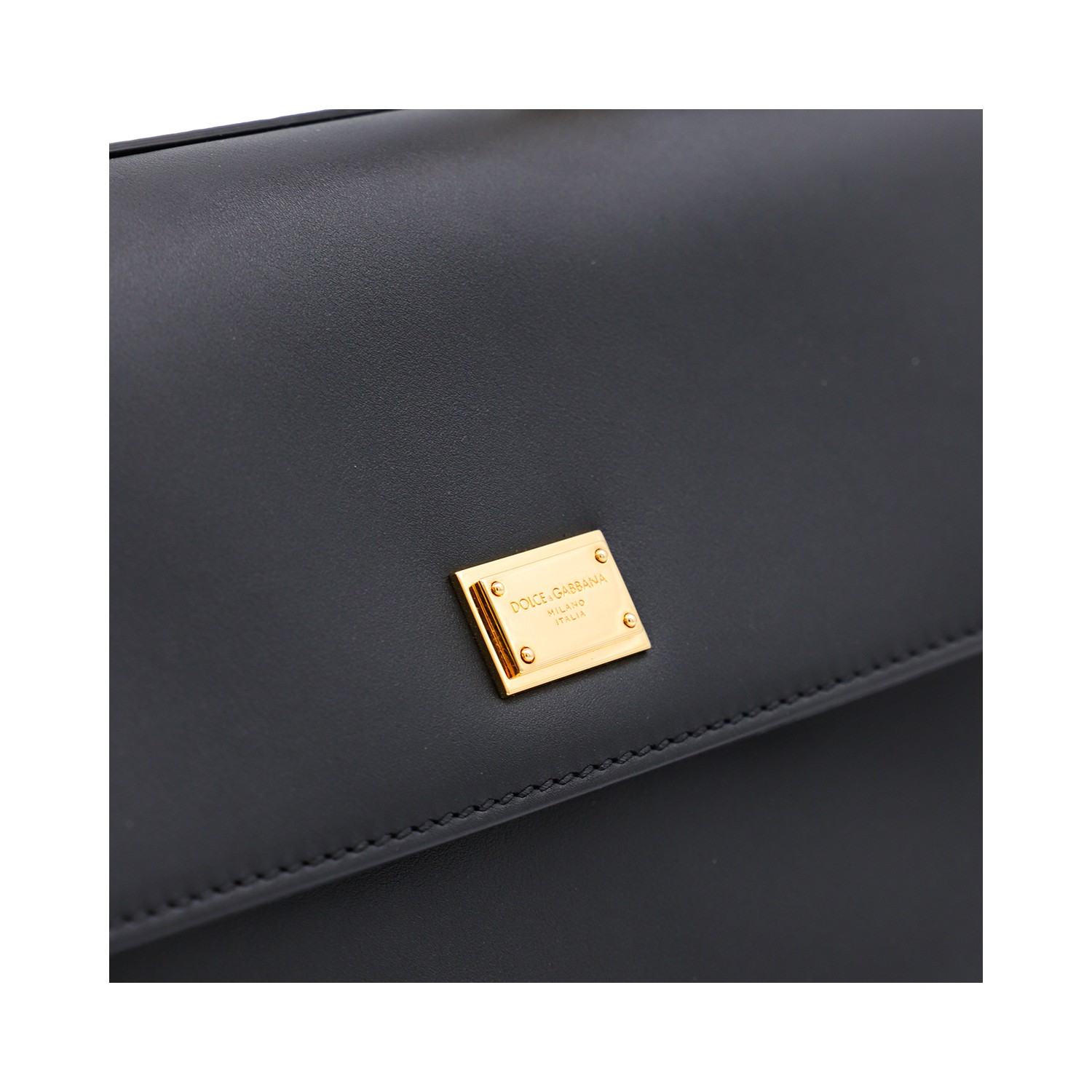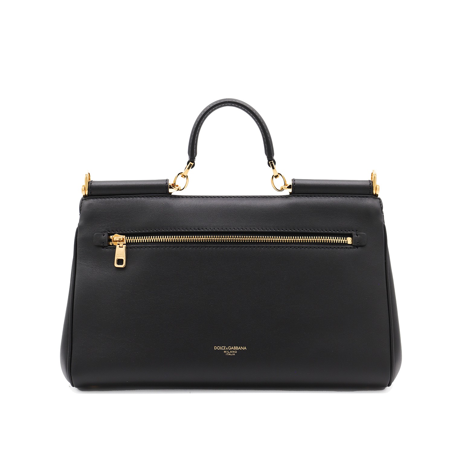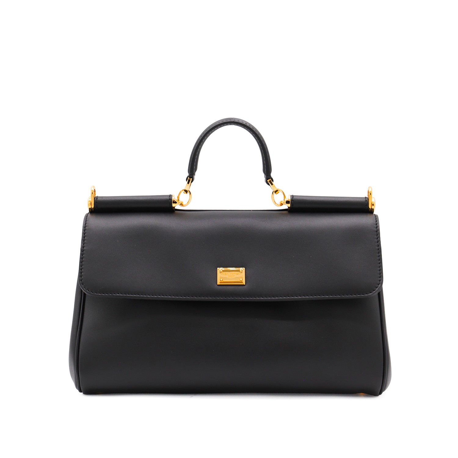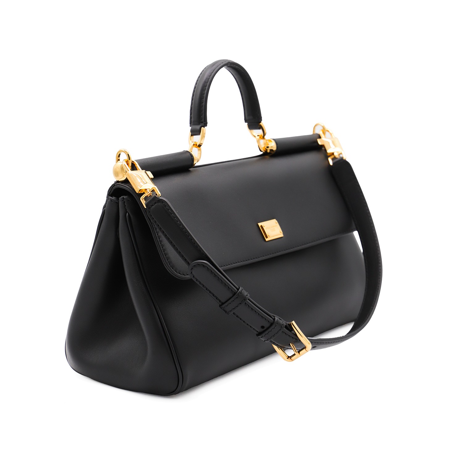 Black leather My Sicily East West top handle bag from Dolce & Gabbana featuring top handle, gold tone metal hardware, adjustable and removable shoulder strap, tuck-in closure, main compartment and internal zip pocket.