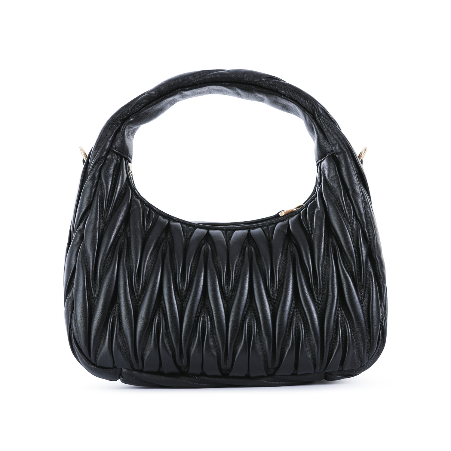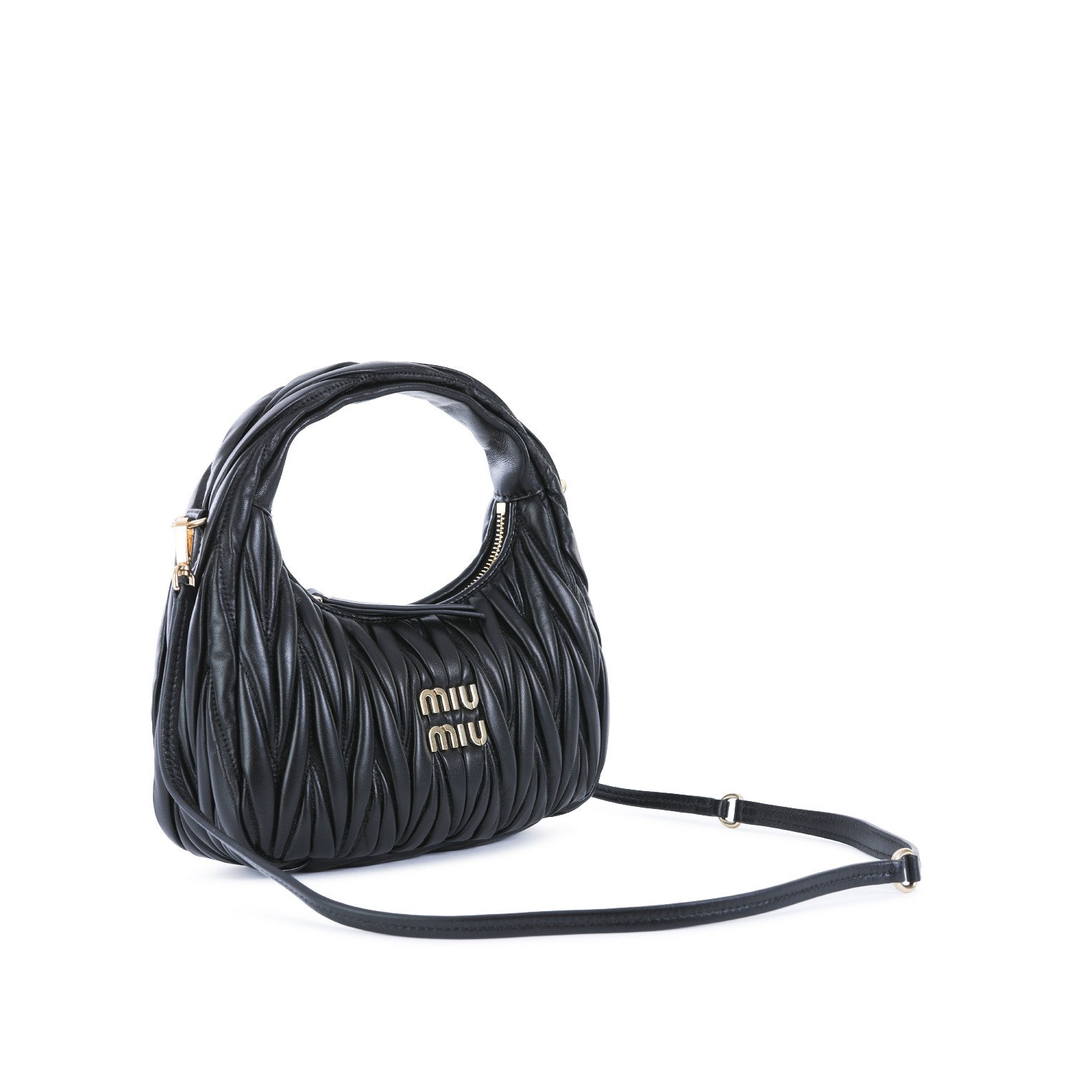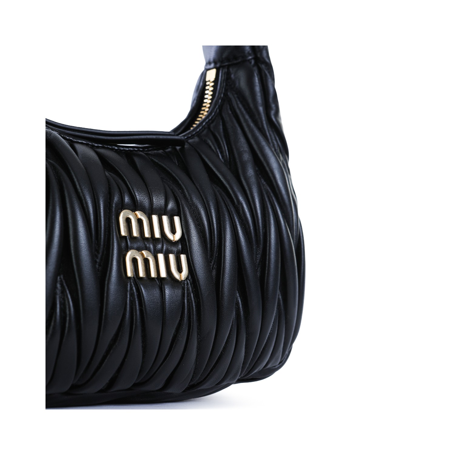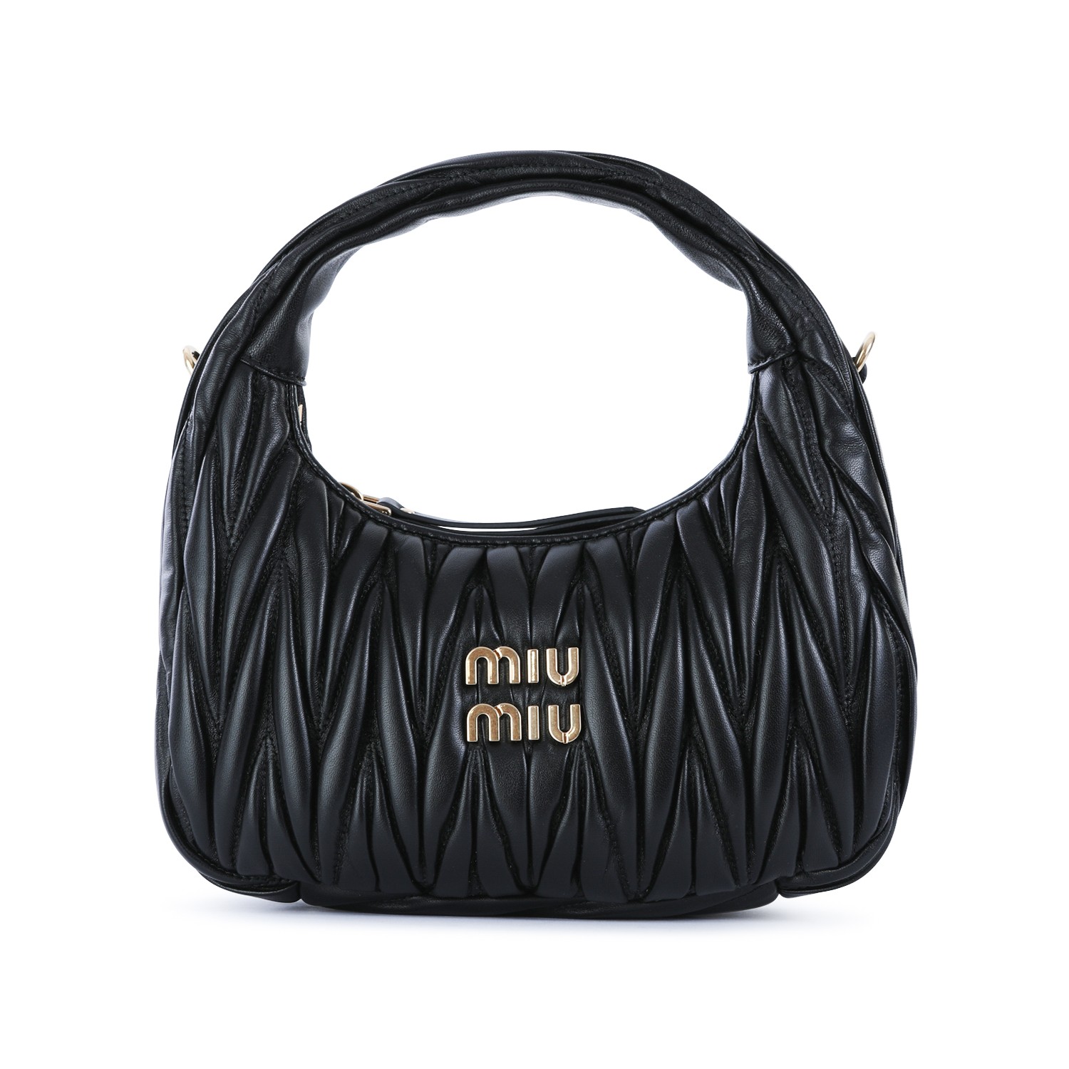 Black leather top handle bag from Miu Miu featuring top handle, zip fastening, frontal logo and gold tone hardware.