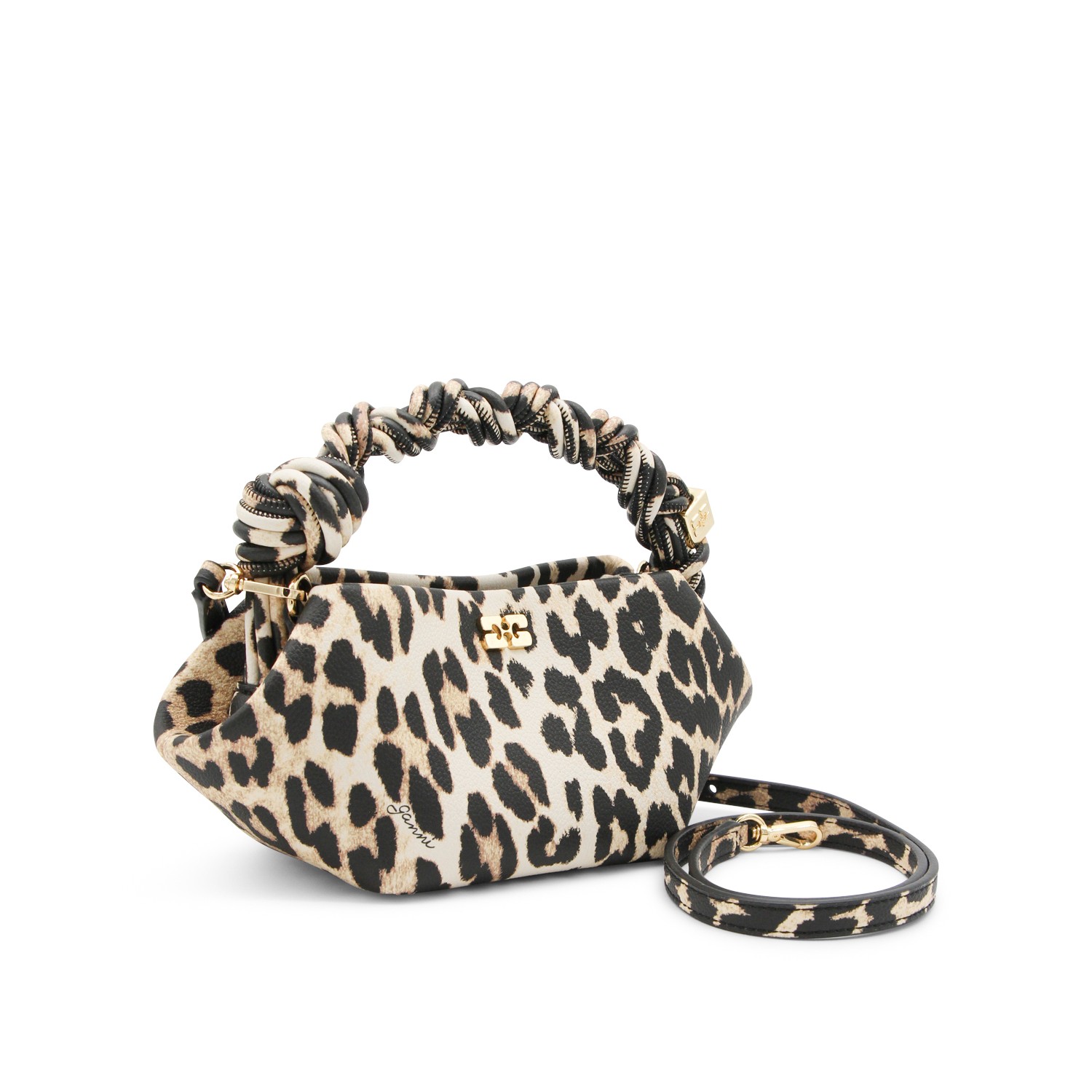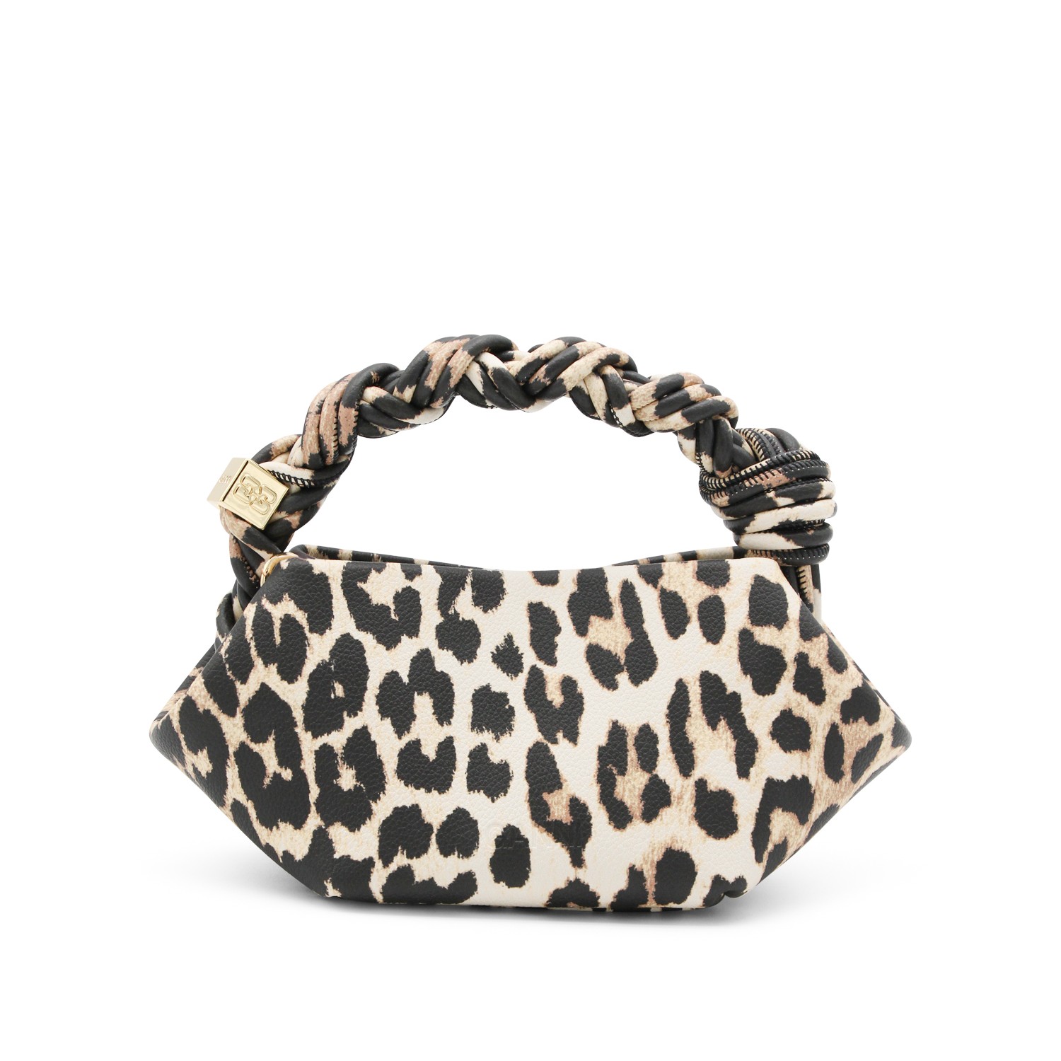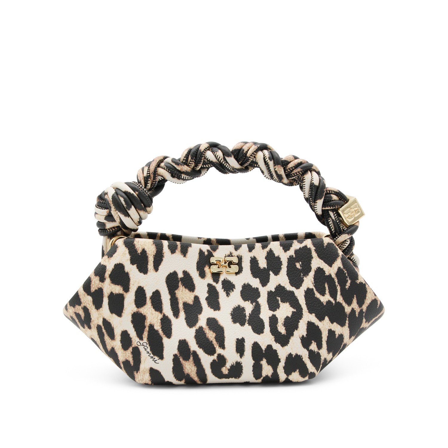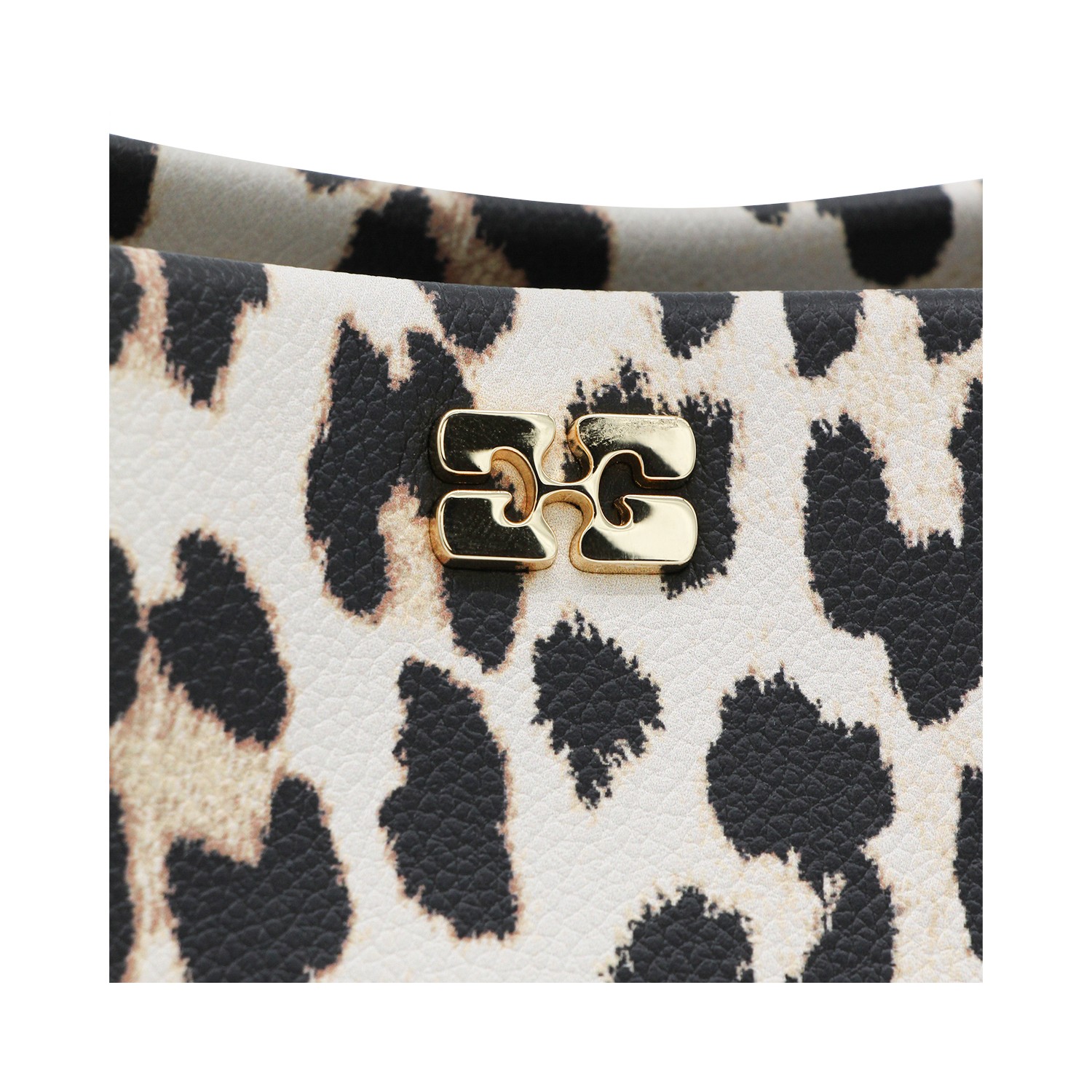 Leopard top handle bag from Ganni featuring top handle, main compartment, button fastening, removable strap and frontal logo.